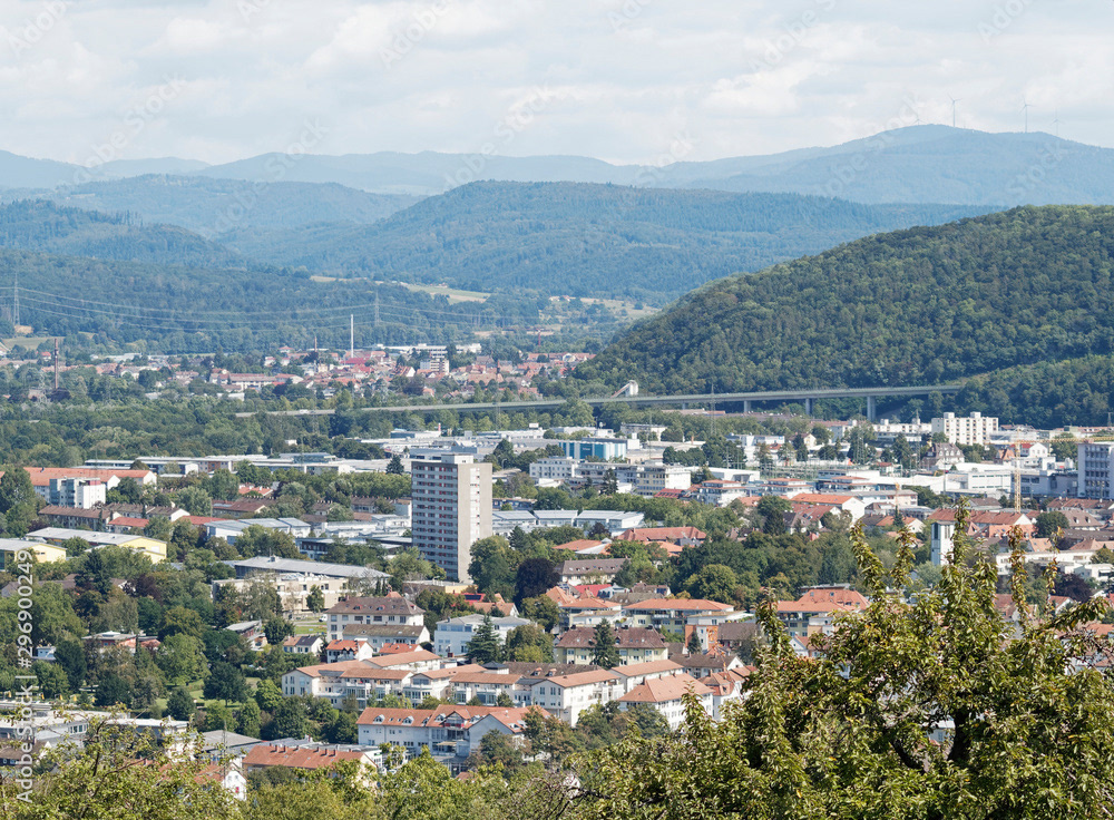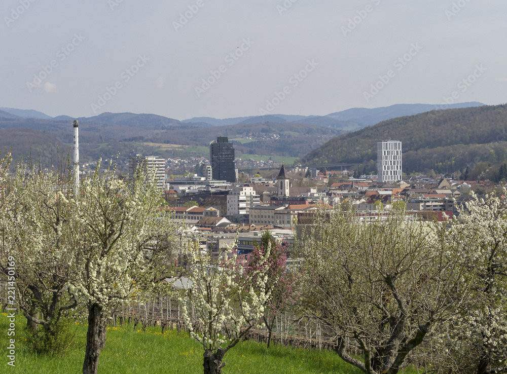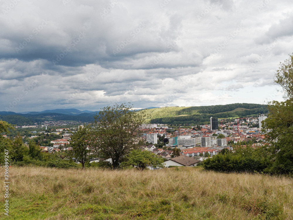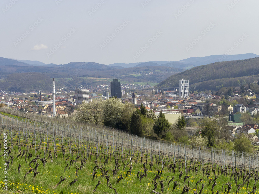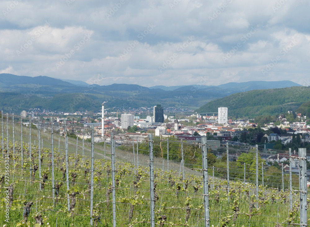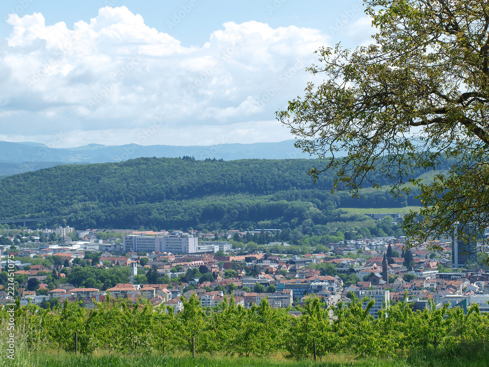 Lörrach, Hauptstadt des Markgräflerlandes, nahe des Dreiländereck Deutschland, Frankreich und Schweiz. Erstreckt sich südlich des Wiesentals umgeben von den Schwarzwaldbergen
