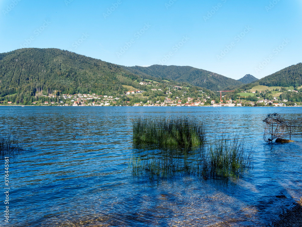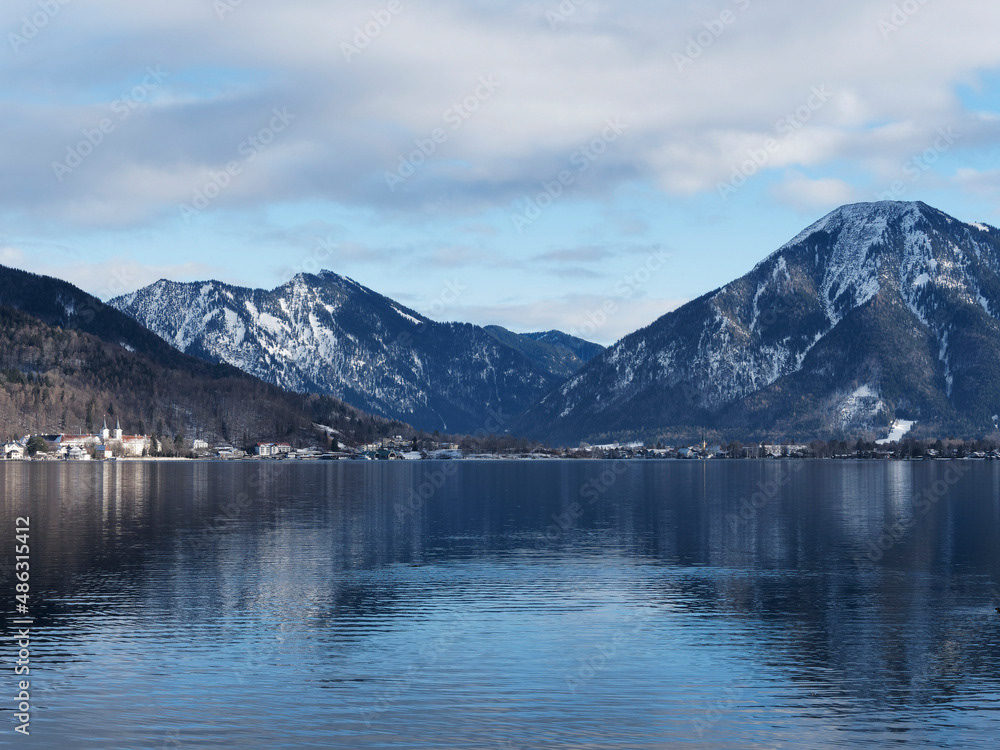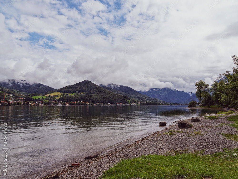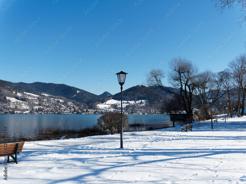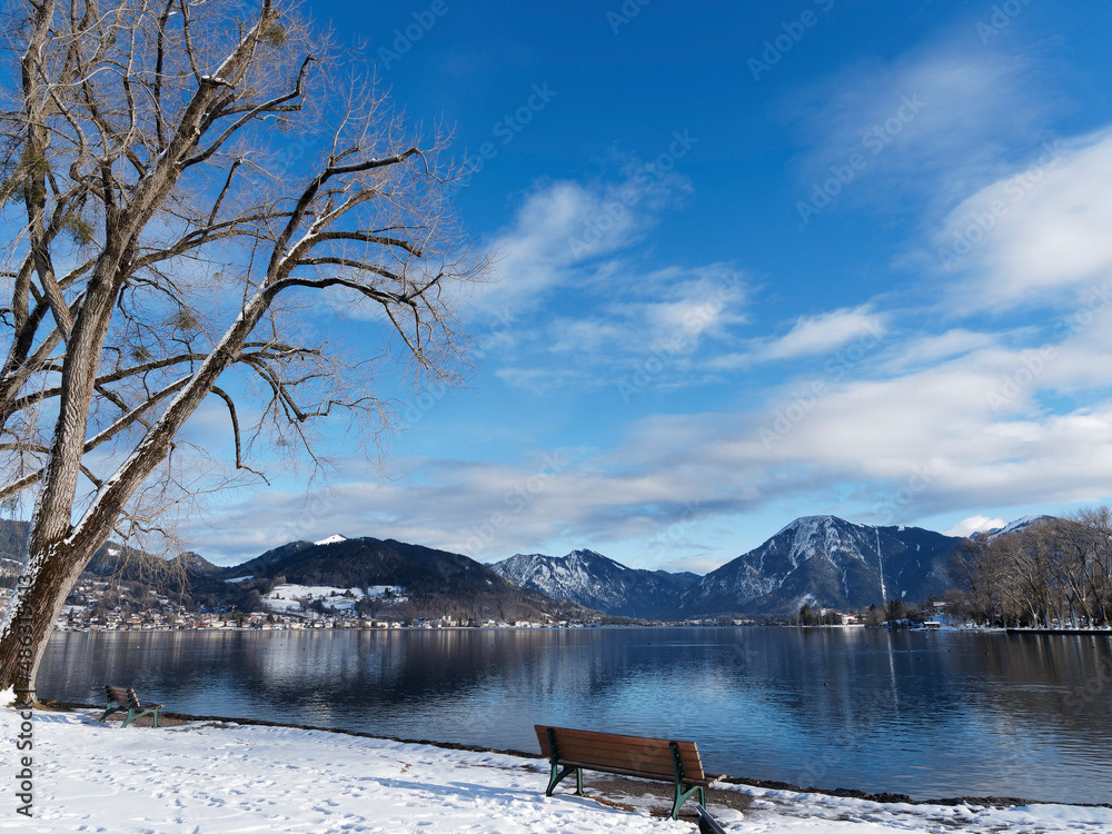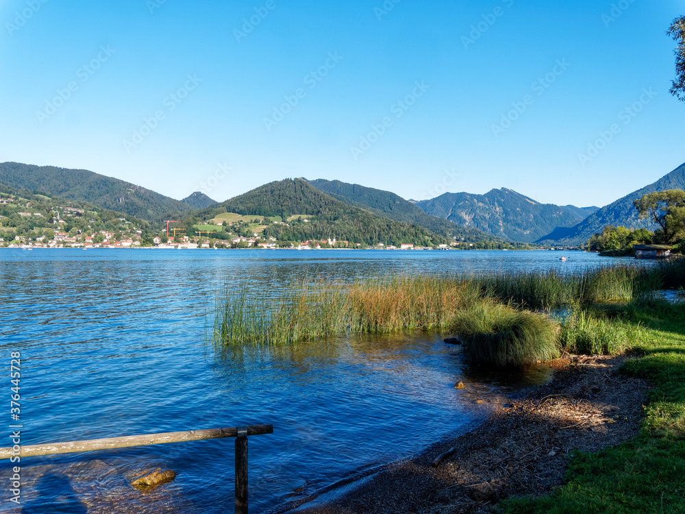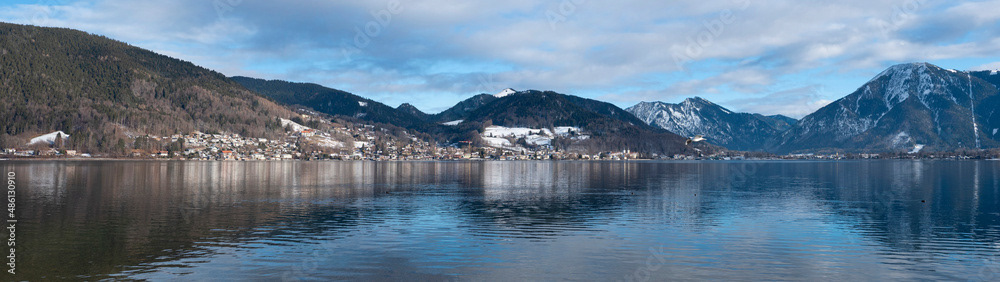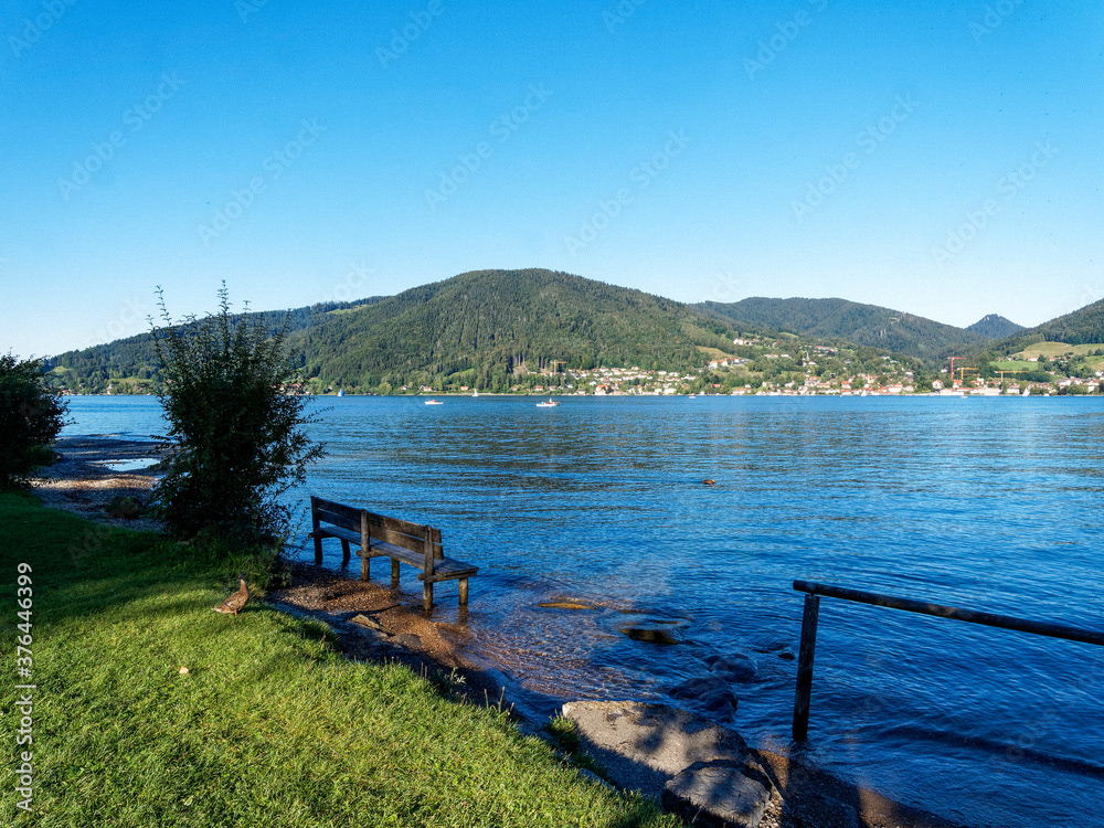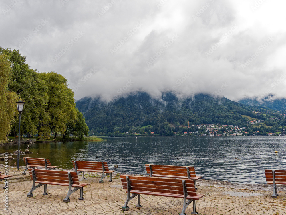 Bad Wiessee am Westufer des Tegernsees. Uferpromenade mit malerischen Ausblick über den See eingeramt von den majestätischen Bergen des Alpenvorlands