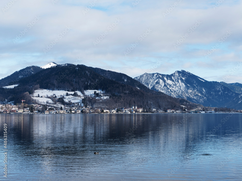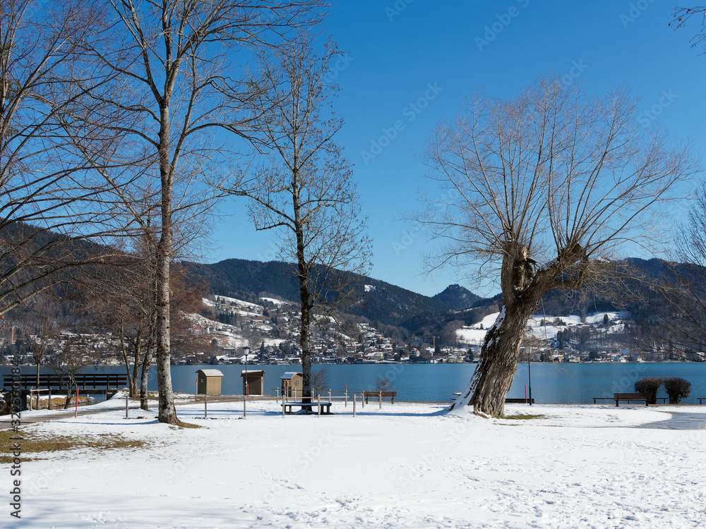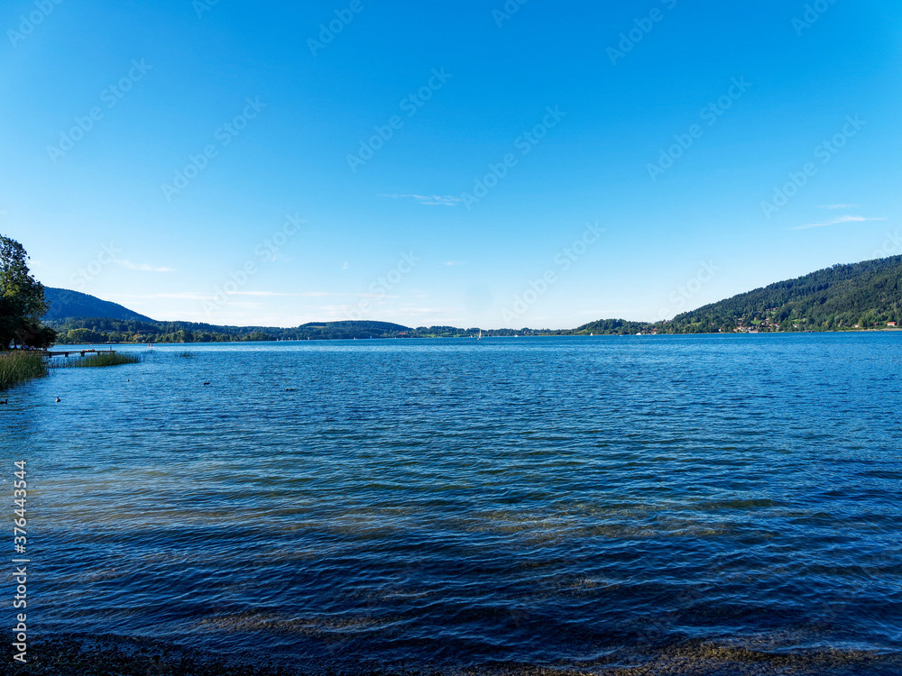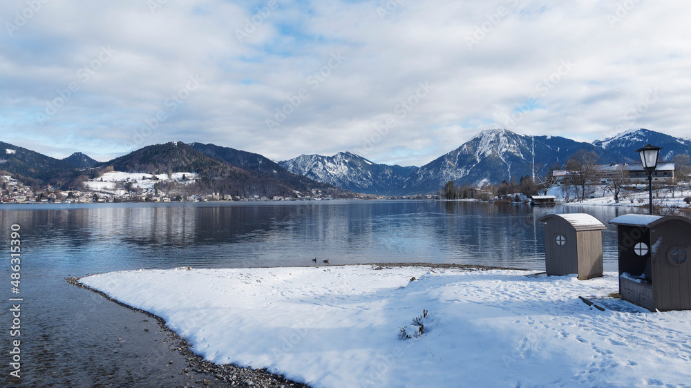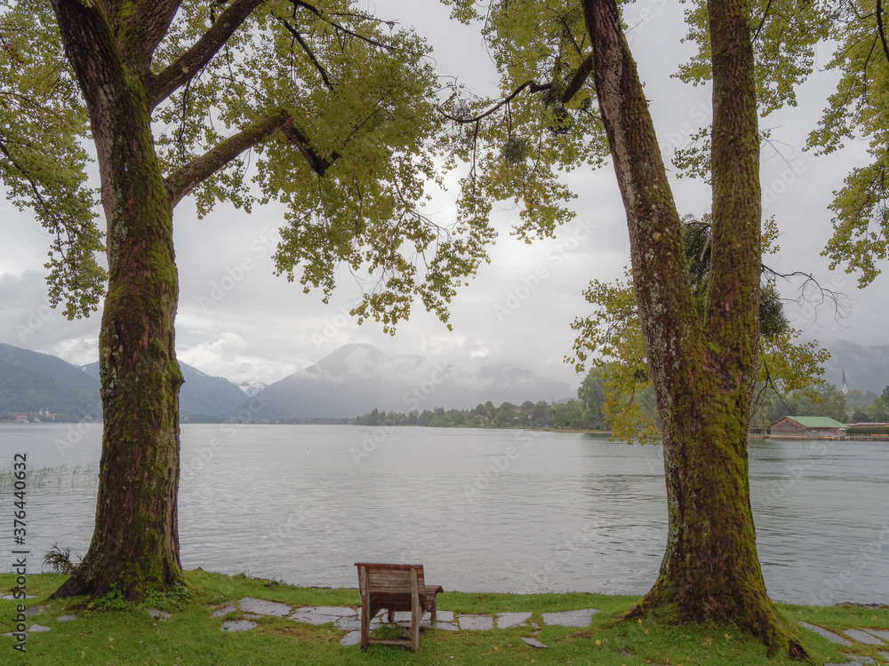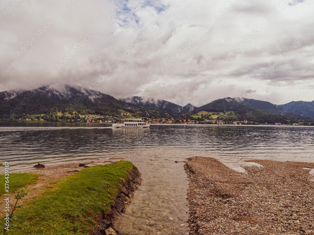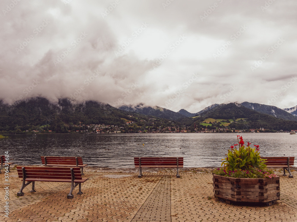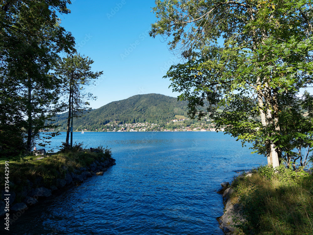 Bad Wiessee am Westufer des Tegernsees. Uferpromenade mit malerischen Ausblick über den See eingeramt von den majestätischen Bergen des Alpenvorlands