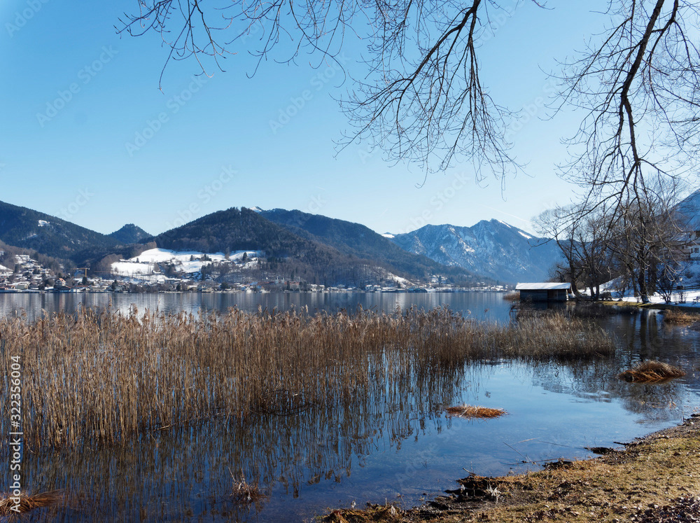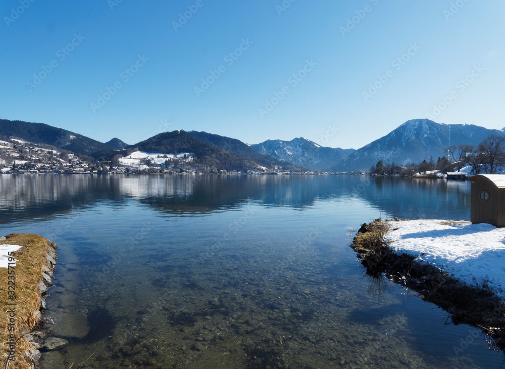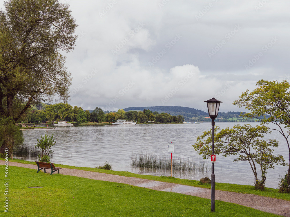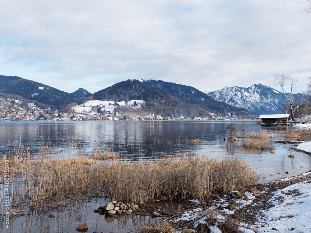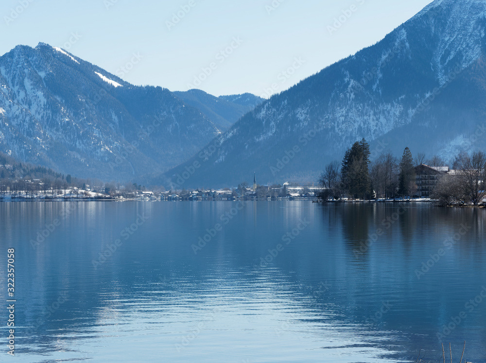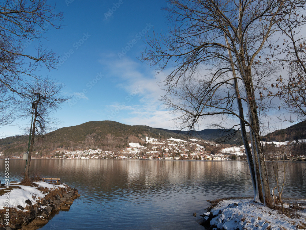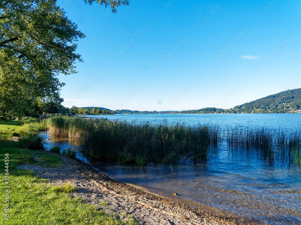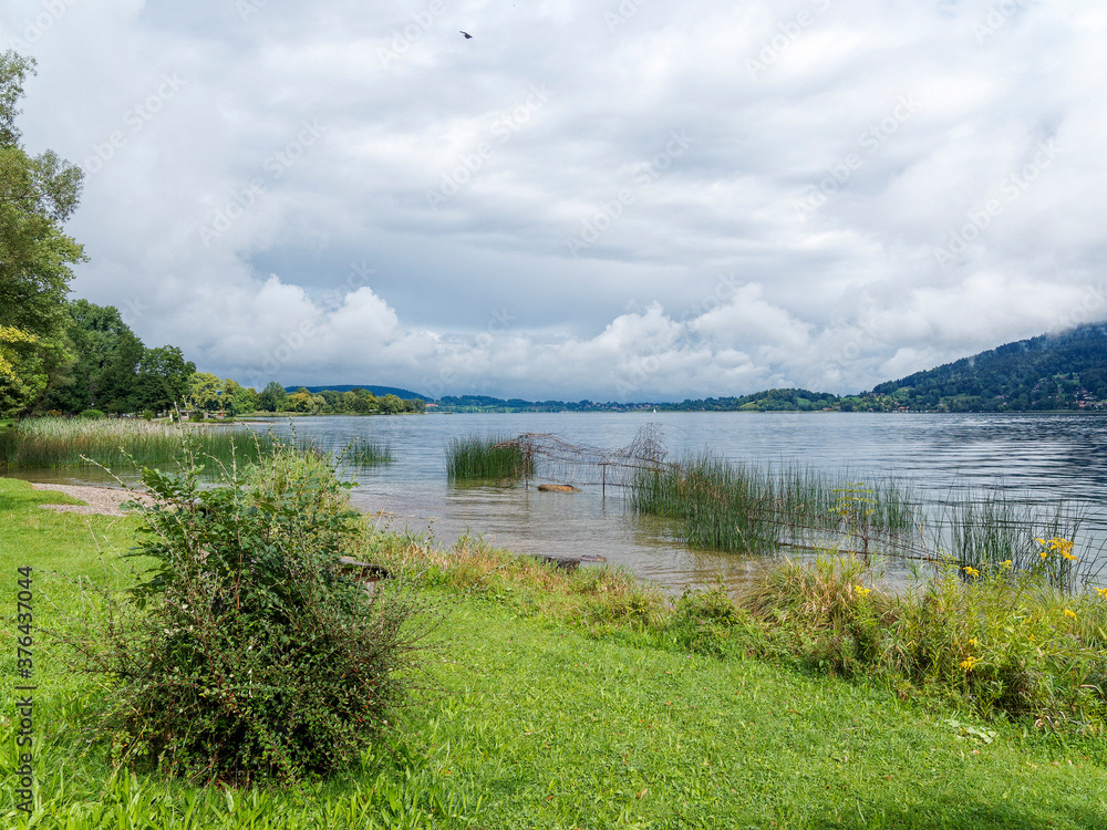 Bad Wiessee am Westufer des Tegernsees. Uferpromenade mit malerischen Ausblick über den See eingeramt von den majestätischen Bergen des Alpenvorlands