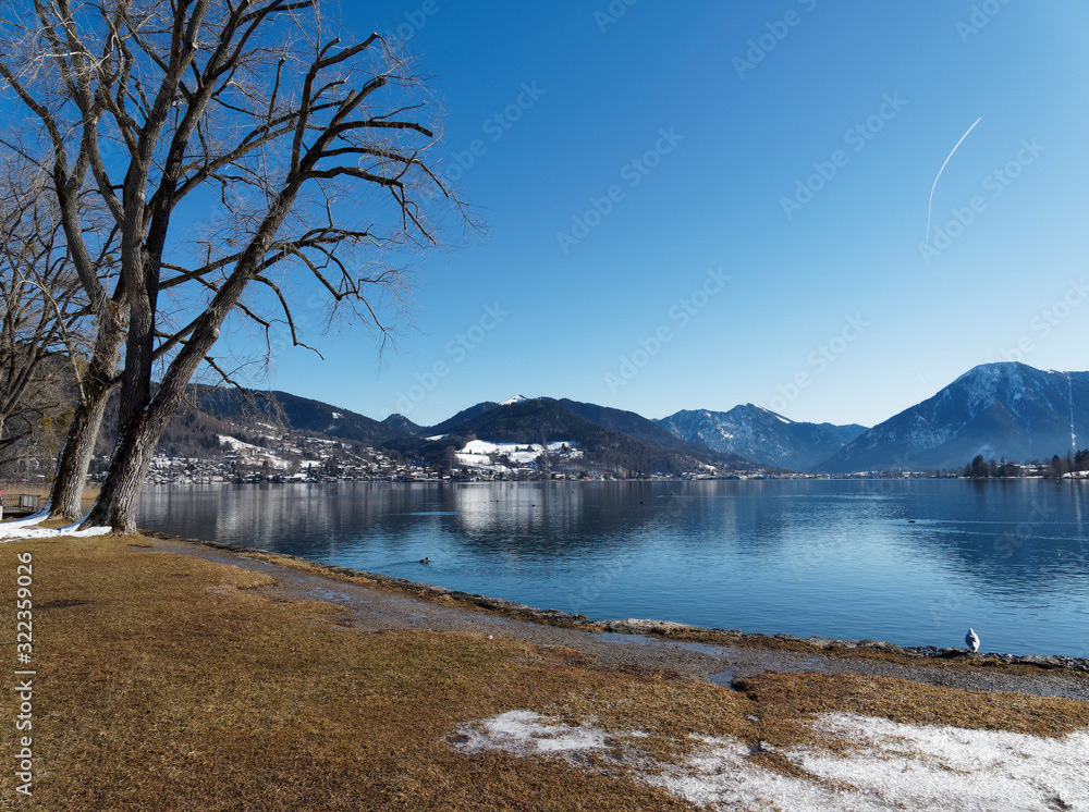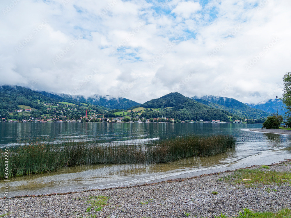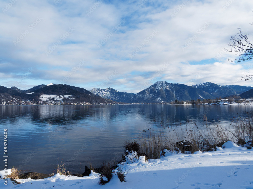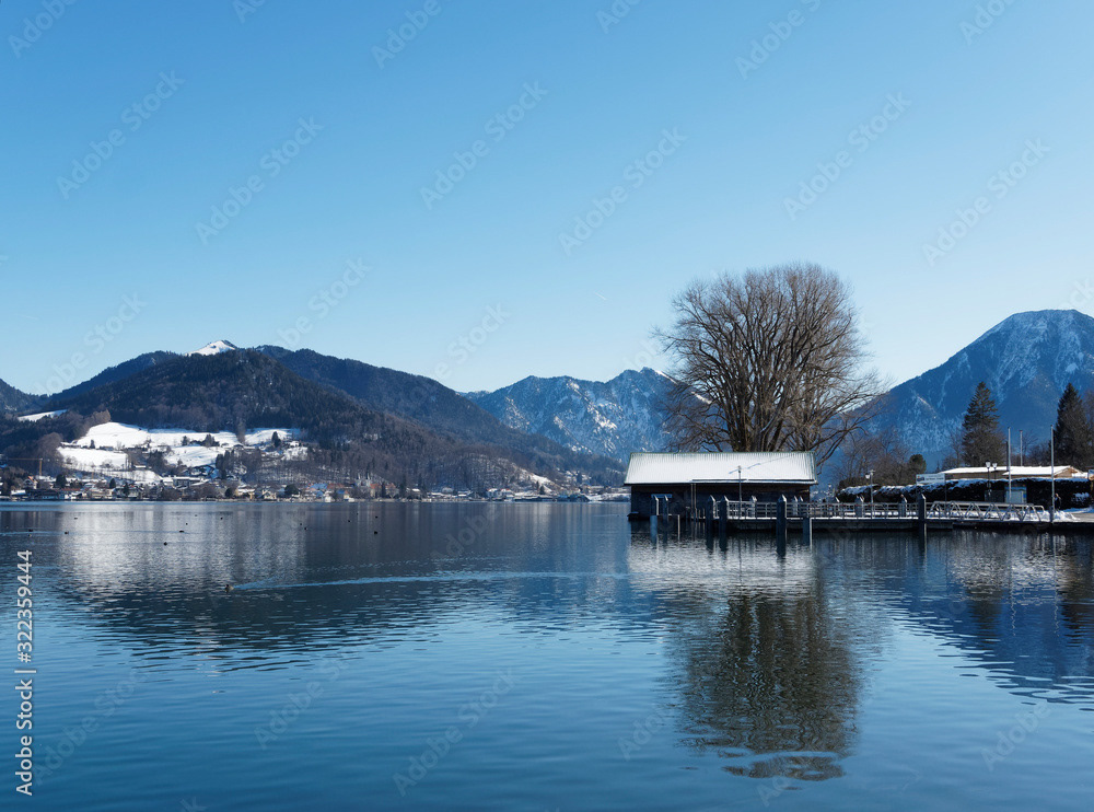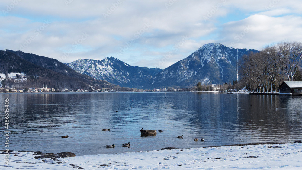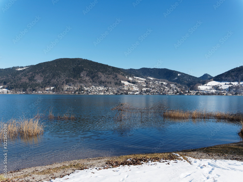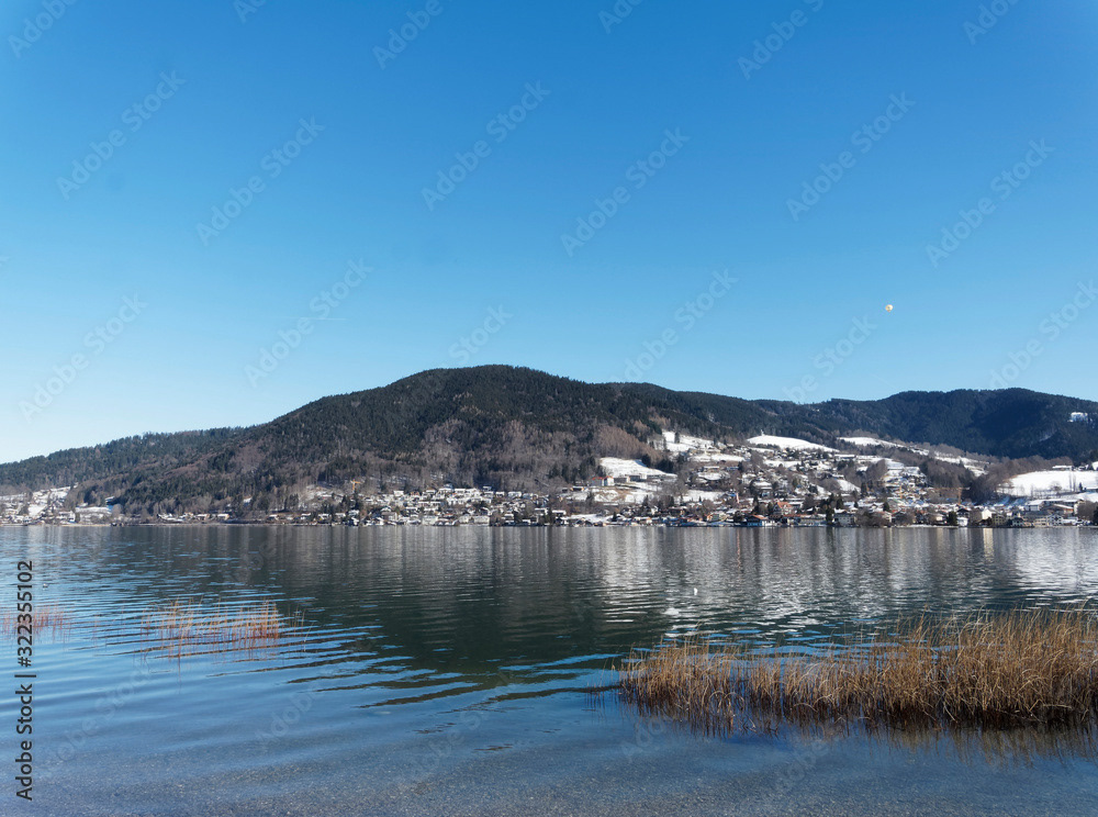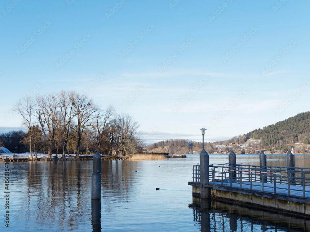 Bad Wiessee am Westufer des Tegernsees. Uferpromenade mit malerischen Ausblick über den See eingeramt von den majestätischen Bergen des Alpenvorlands