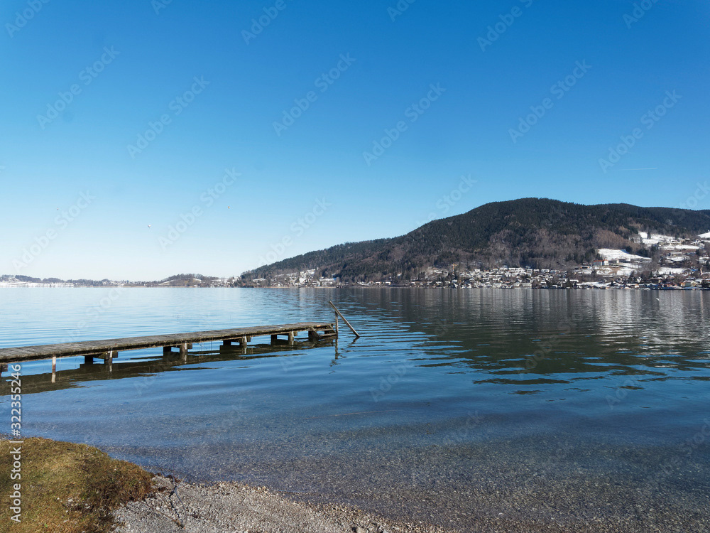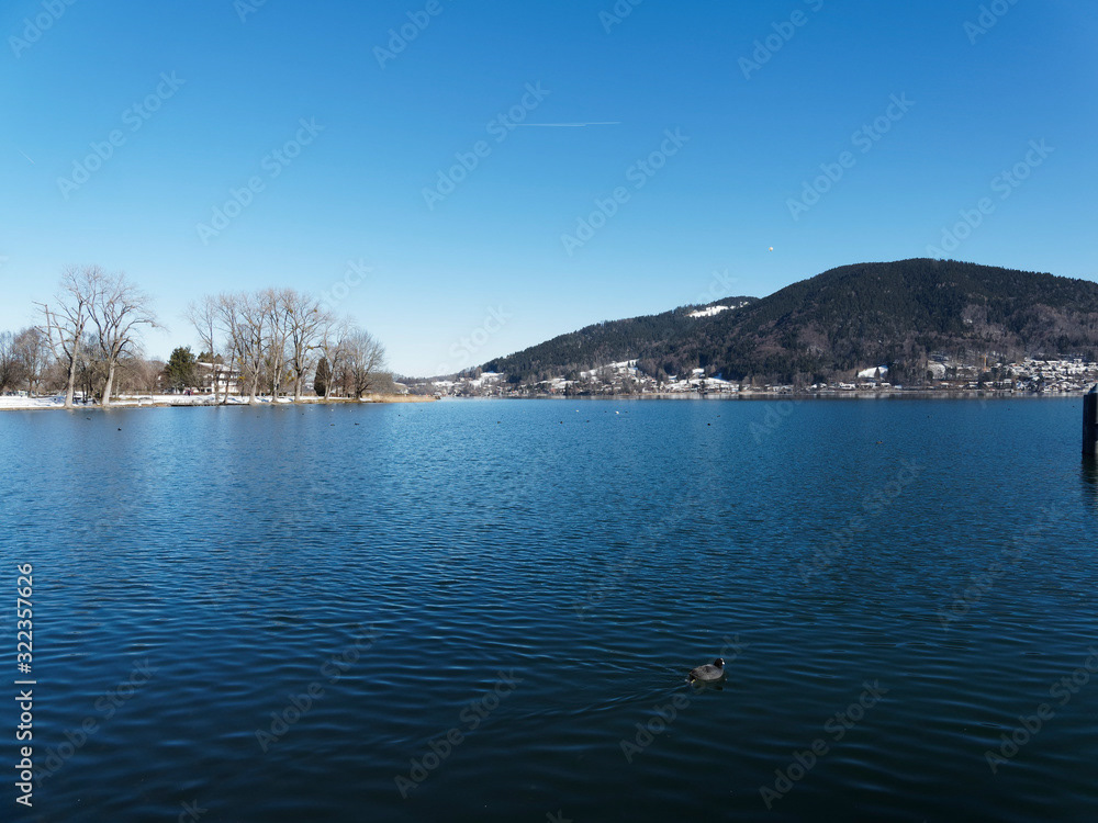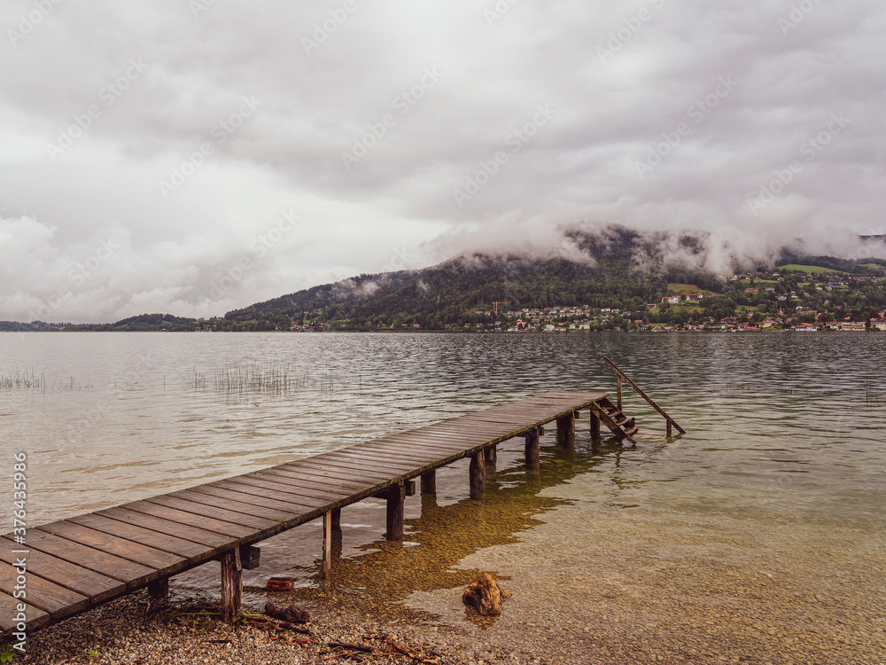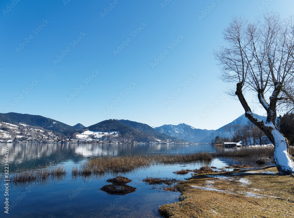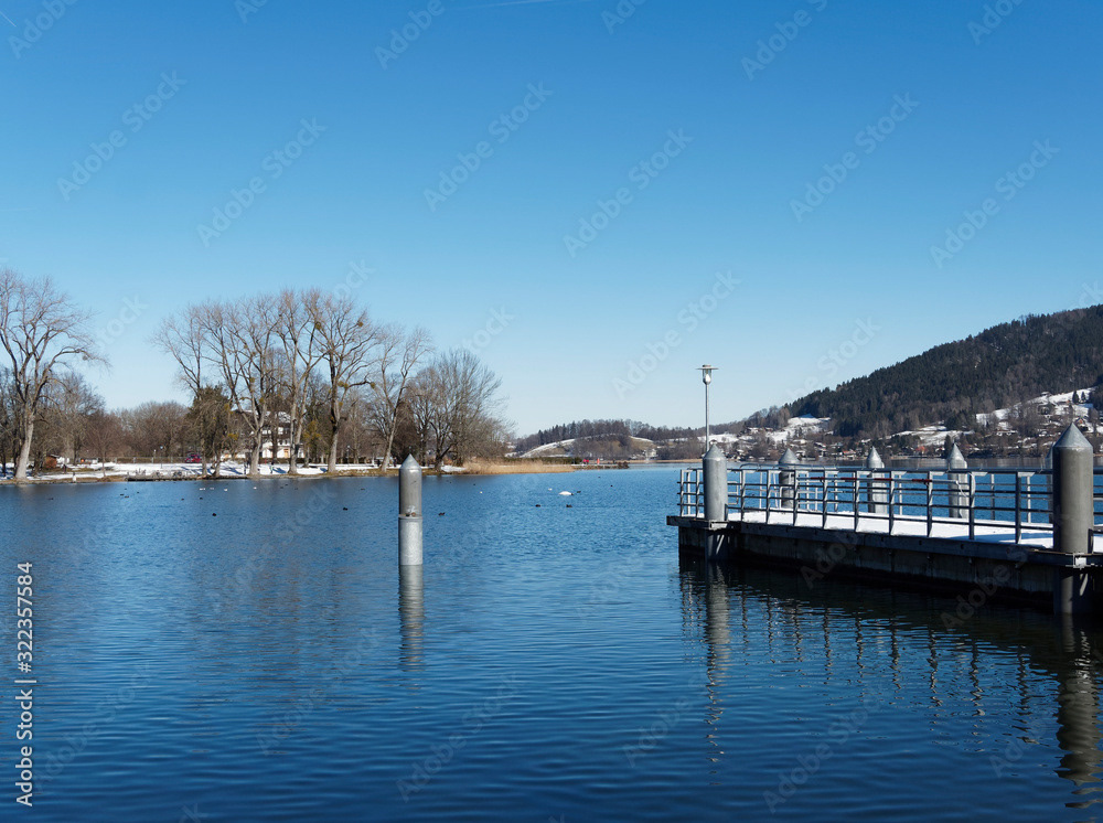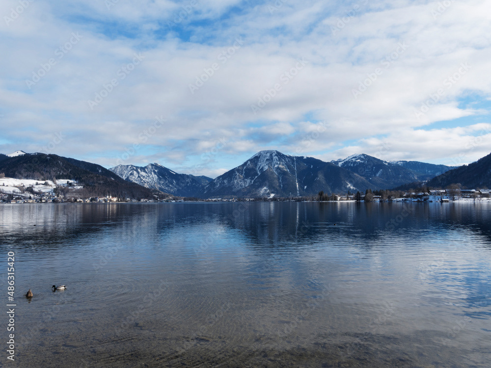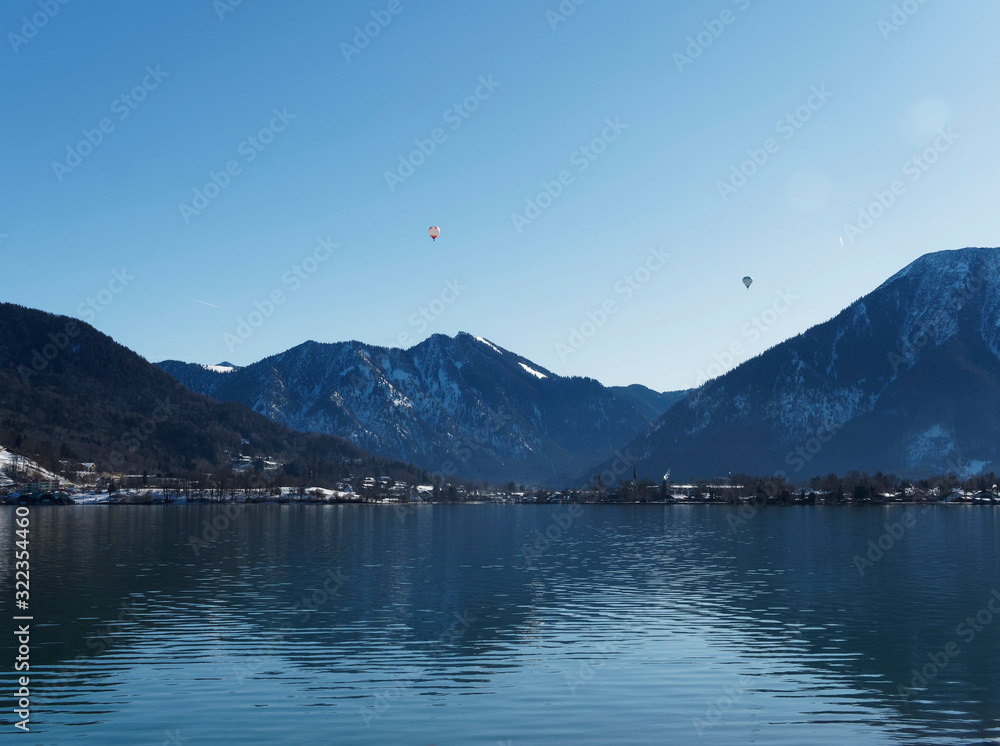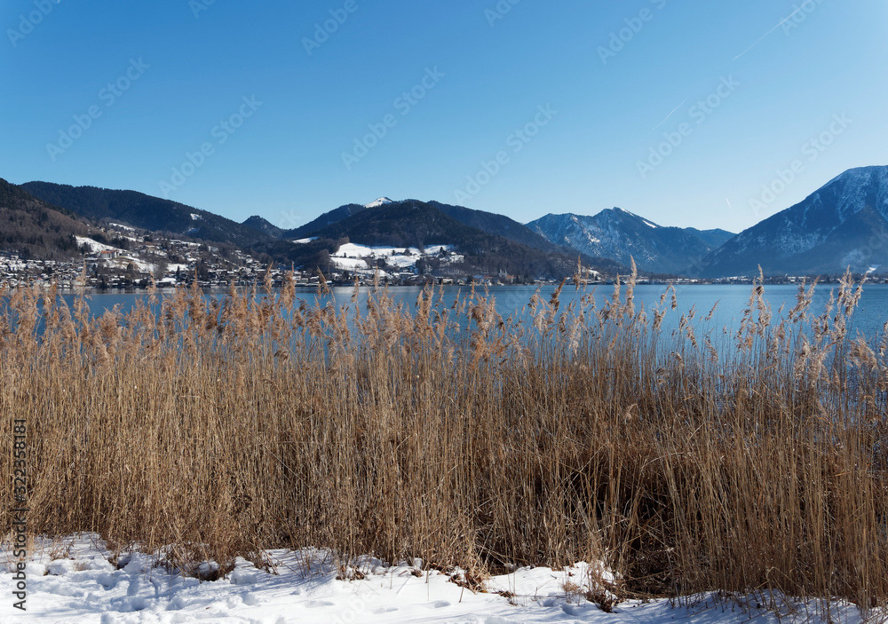 Bad Wiessee am Westufer des Tegernsees. Uferpromenade mit malerischen Ausblick über den See eingeramt von den majestätischen Bergen des Alpenvorlands