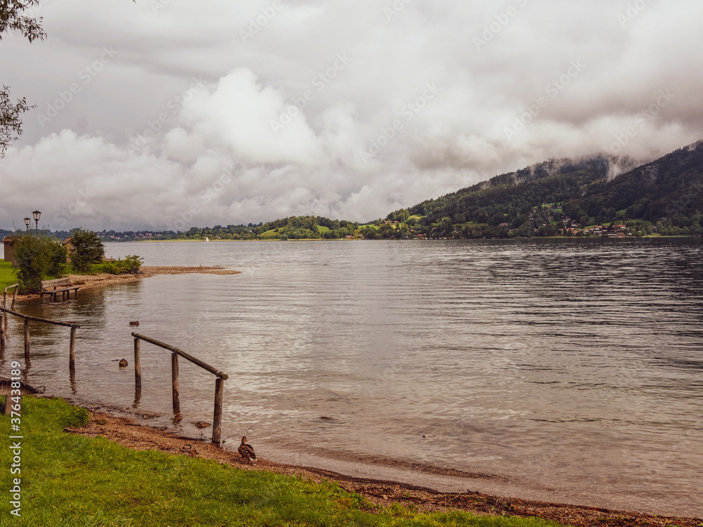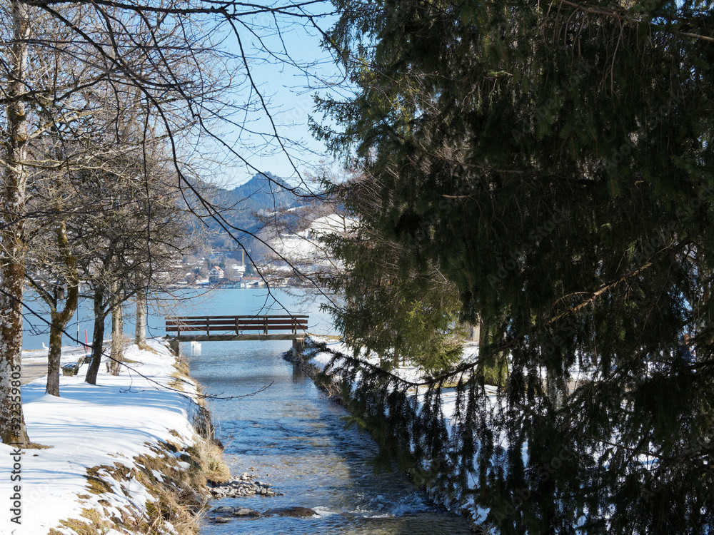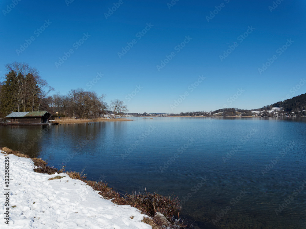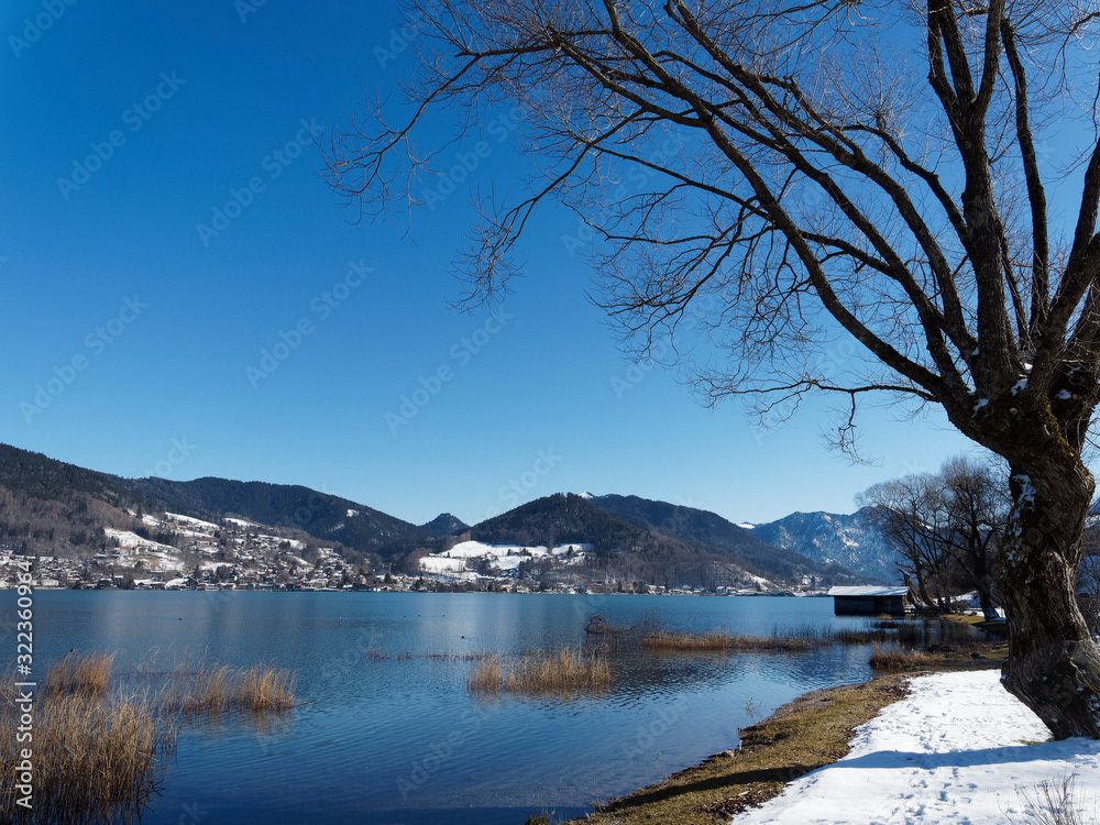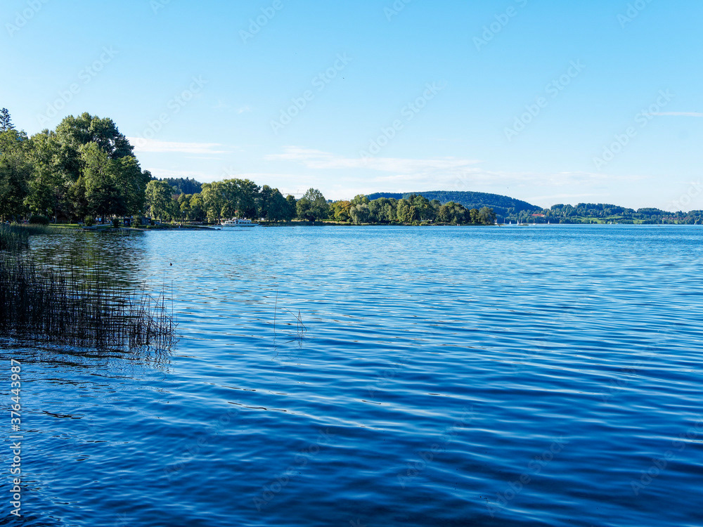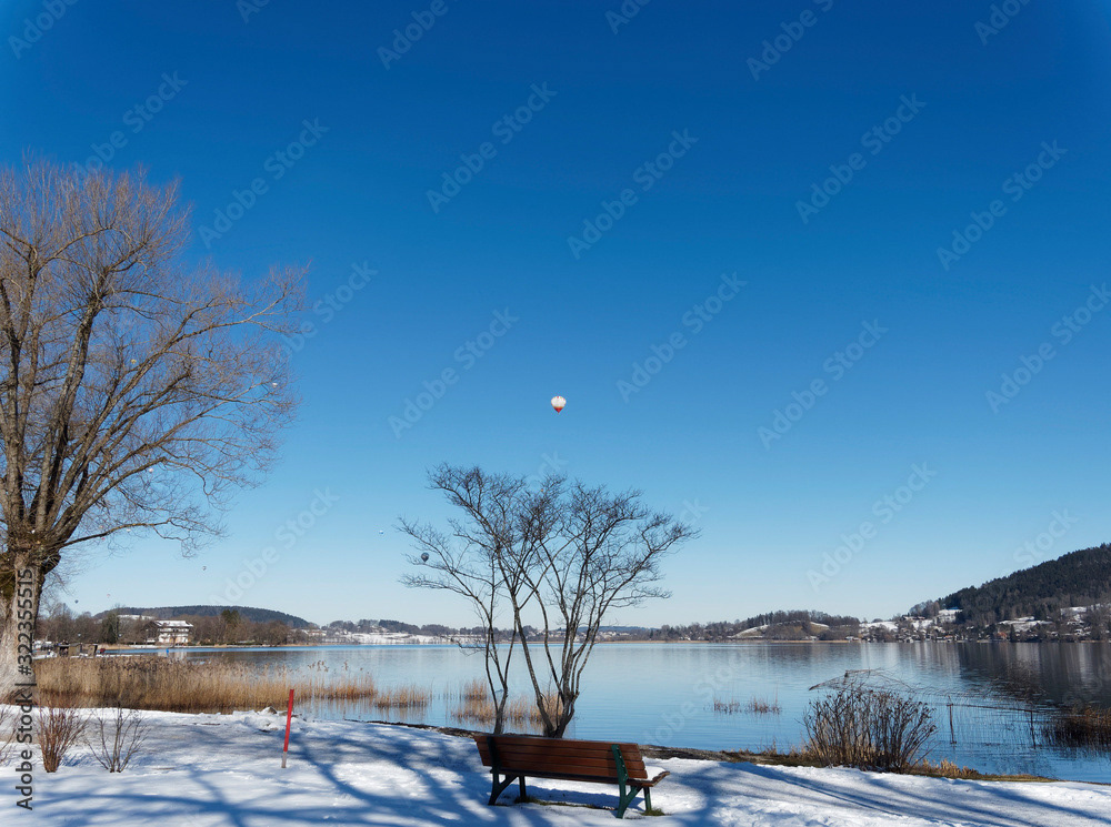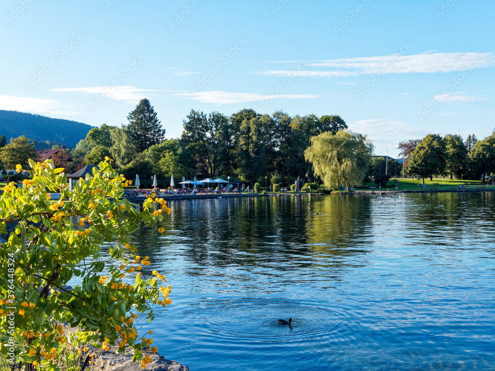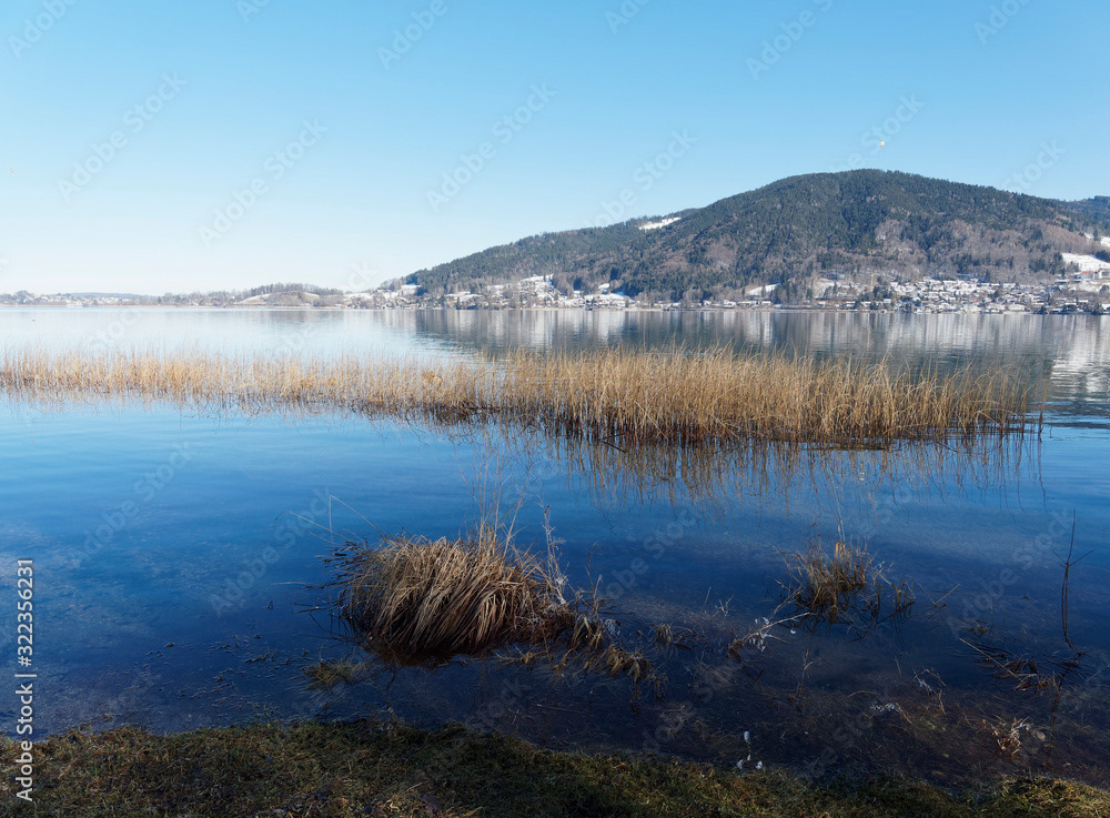 Bad Wiessee am Westufer des Tegernsees. Uferpromenade mit malerischen Ausblick über den See eingeramt von den majestätischen Bergen des Alpenvorlands
