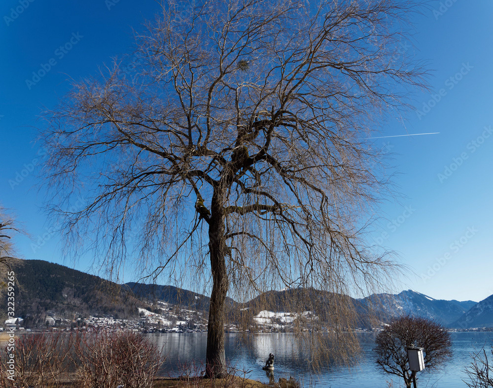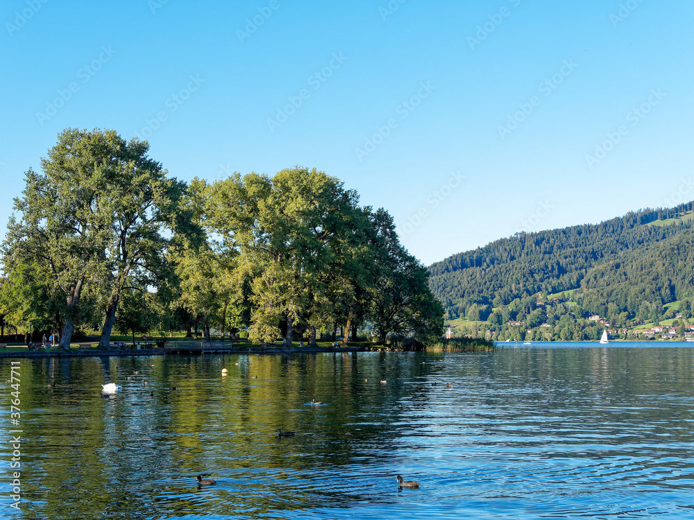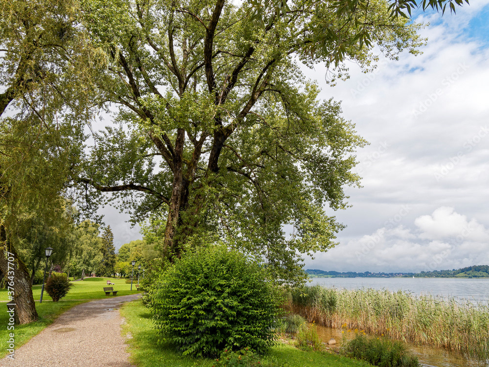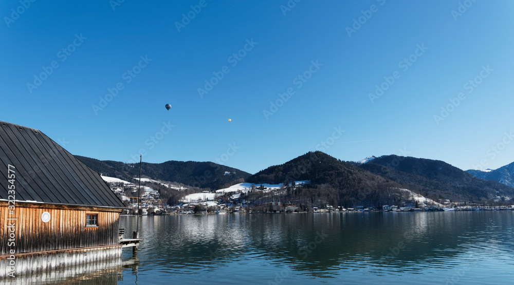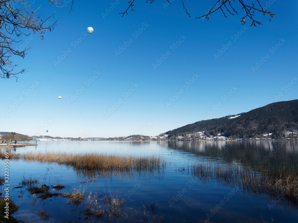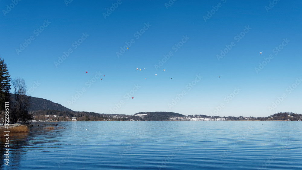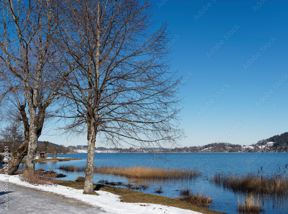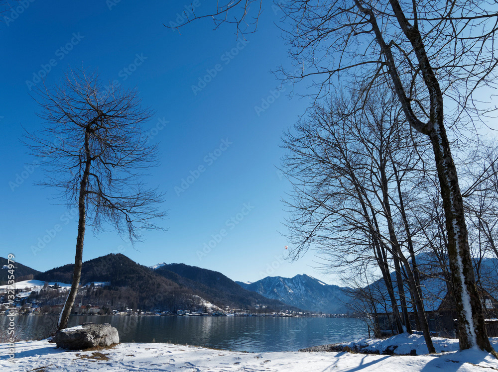 Bad Wiessee am Westufer des Tegernsees. Uferpromenade mit malerischen Ausblick über den See eingeramt von den majestätischen Bergen des Alpenvorlands