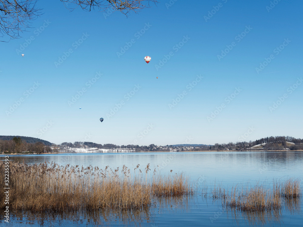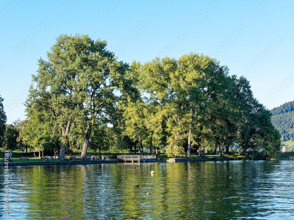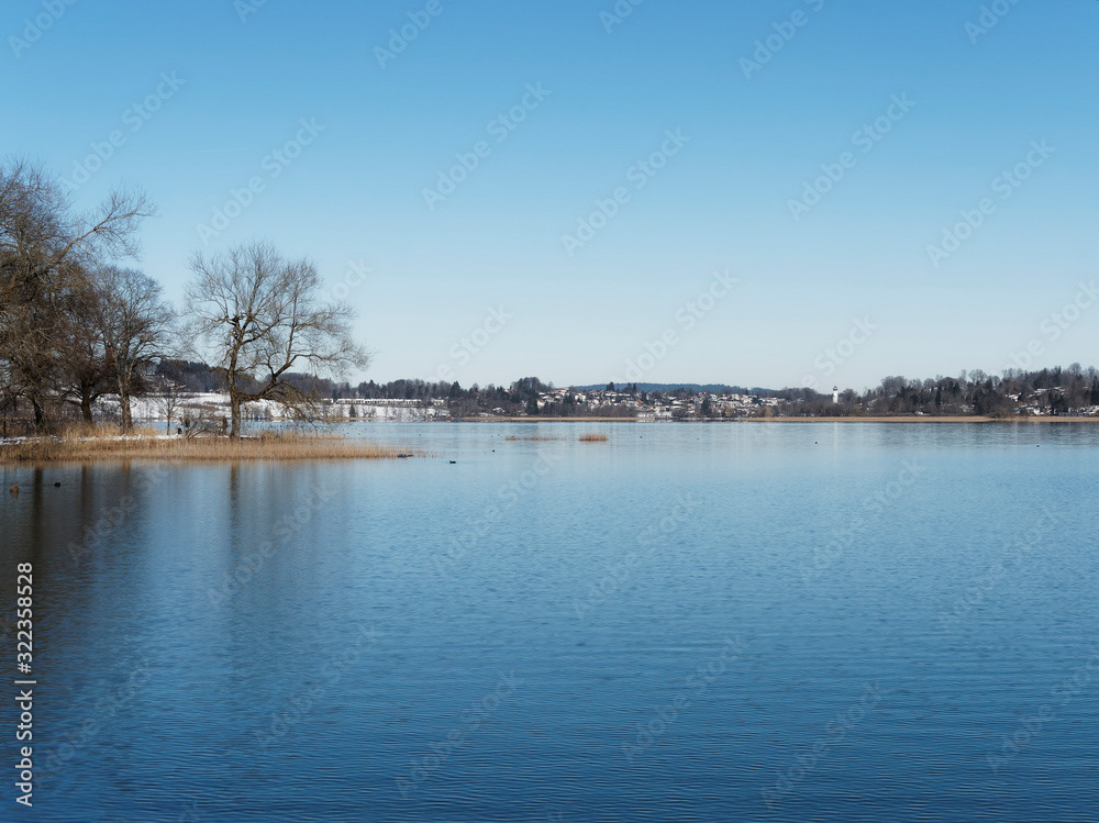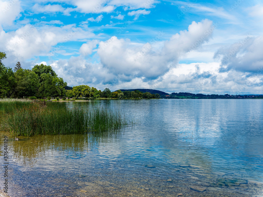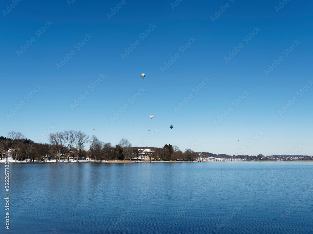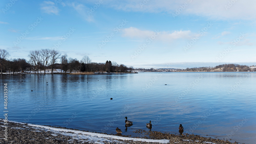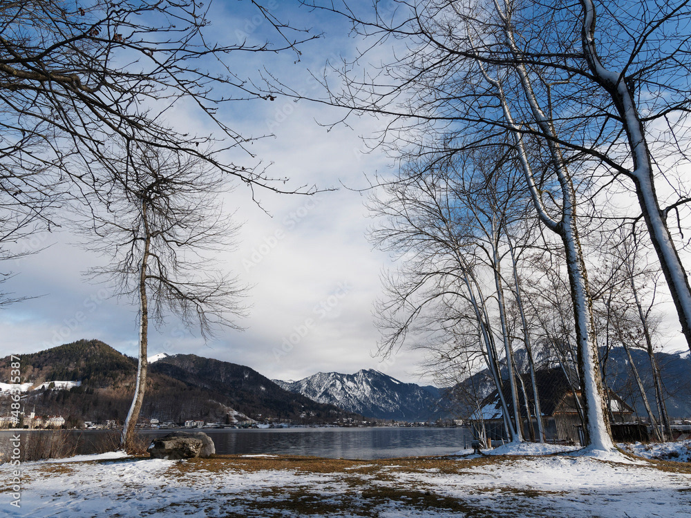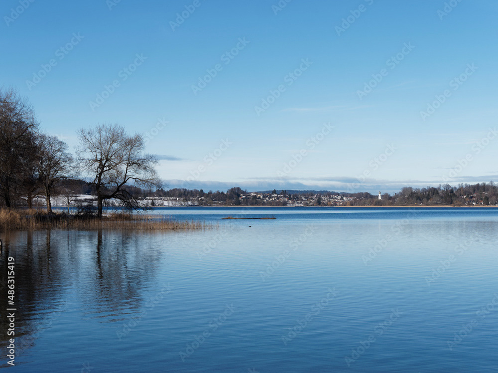 Bad Wiessee am Westufer des Tegernsees. Uferpromenade mit malerischen Ausblick über den See eingeramt von den majestätischen Bergen des Alpenvorlands