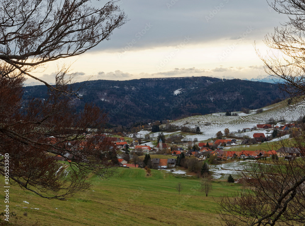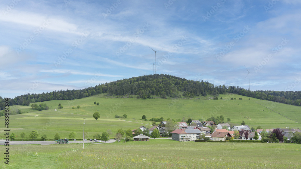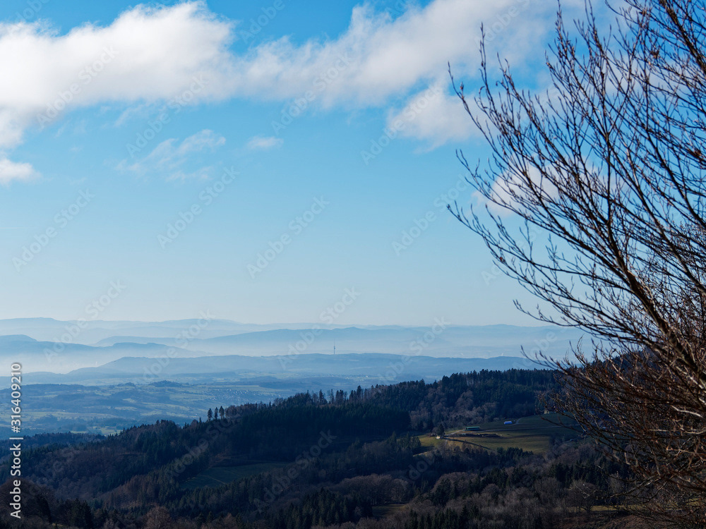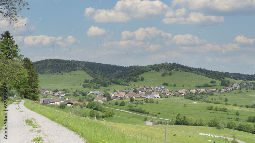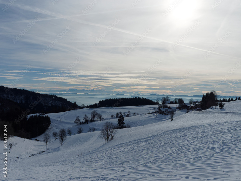 Ein hochgelegenes Dorf bei Schopfheim mit dem Weiler Todtmoos-Au am Fuße des Rohrenkopfes mit Blick auf Schlechbach, die Hohe Möhr, die Schweizer Alpen, den Jura zum Rheinebene