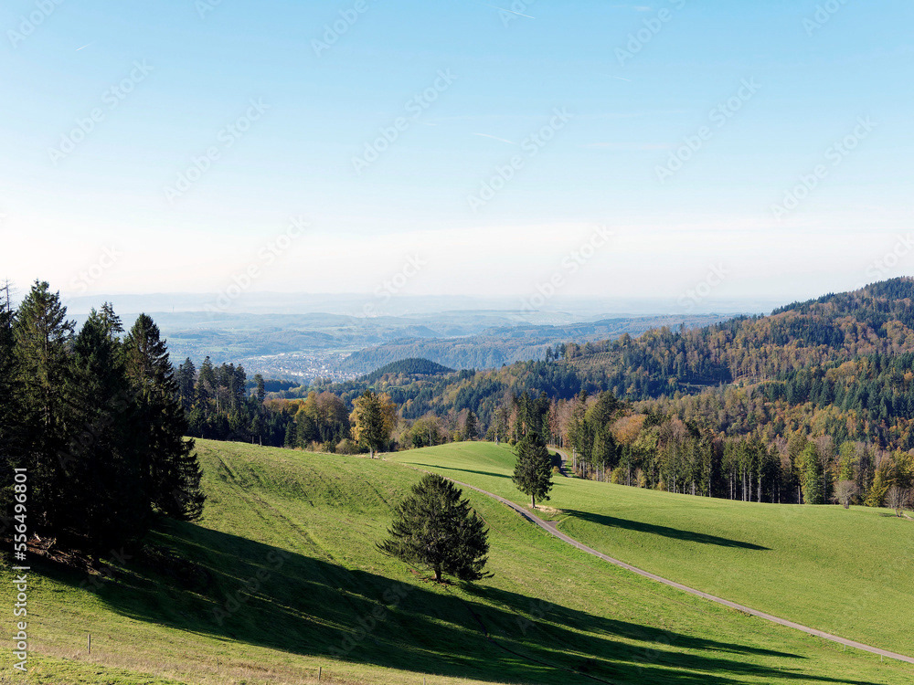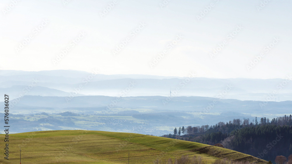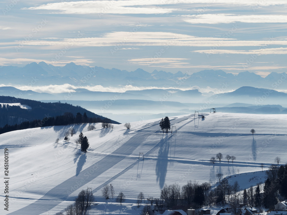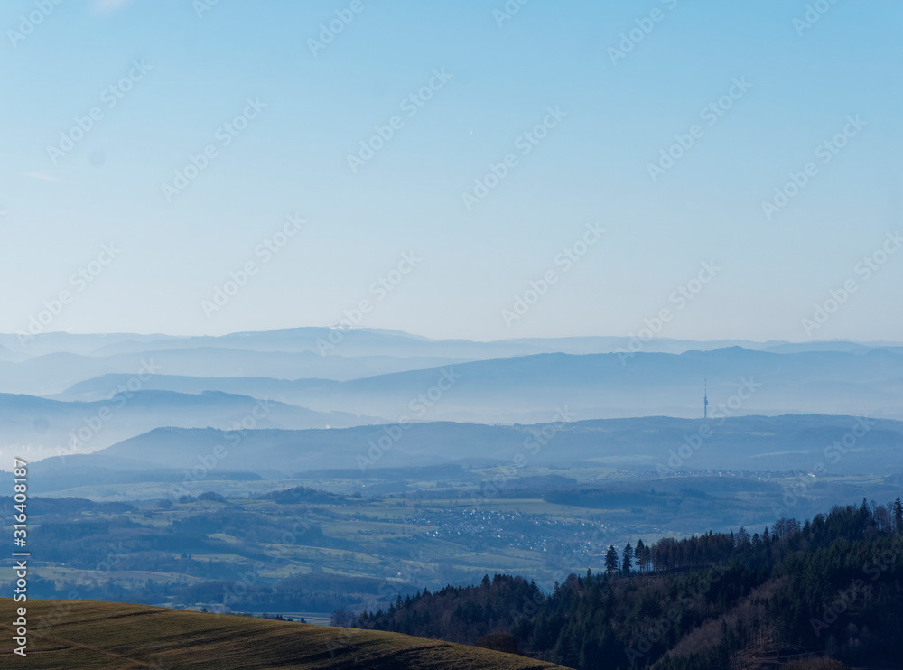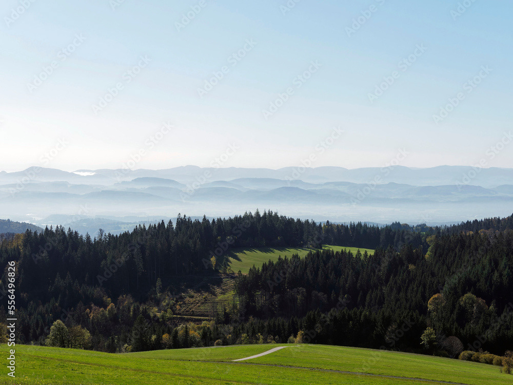 Ein hochgelegenes Dorf bei Schopfheim mit dem Weiler Todtmoos-Au am Fuße des Rohrenkopfes mit Blick auf Schlechbach, die Hohe Möhr, die Schweizer Alpen, den Jura zum Rheinebene