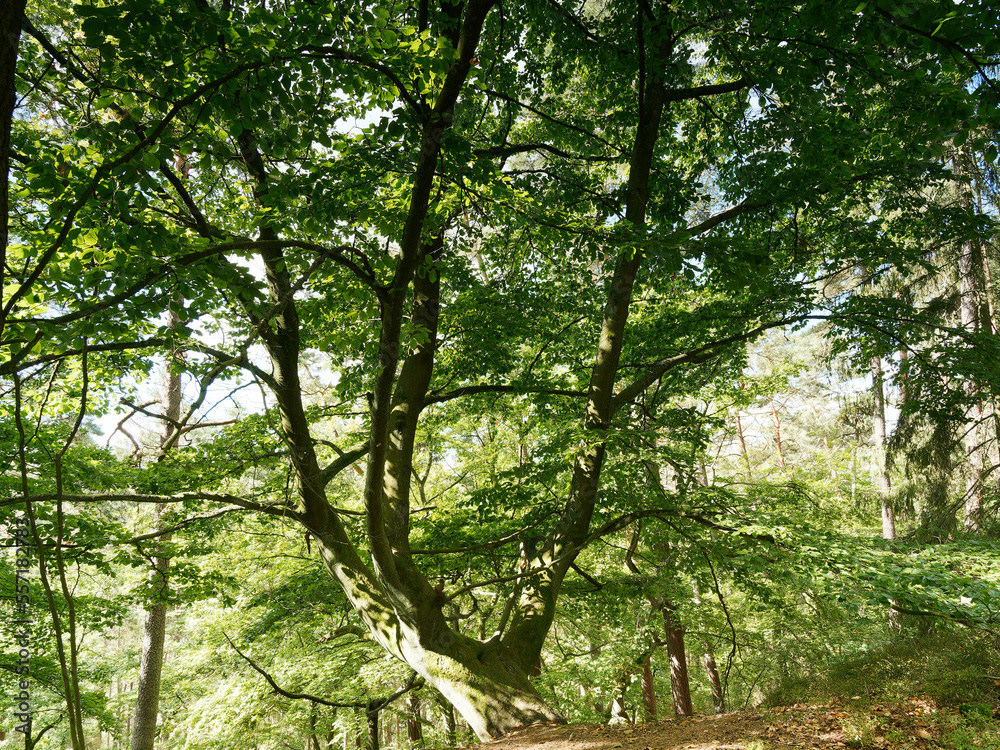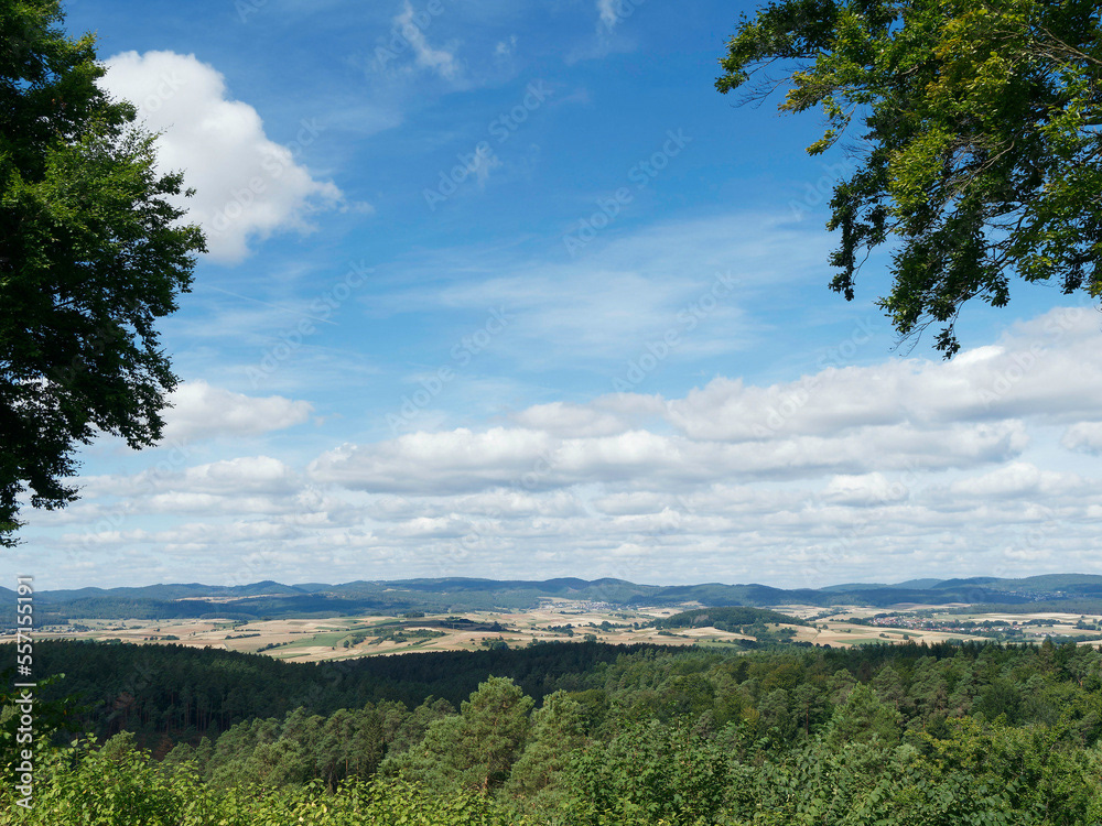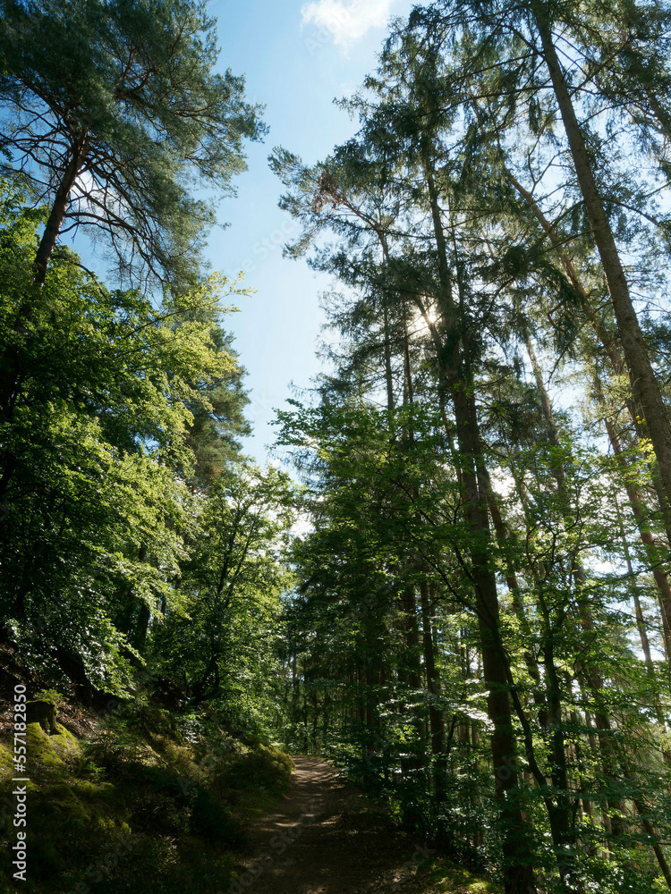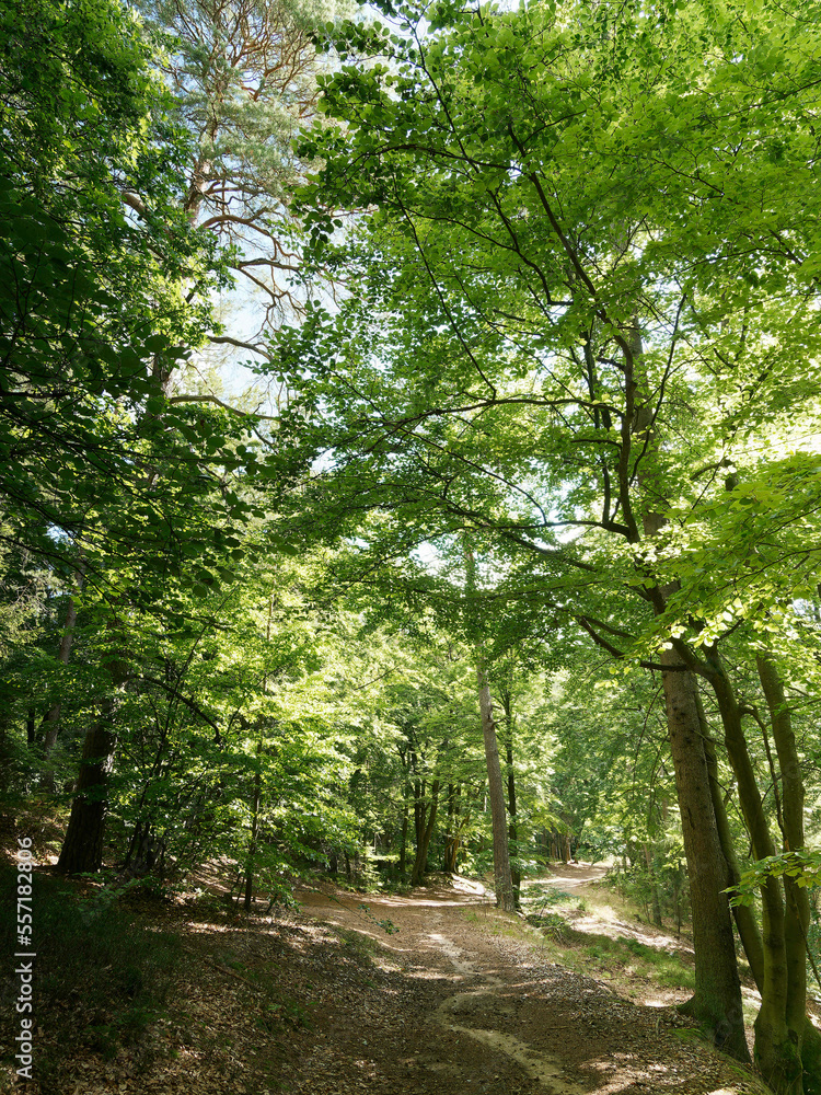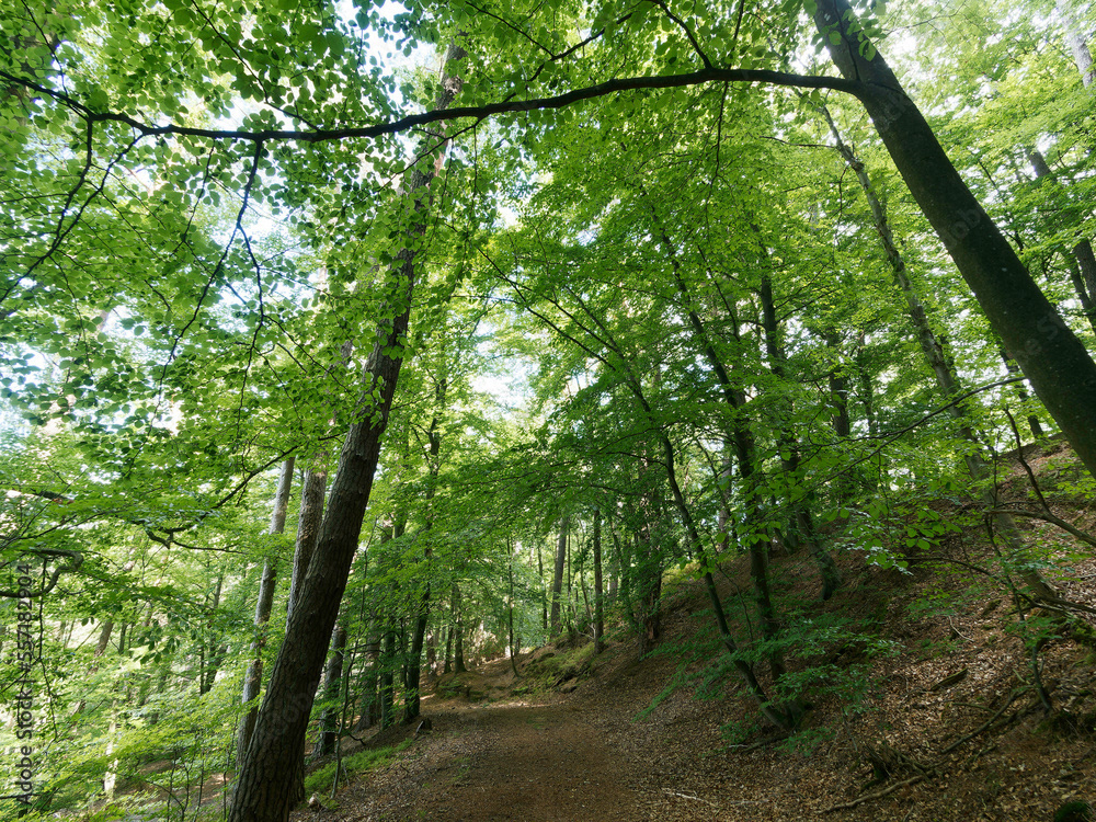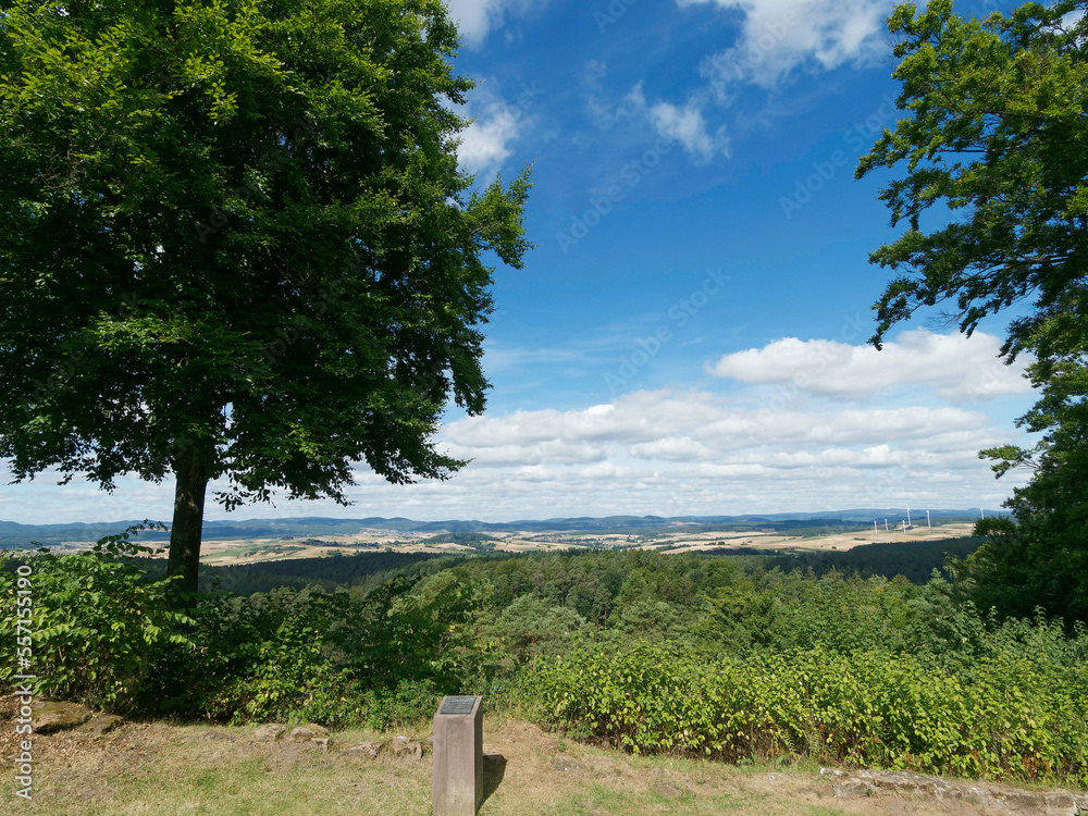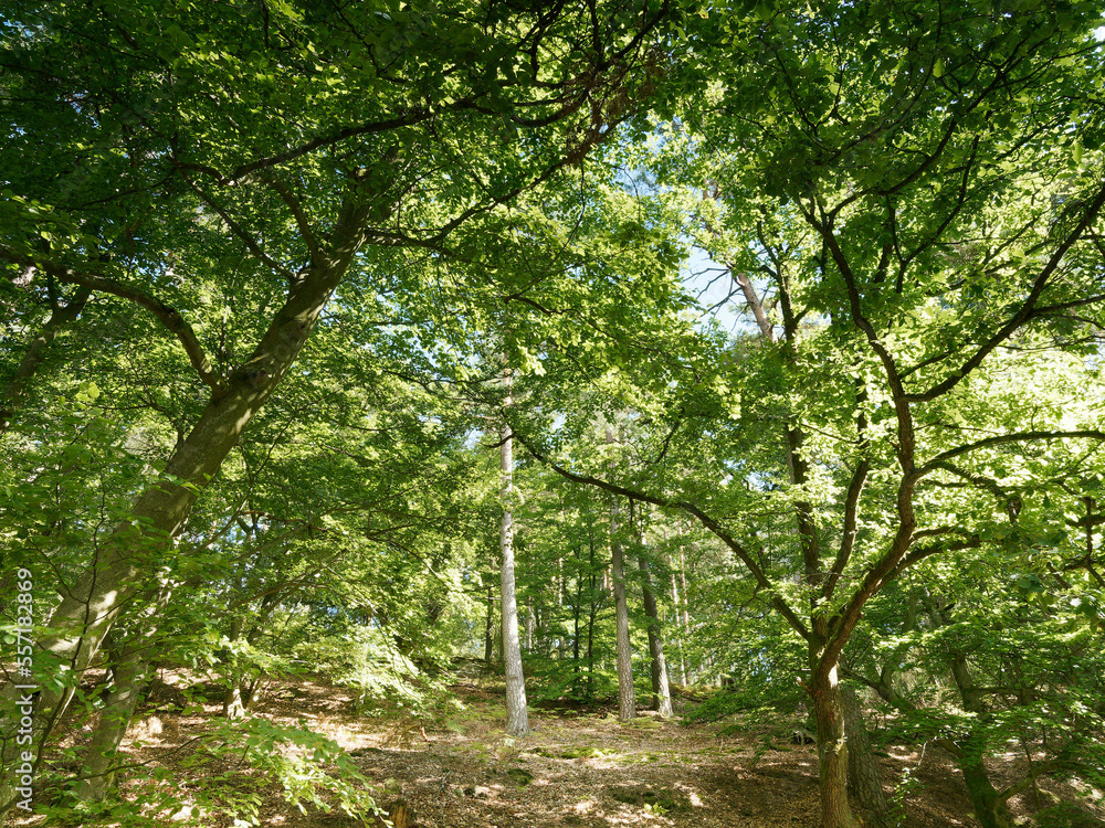 Hessische Waldlandschaft vom Bergsporn des Christenbergs durch wunderschönen mystischer Wald mit Forstwegen gesäumt von riesige Buchen, Eichen und Waldkiefern