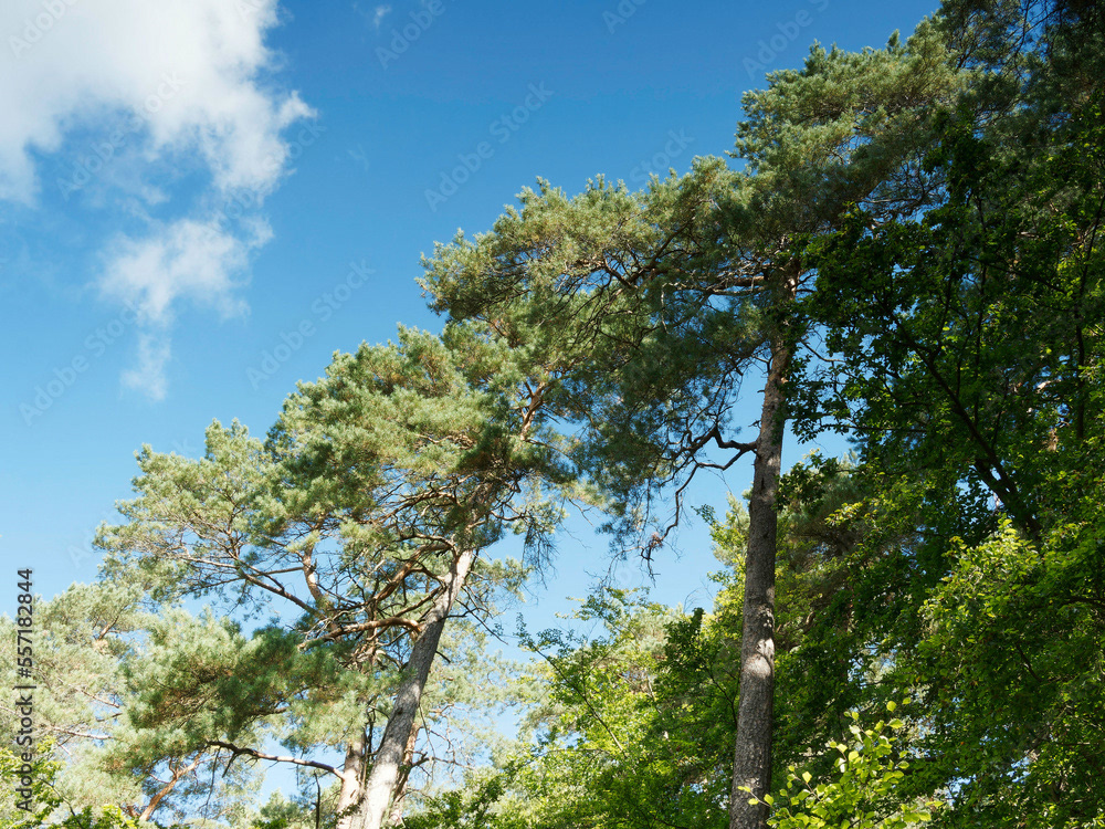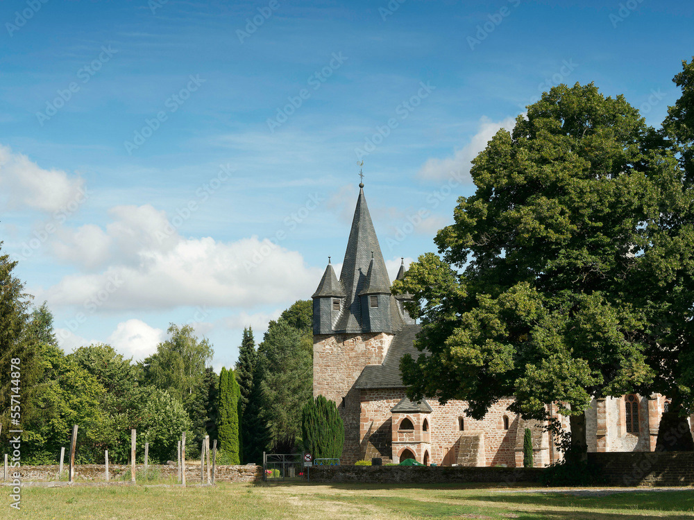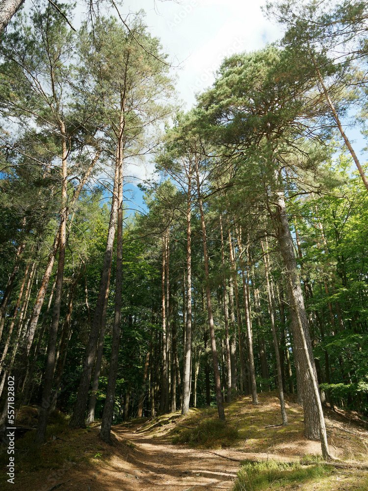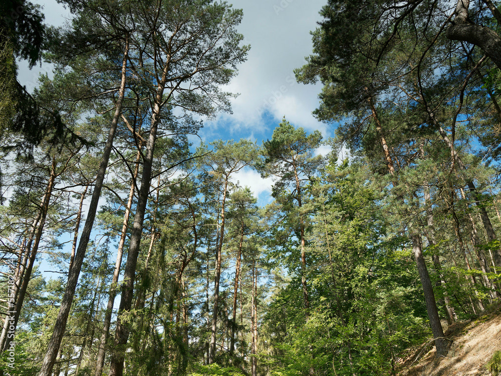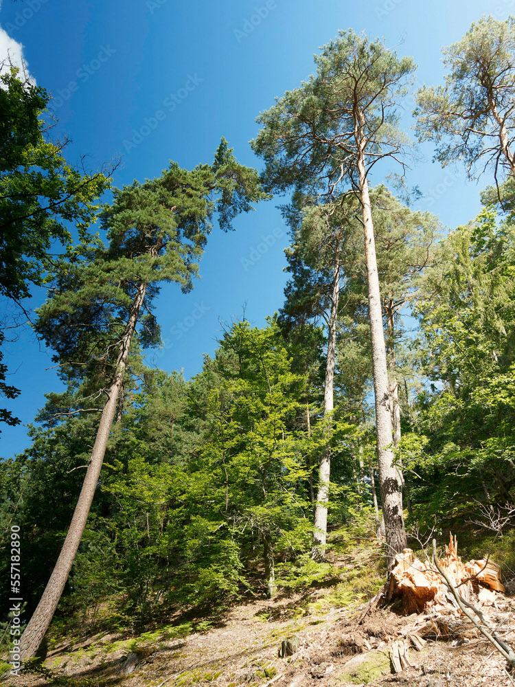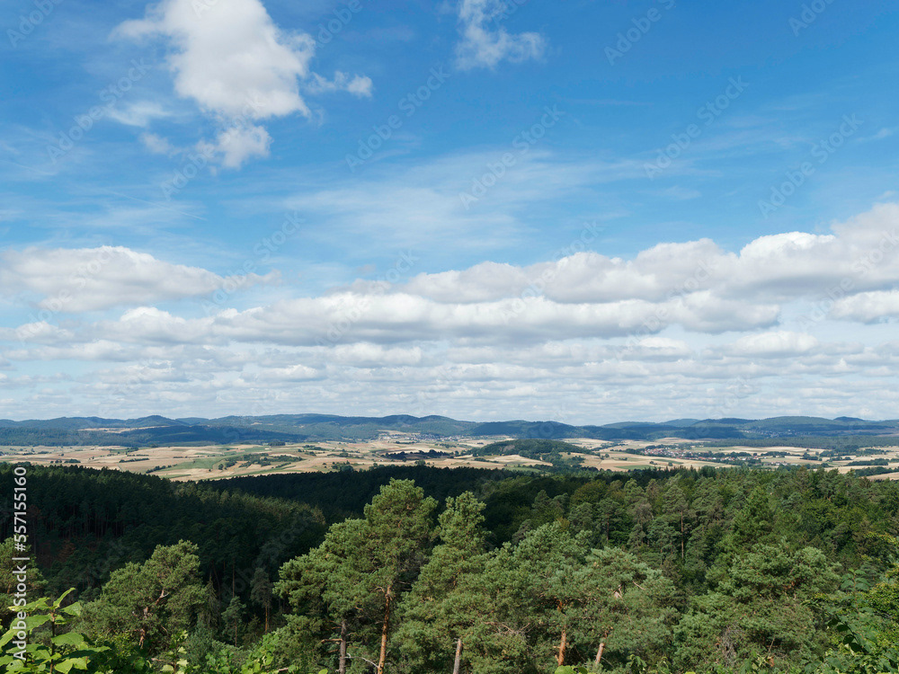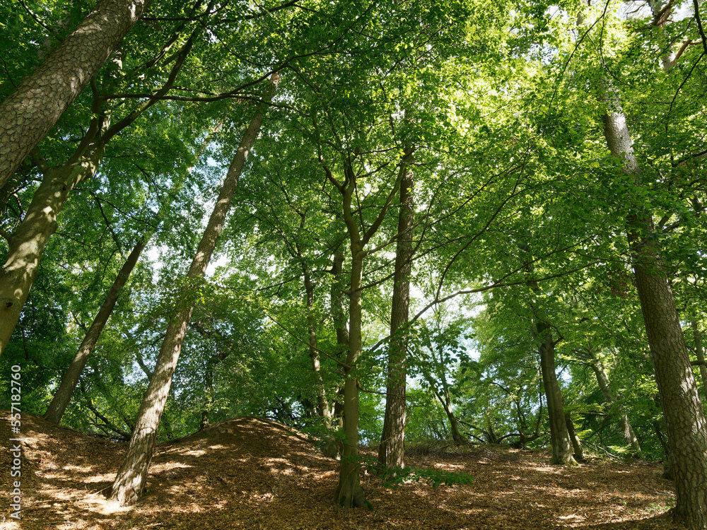 Hessische Waldlandschaft vom Bergsporn des Christenbergs durch wunderschönen mystischer Wald mit Forstwegen gesäumt von riesige Buchen, Eichen und Waldkiefern
