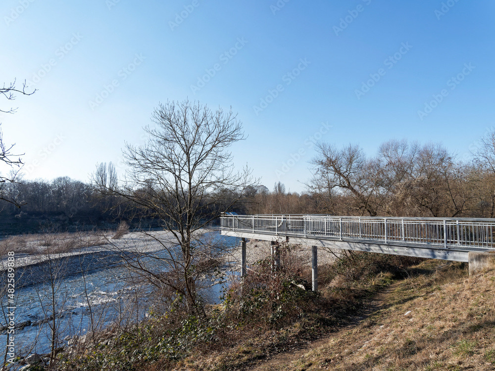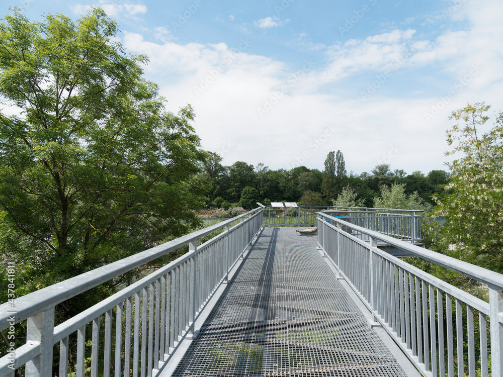 Die Isteiner Schwellen  und Besucherplattform im Altrhein im Oberrhein. Felsformation oder Felsblöcke mit ihren kleinen Stromschnellen in mitten des natürlichen Rheins