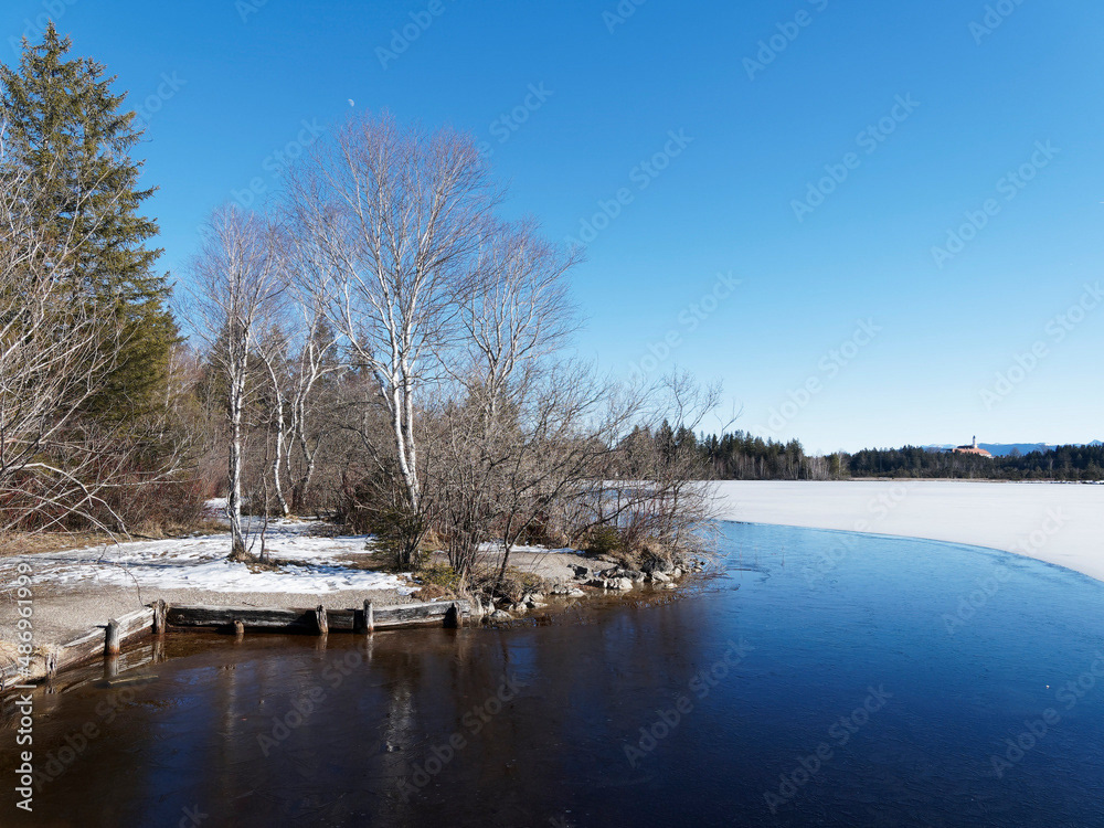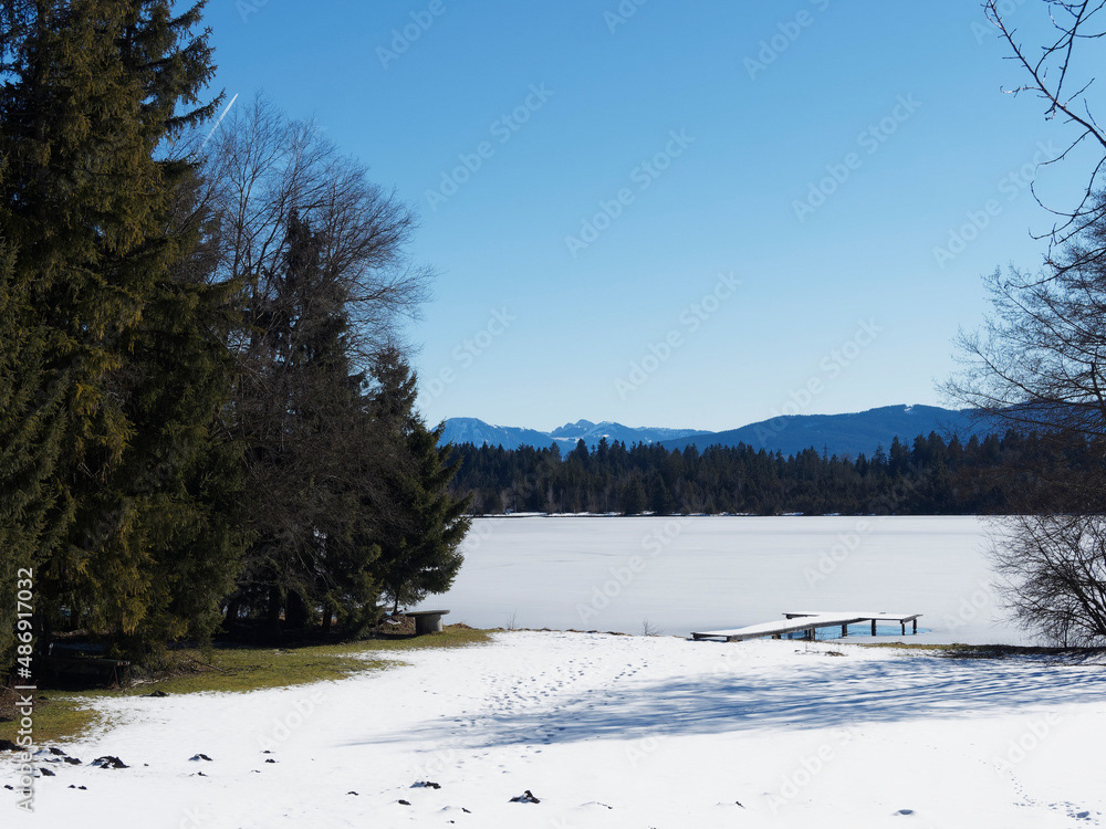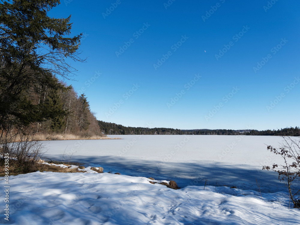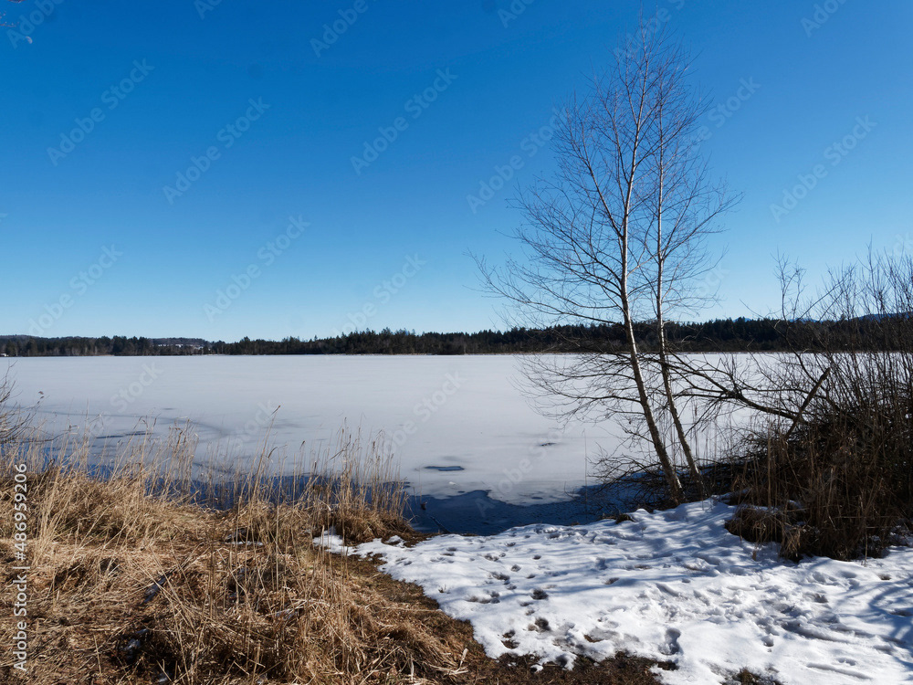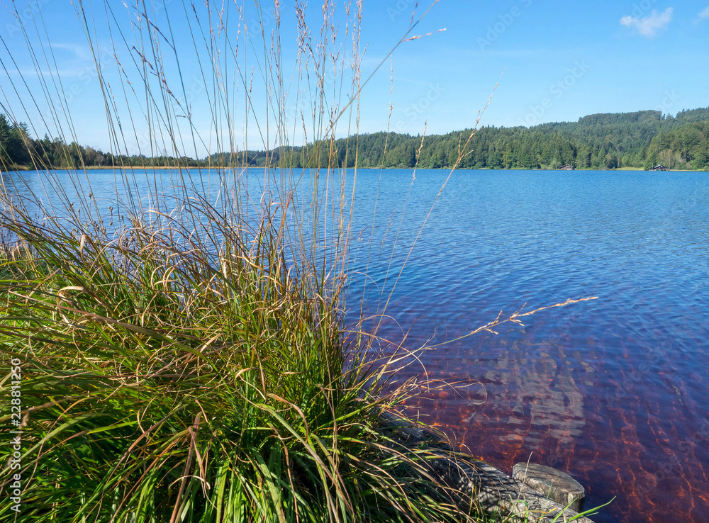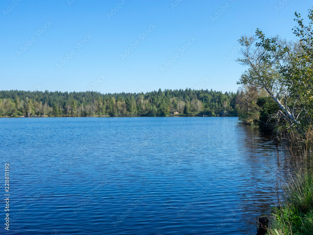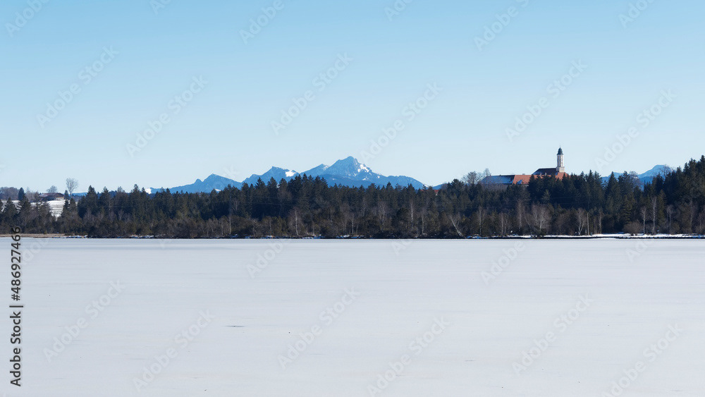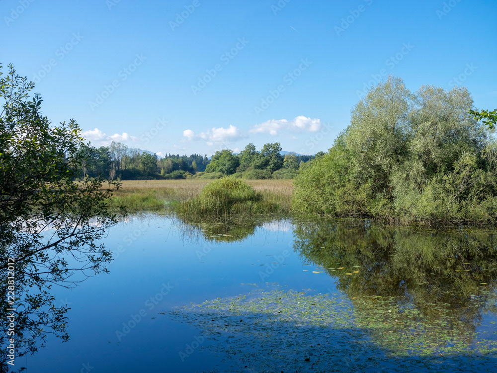 Kirchsee unterhalb von Kloster Reutberg in Sachsenkam nordöstlich von Bad Tölz in Oberbayern. Mystischer Moorsee am Nordrand  des Naturschutzgebietes Ellbach- und Kirchseemoor.