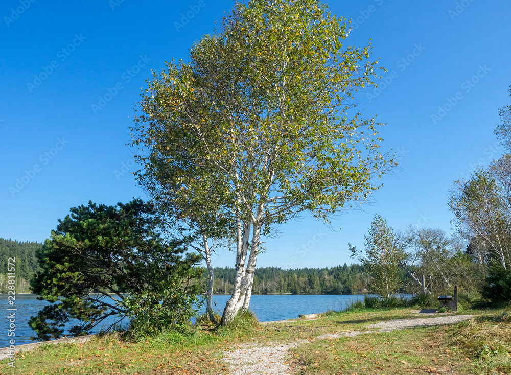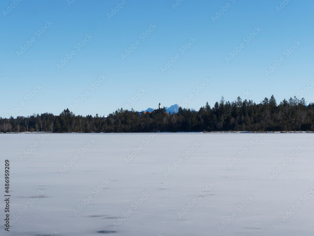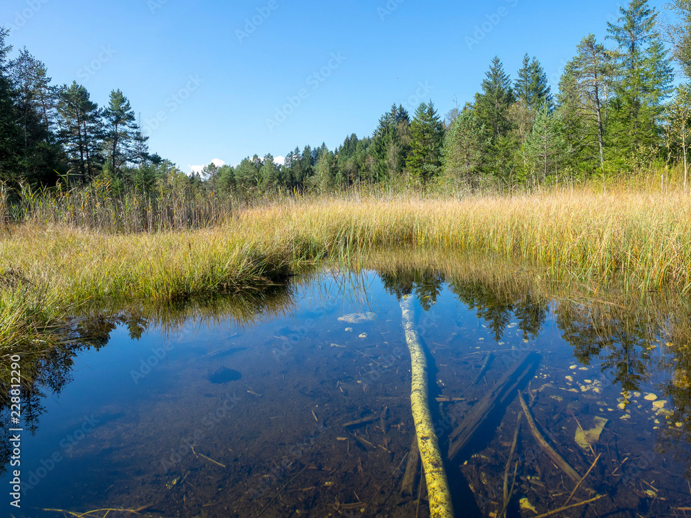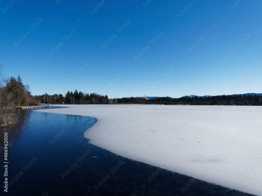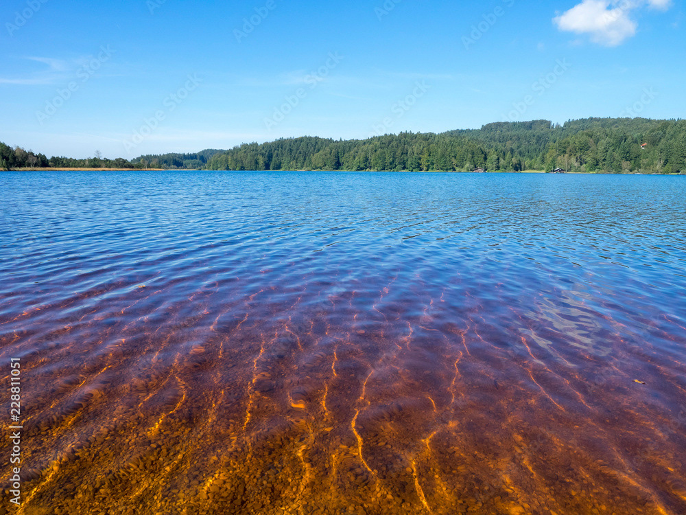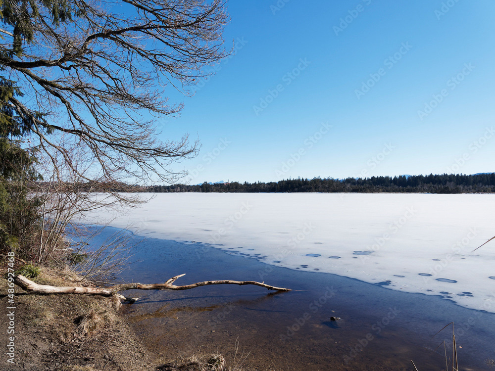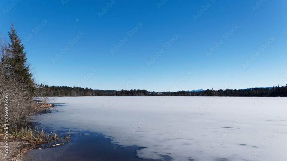Kirchsee unterhalb von Kloster Reutberg in Sachsenkam nordöstlich von Bad Tölz in Oberbayern. Mystischer Moorsee am Nordrand  des Naturschutzgebietes Ellbach- und Kirchseemoor.