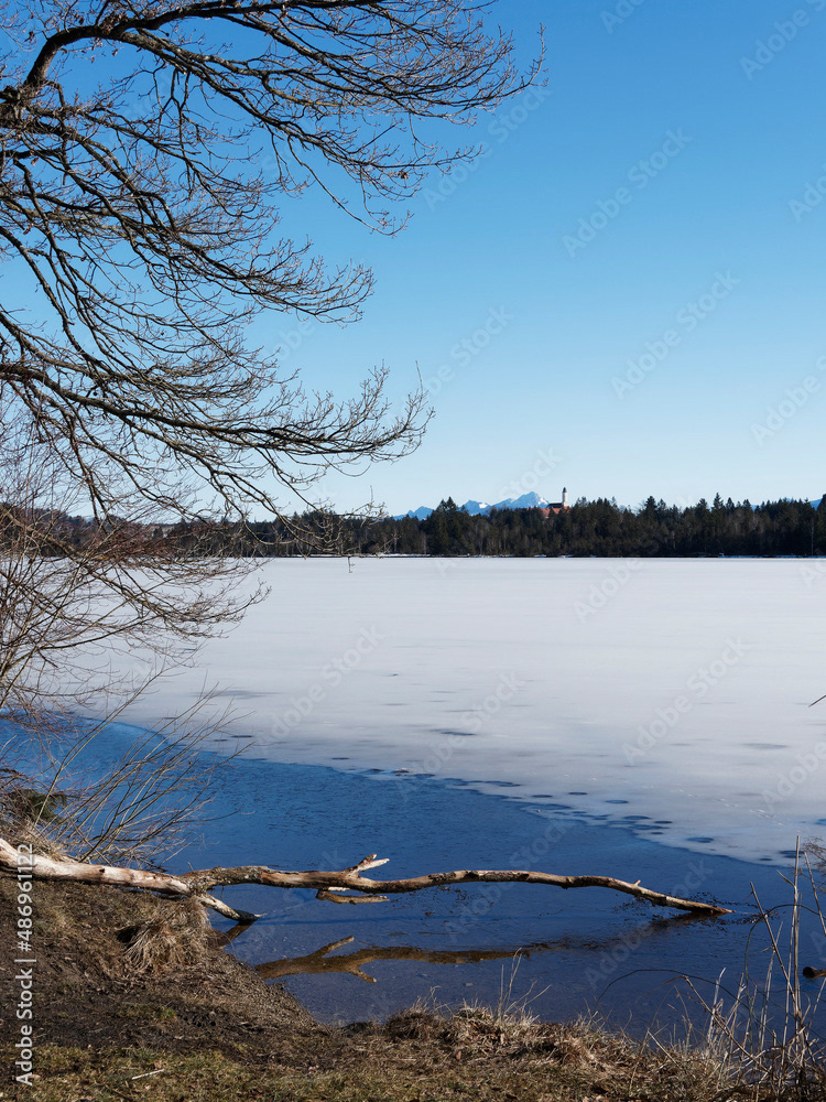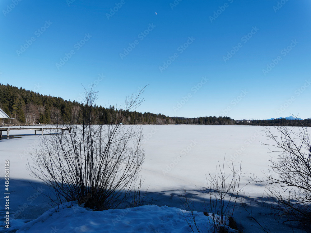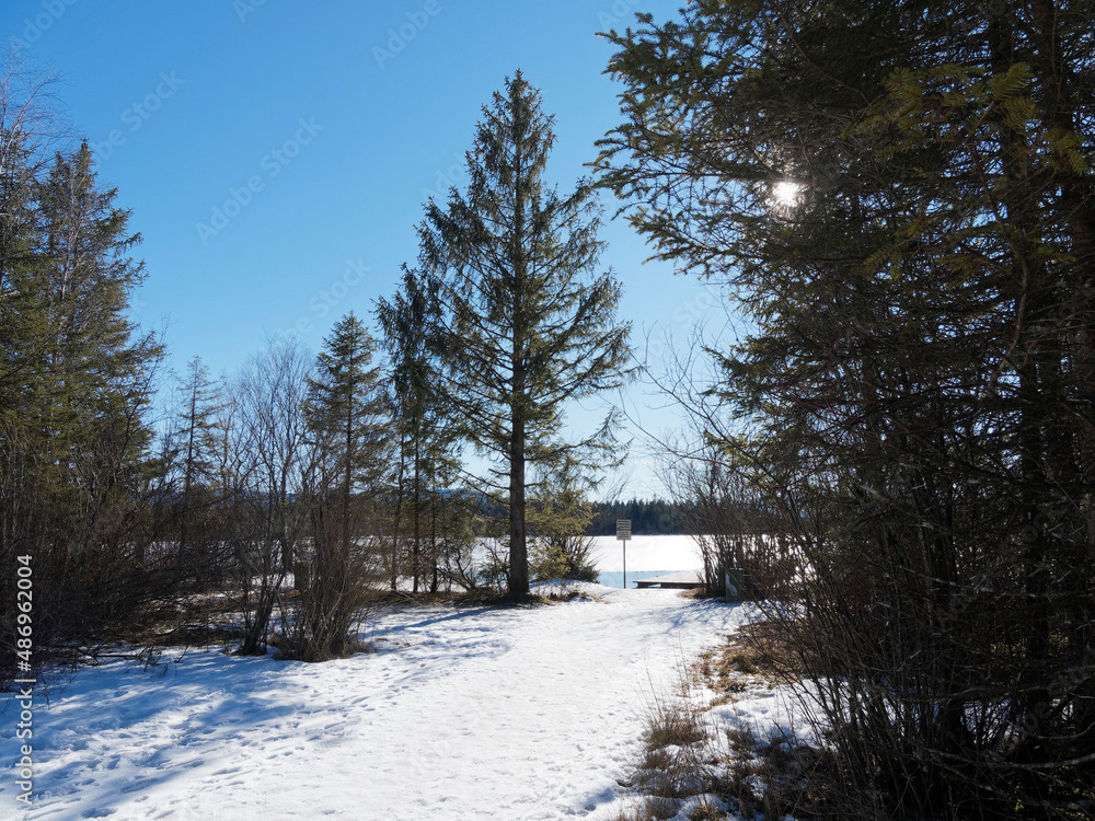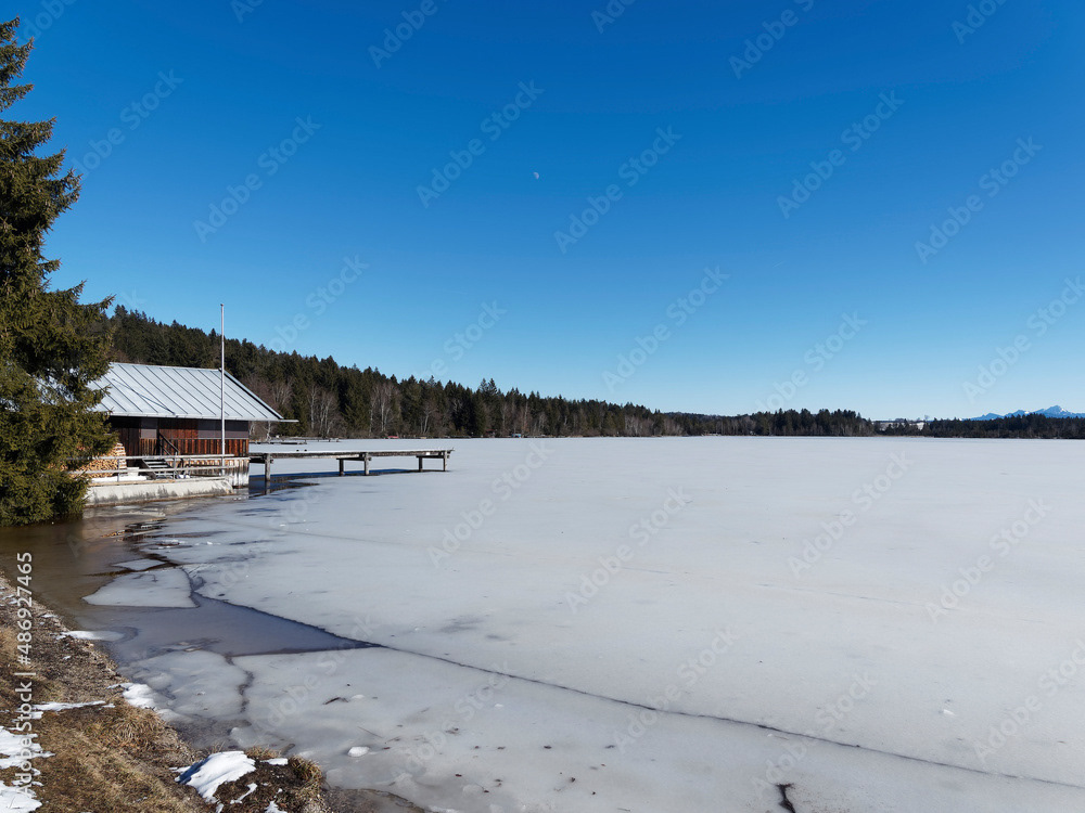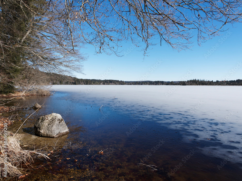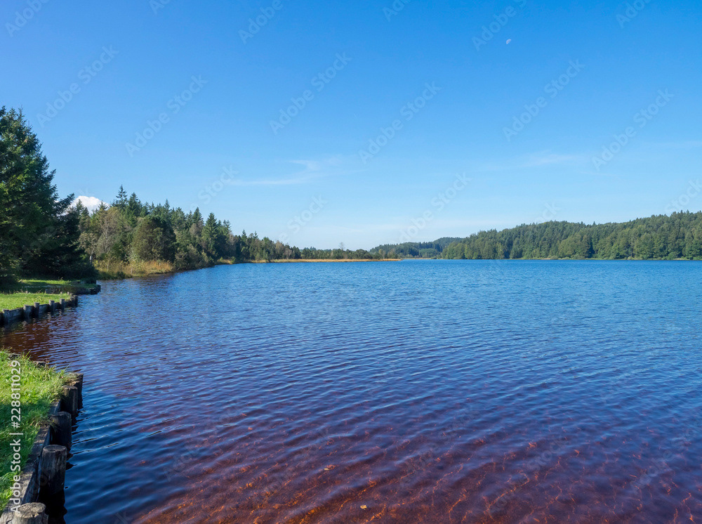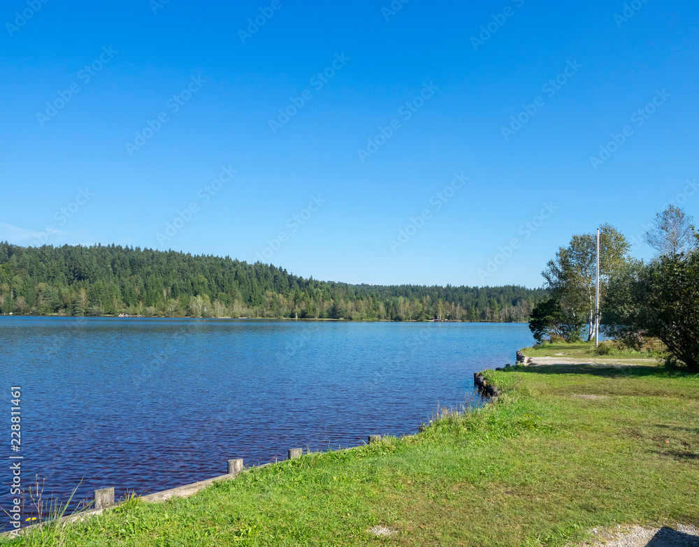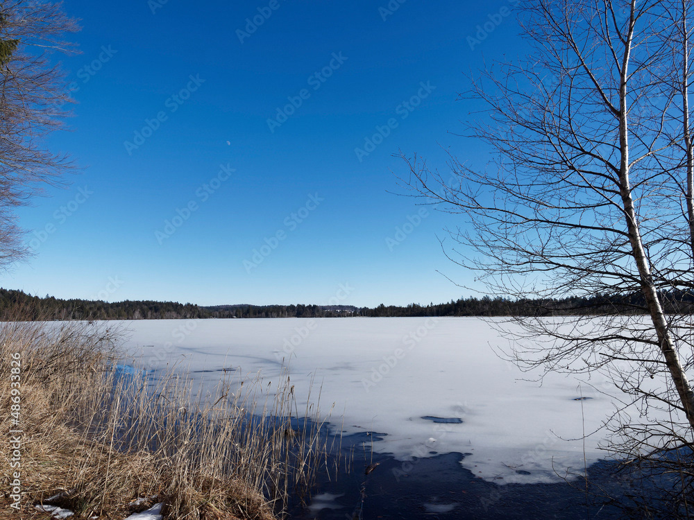 Kirchsee unterhalb von Kloster Reutberg in Sachsenkam nordöstlich von Bad Tölz in Oberbayern. Mystischer Moorsee am Nordrand  des Naturschutzgebietes Ellbach- und Kirchseemoor.