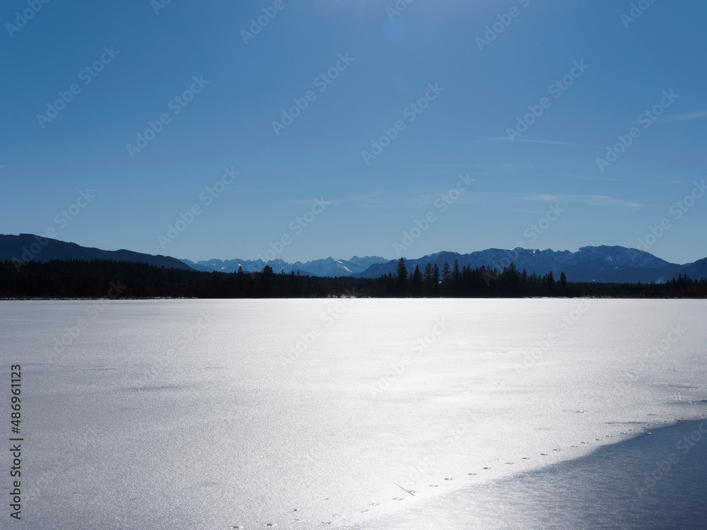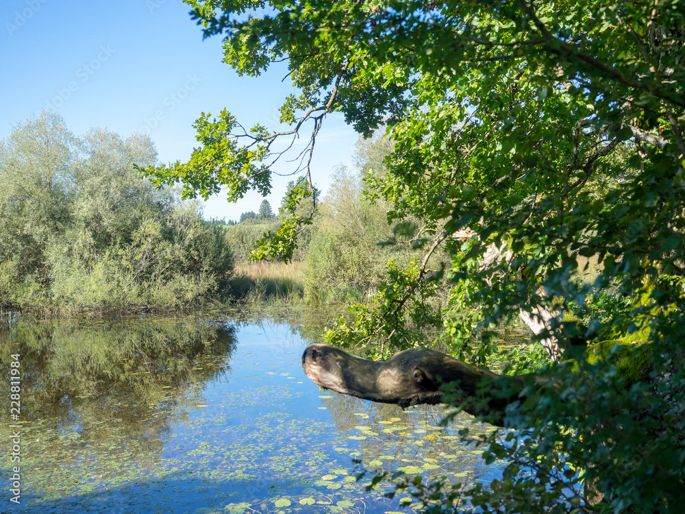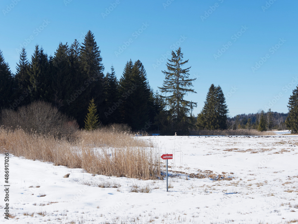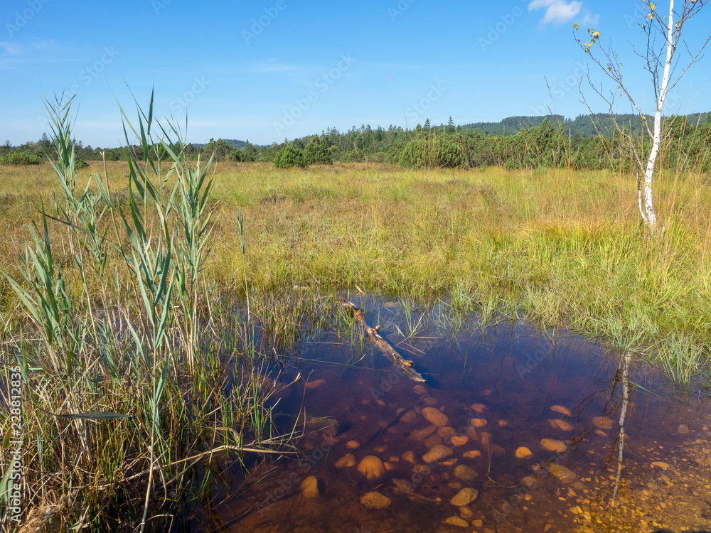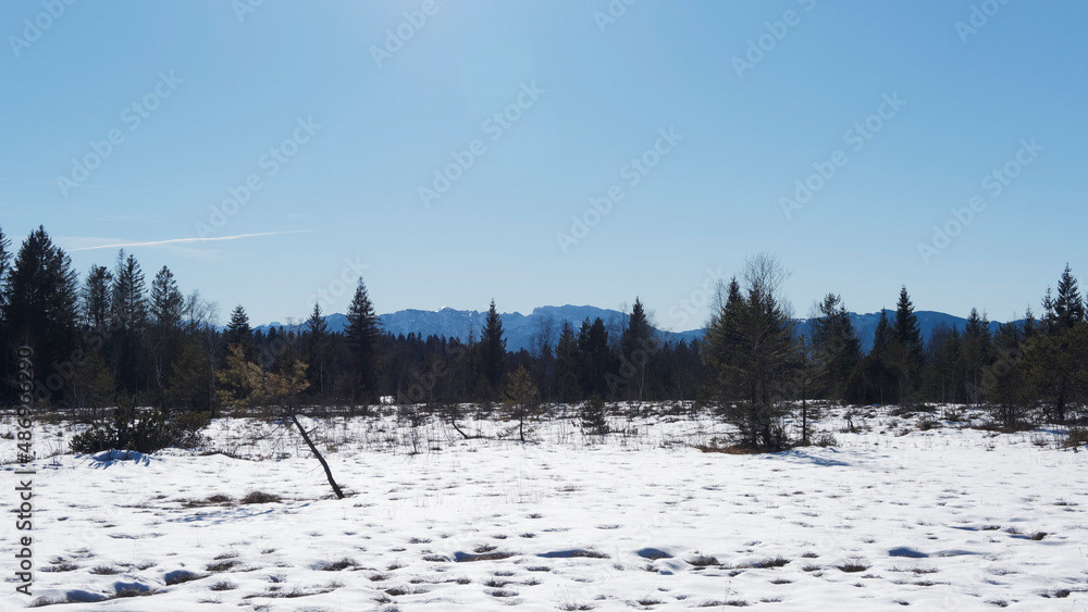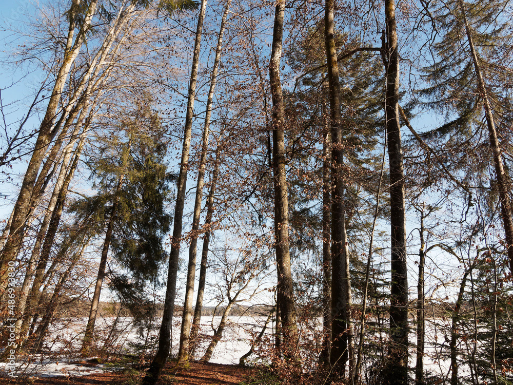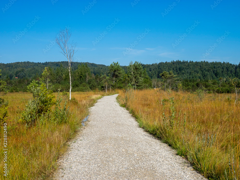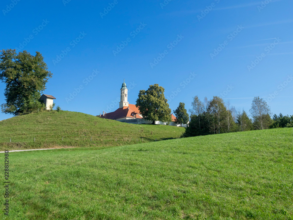 Kirchsee unterhalb von Kloster Reutberg in Sachsenkam nordöstlich von Bad Tölz in Oberbayern. Mystischer Moorsee am Nordrand  des Naturschutzgebietes Ellbach- und Kirchseemoor.