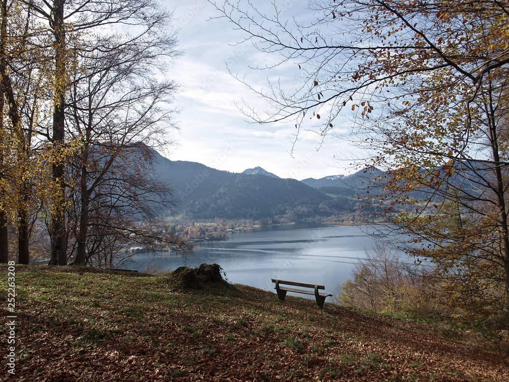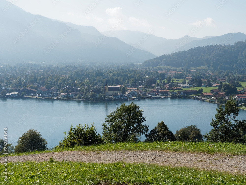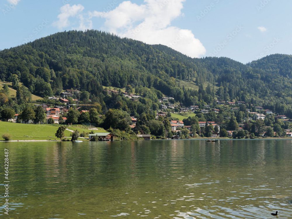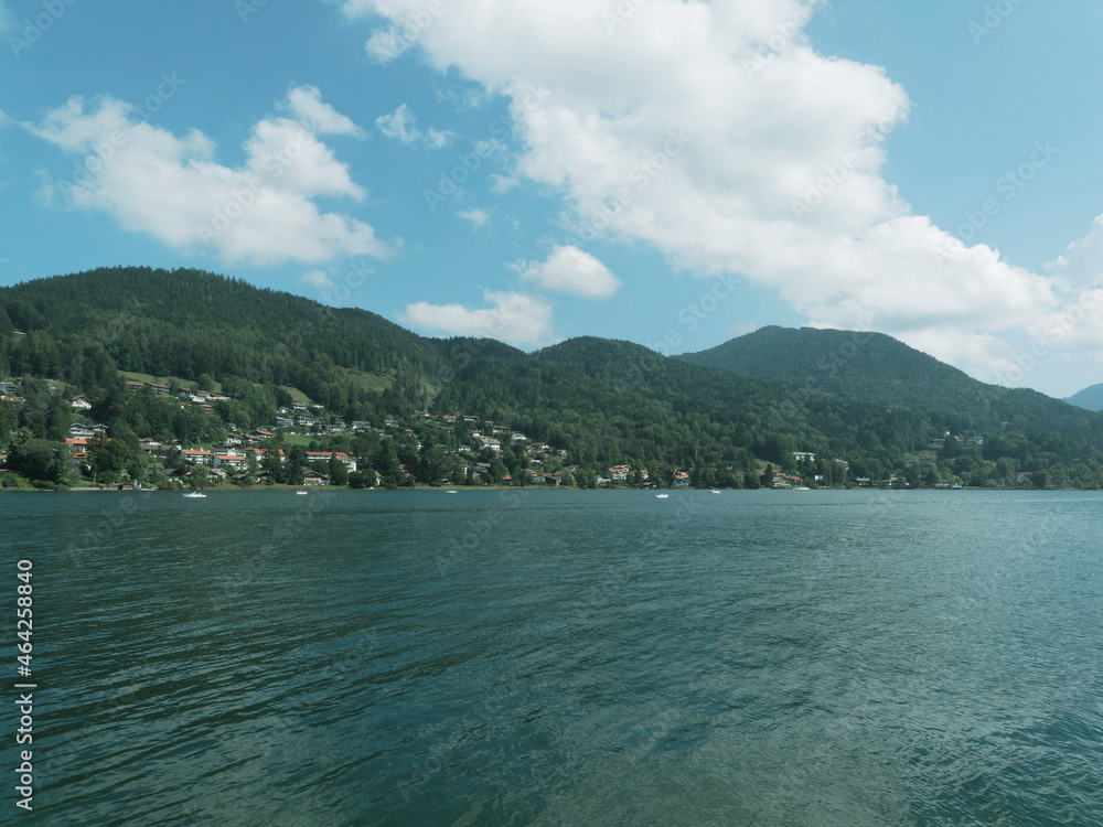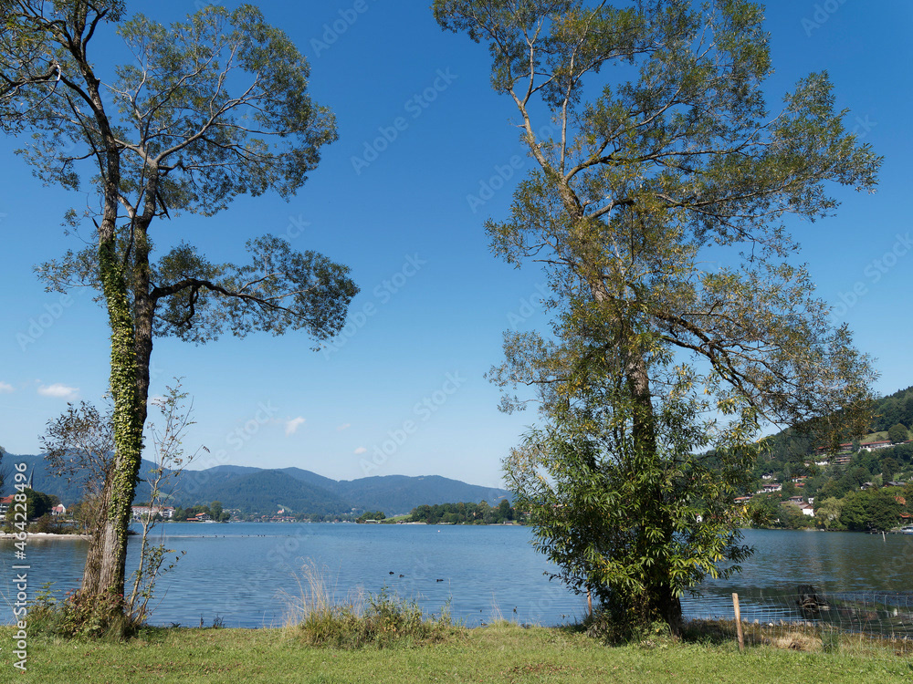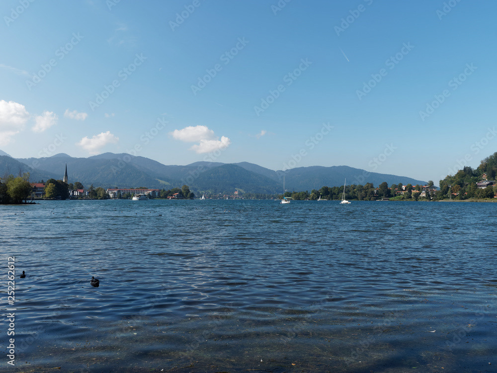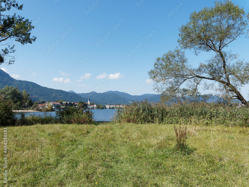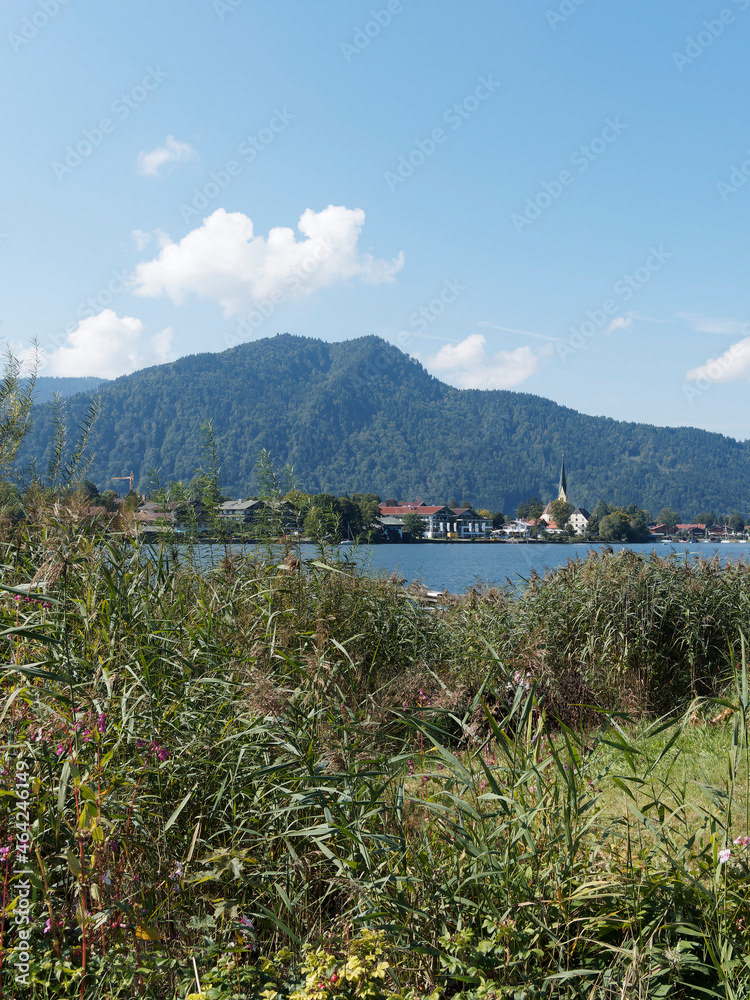 Der See ist von bewaldeten Hügeln, am Fuße der Gipfel von der Wallberg, Hirschberg umgeben. Der Ufer mit Schilf gesäumt. Gmund im Norden, Rottach-Egern im Süden und Bad Wiessee im West.