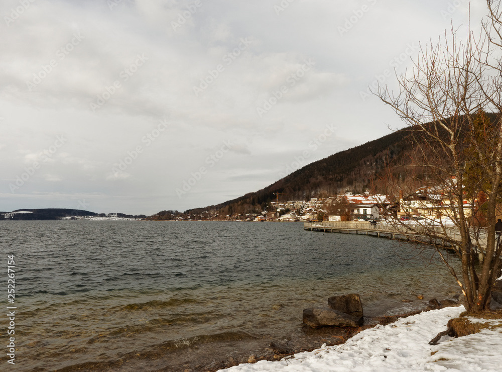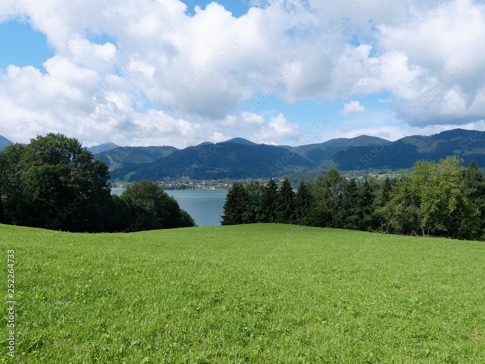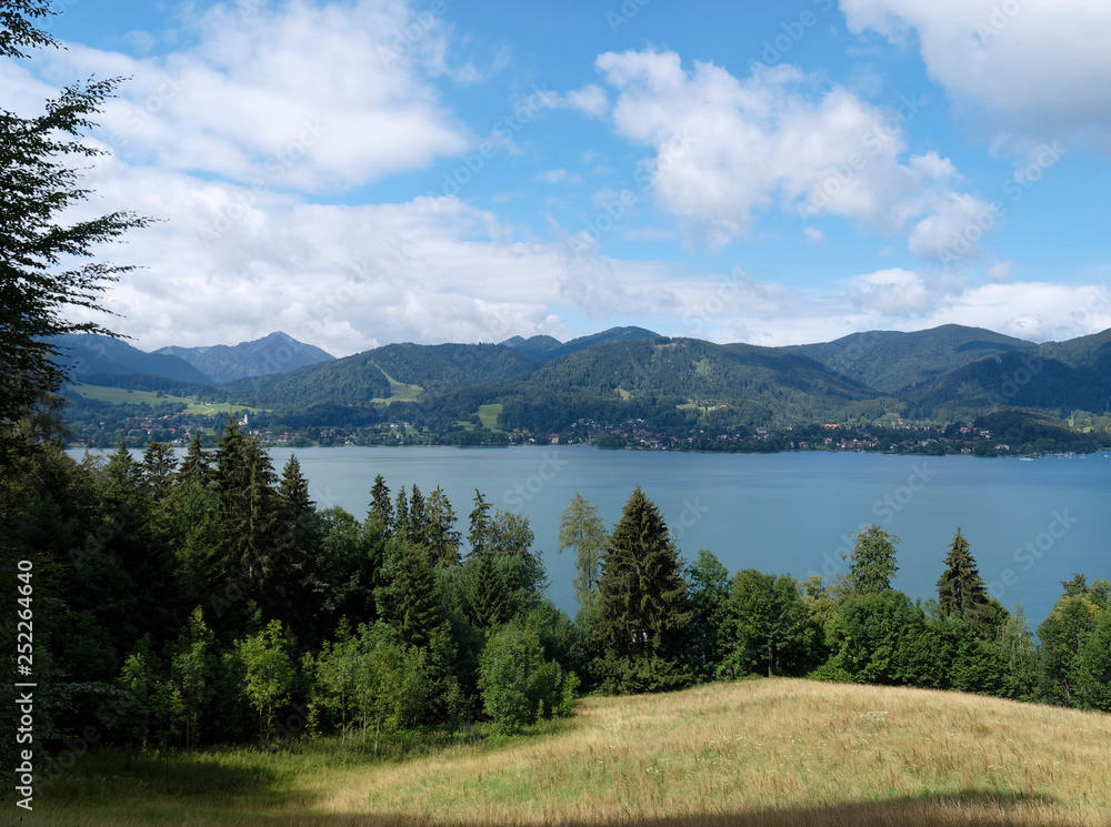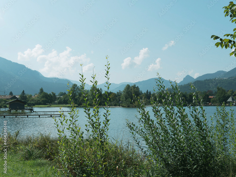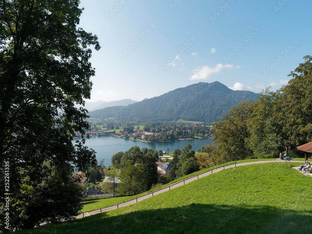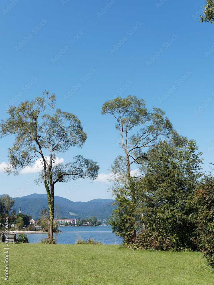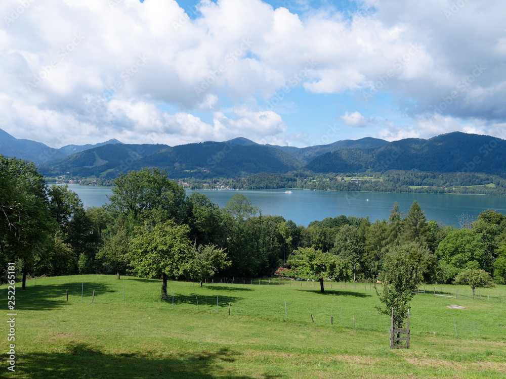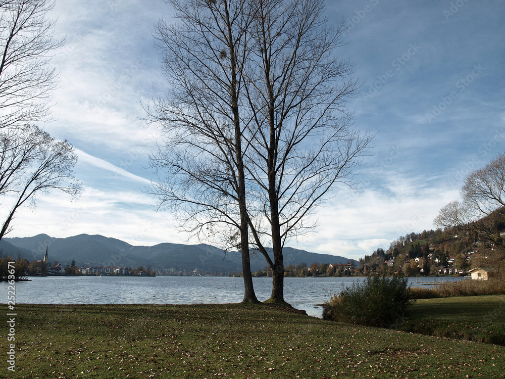 Der See ist von bewaldeten Hügeln, am Fuße der Gipfel von der Wallberg, Hirschberg umgeben. Der Ufer mit Schilf gesäumt. Gmund im Norden, Rottach-Egern im Süden und Bad Wiessee im West.