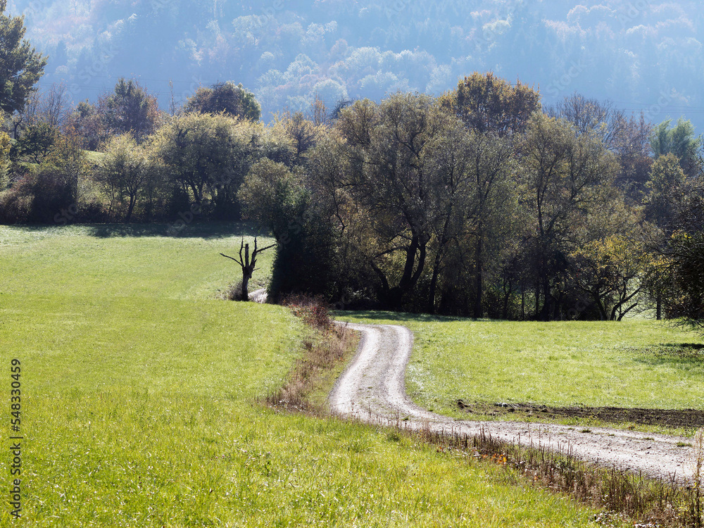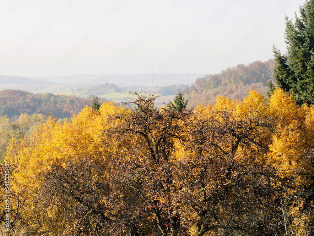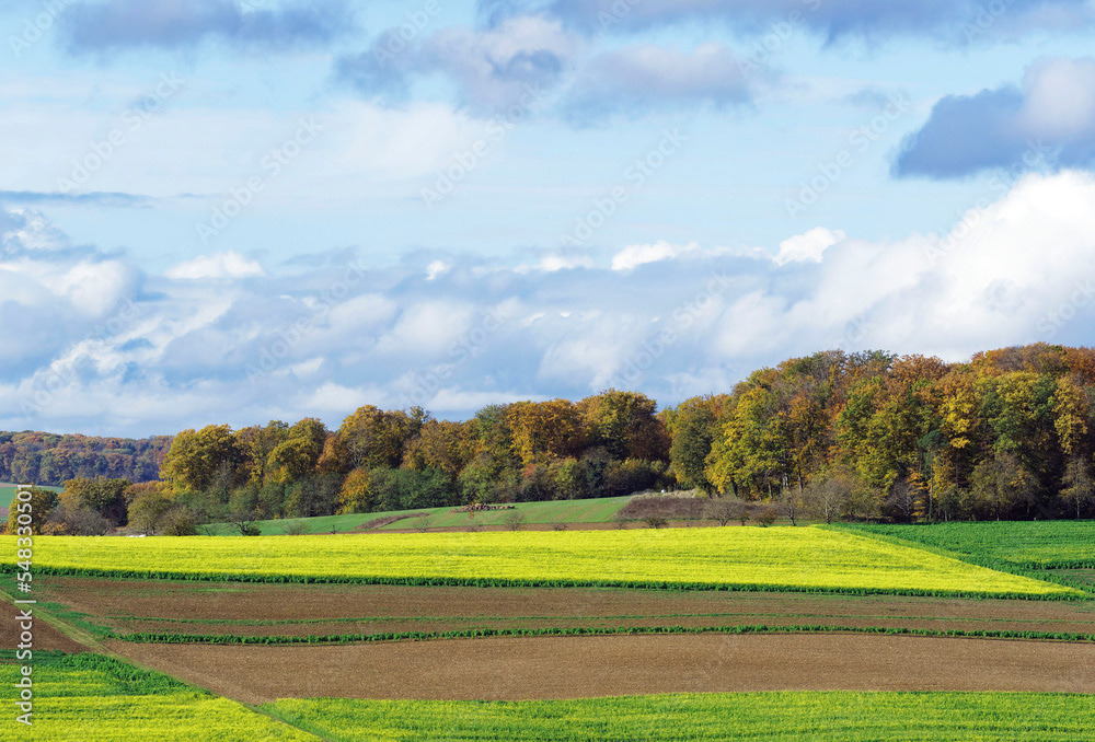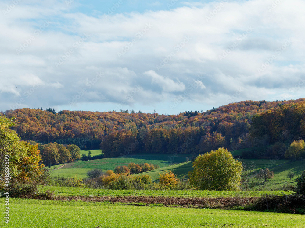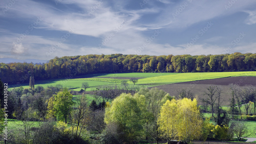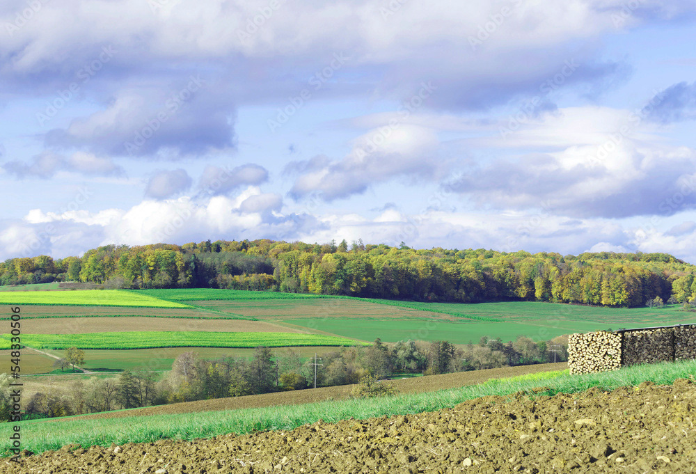 Wollbach im Markgräflerland zwischen Oberrheinischer Tiefebene und dem Südschwarzwald. Herrliche Landschaften aus Hügeln, Wiesen und Obstgärten mit Wäldern und zahlreichen Wanderwegen