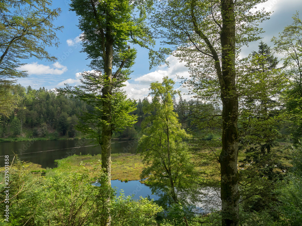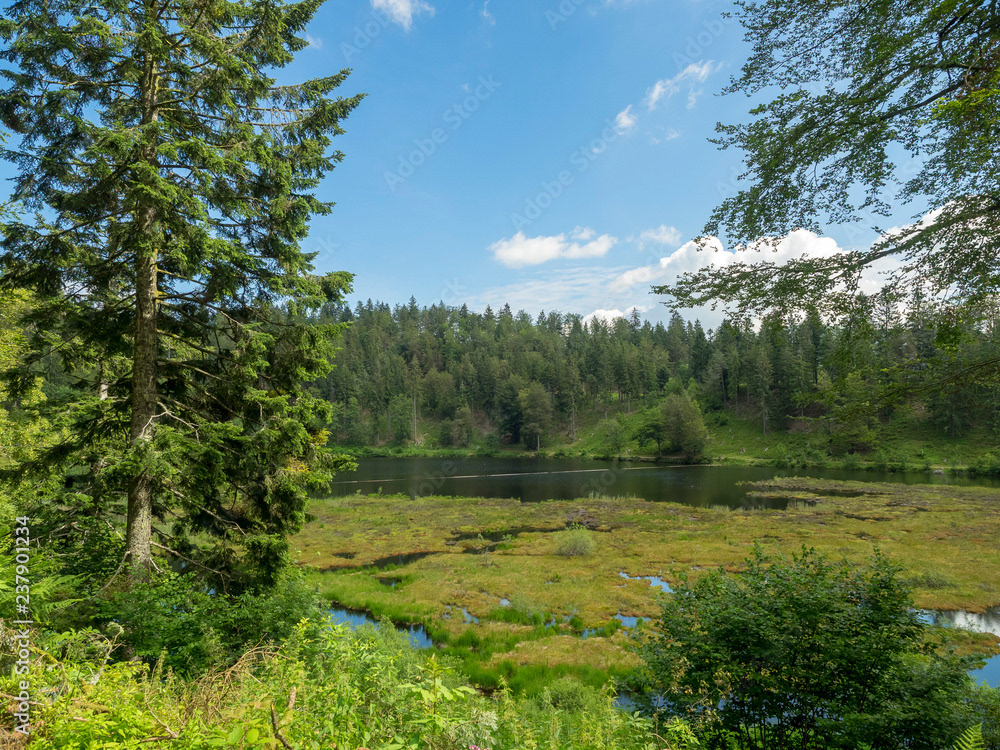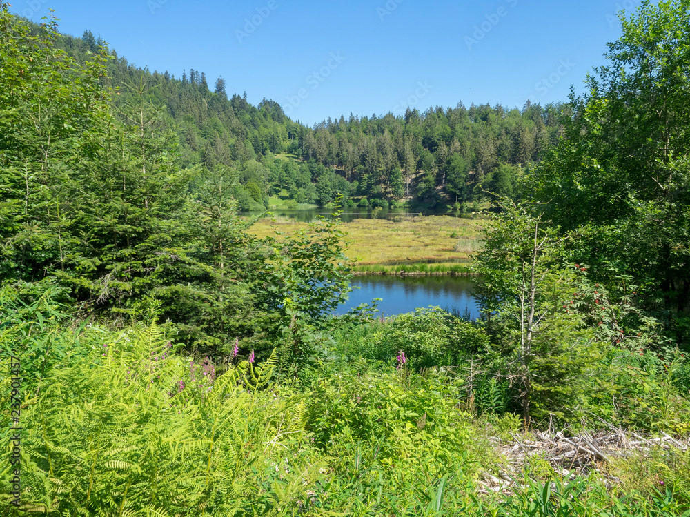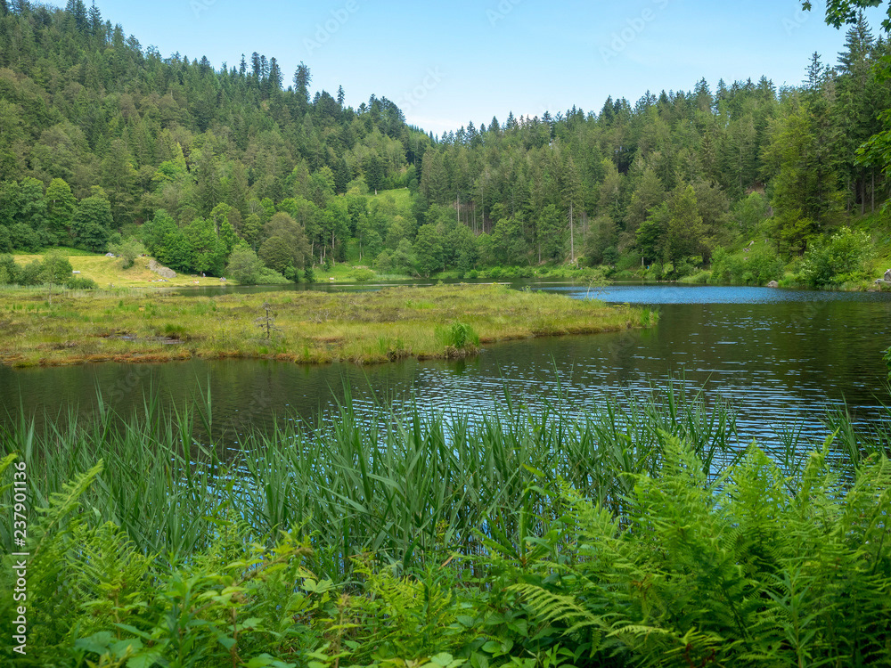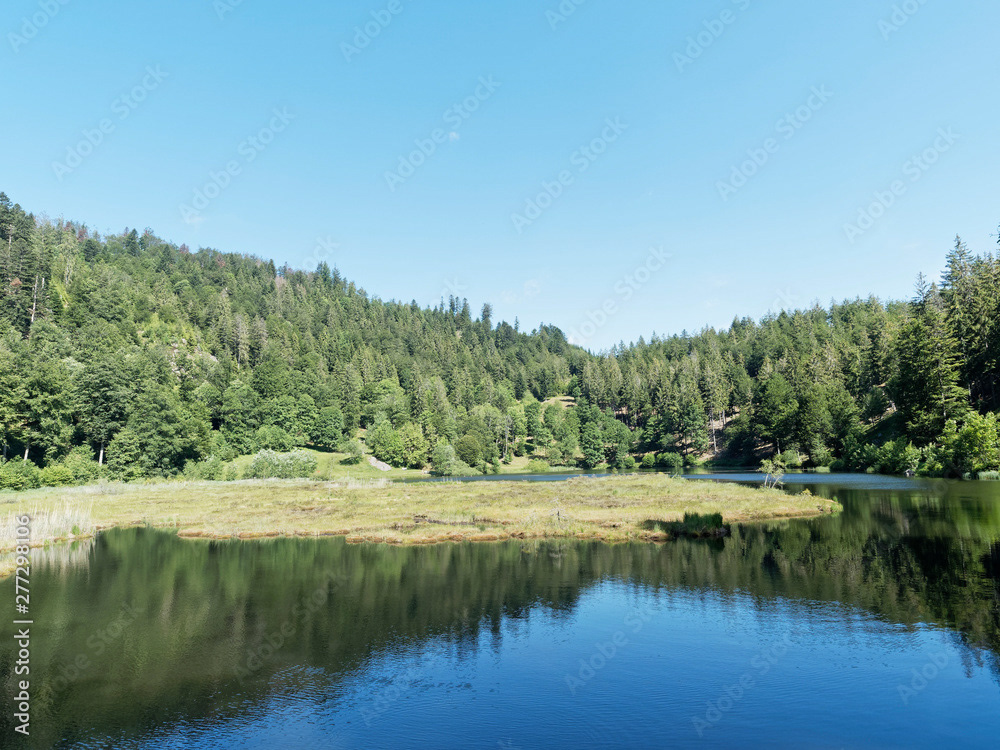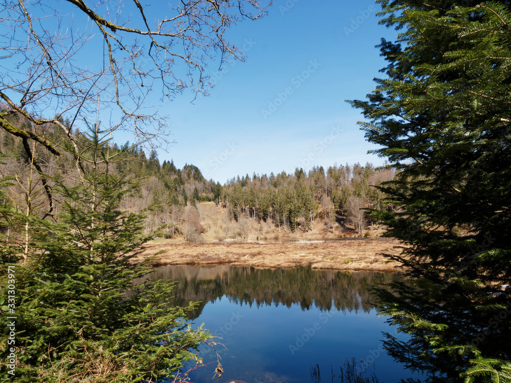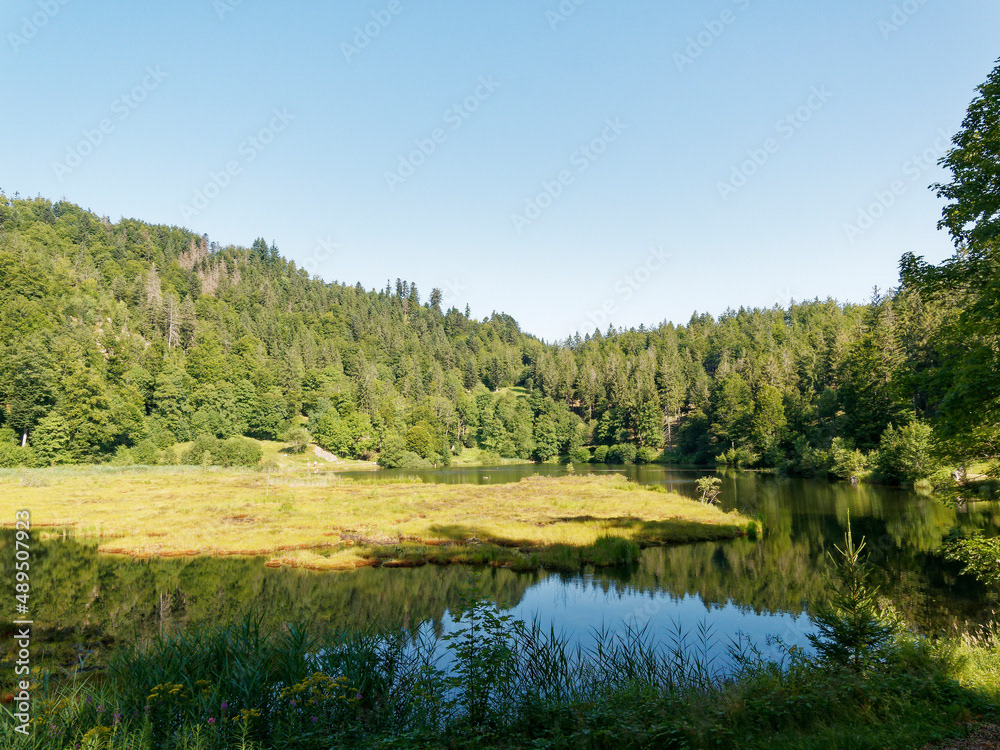 Mystische Orte. Kleiner Stausee und Badsee mit Torfinsel in Naturschutzgebiet des Schwarzwaldes in den Osthängen des Köhlgartenmassivs