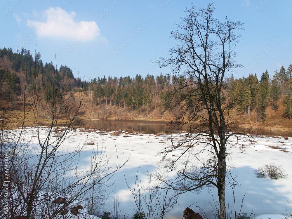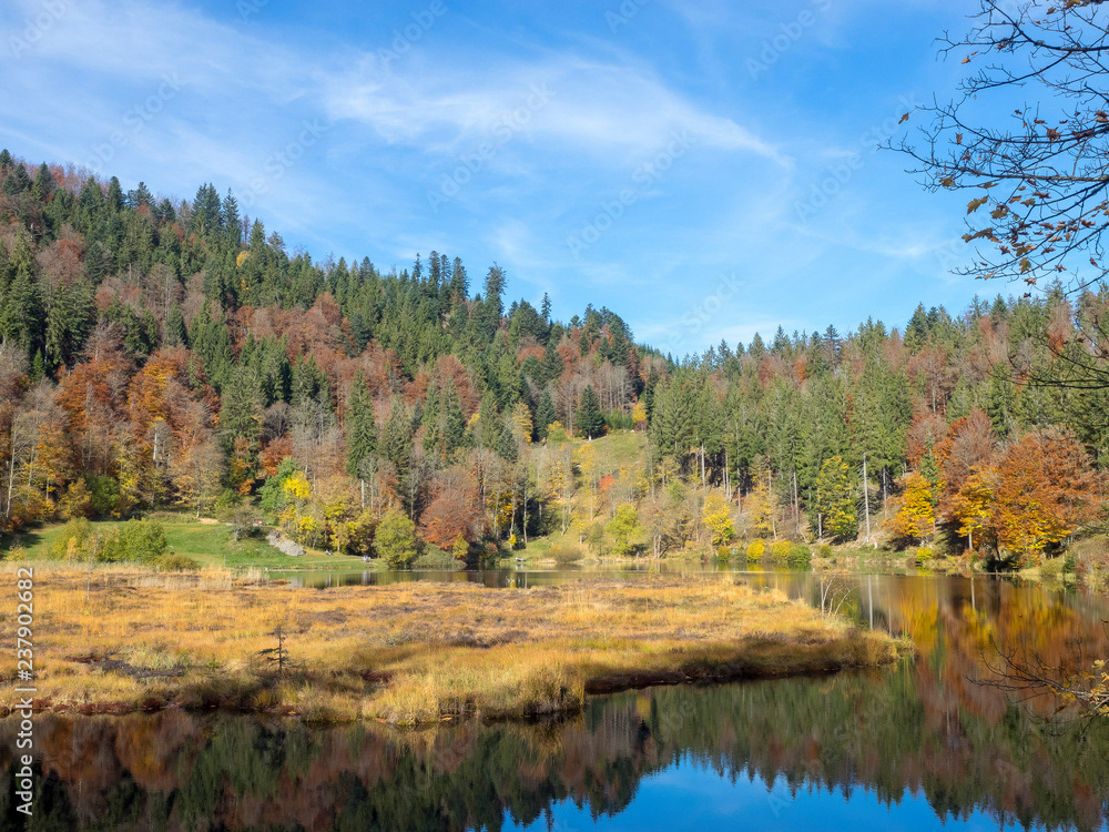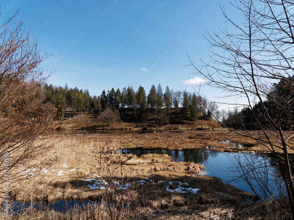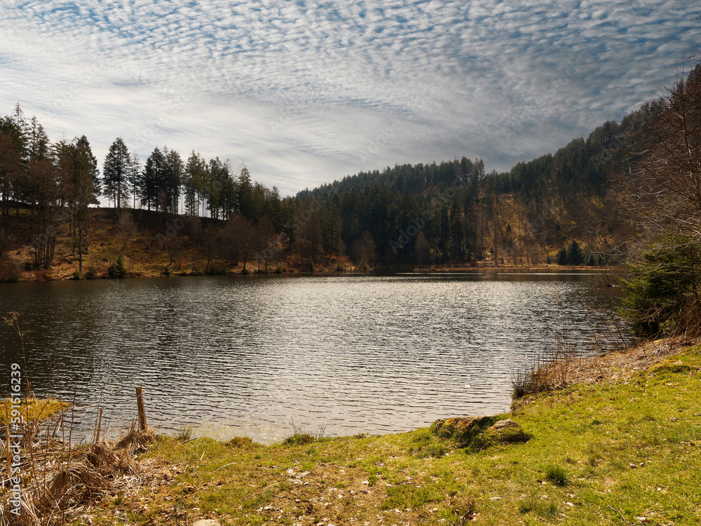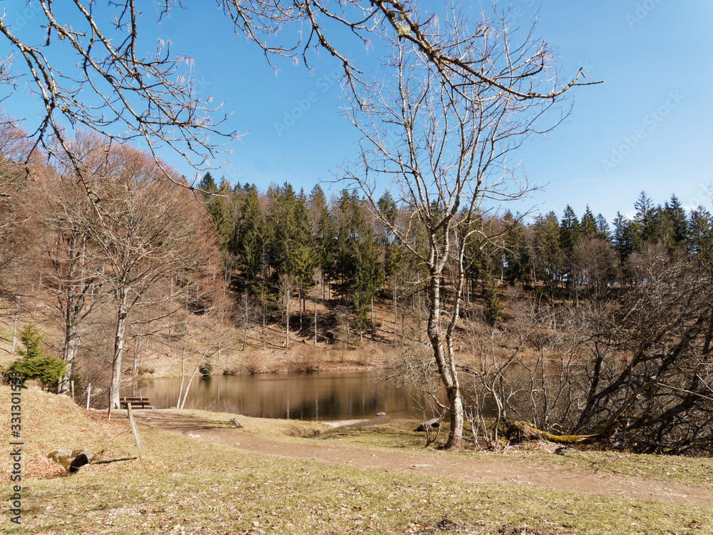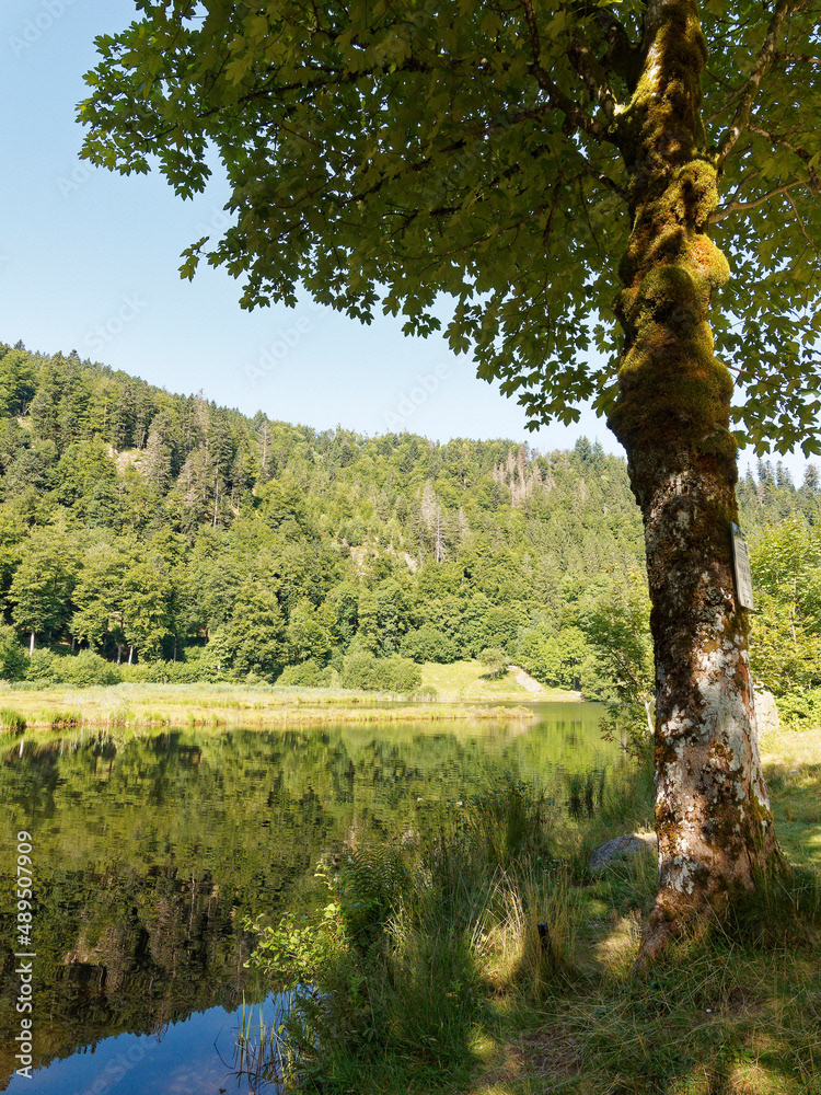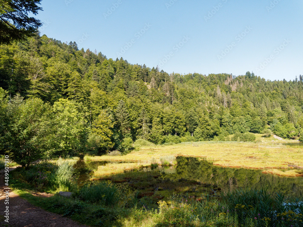 Mystische Orte. Kleiner Stausee und Badsee mit Torfinsel in Naturschutzgebiet des Schwarzwaldes in den Osthängen des Köhlgartenmassivs