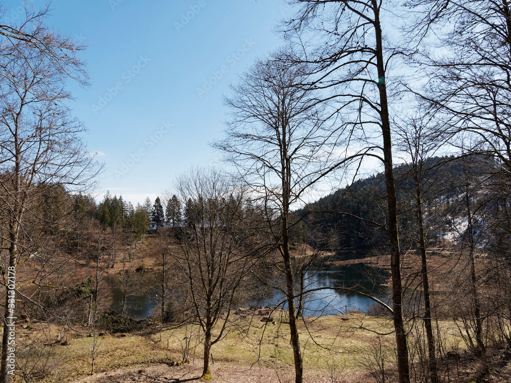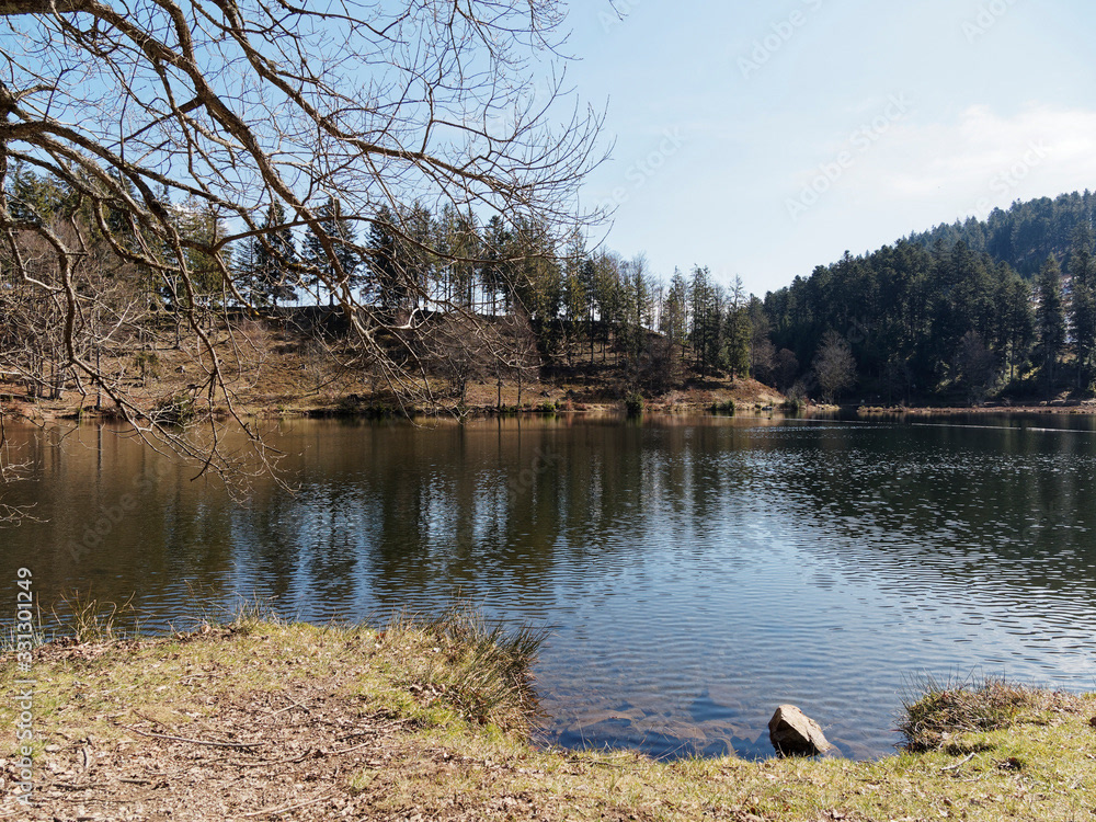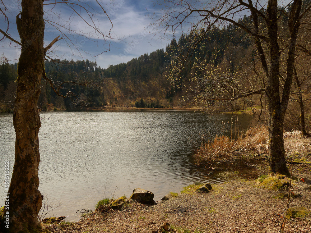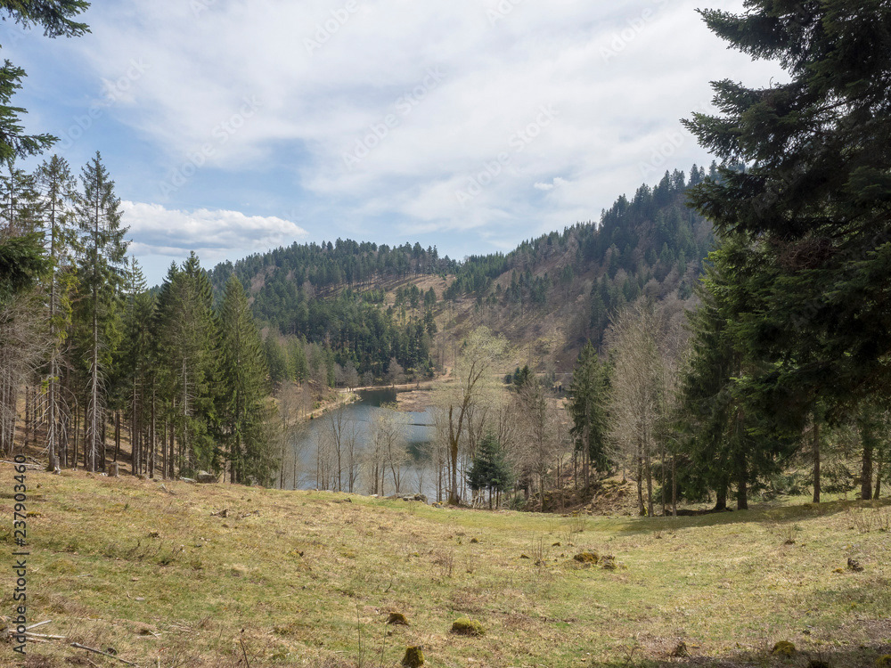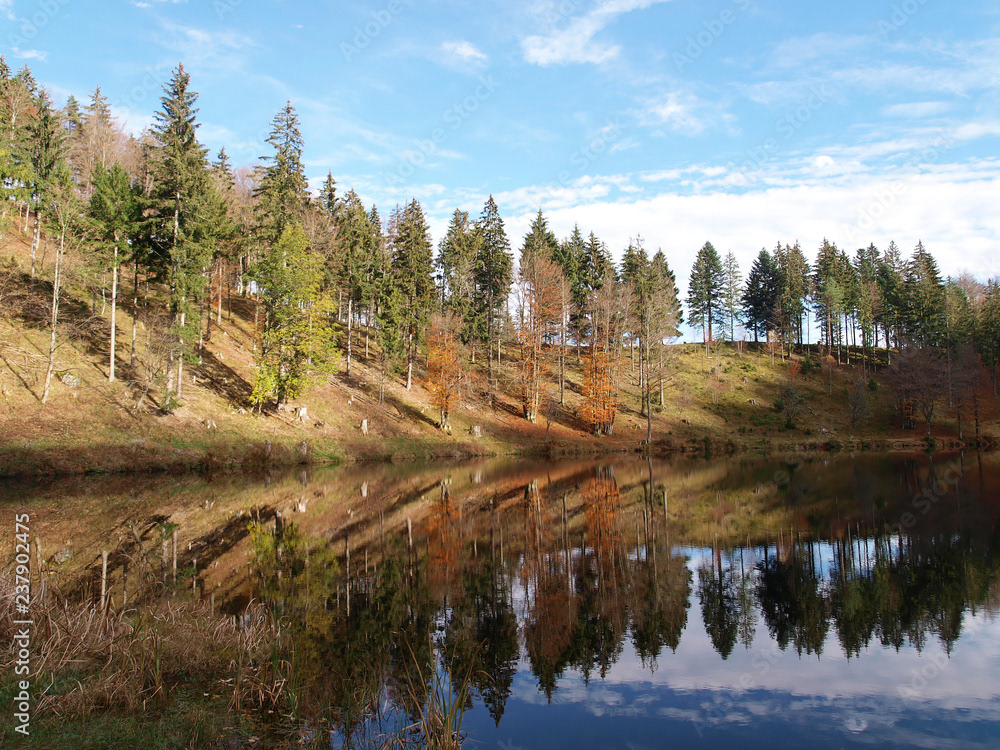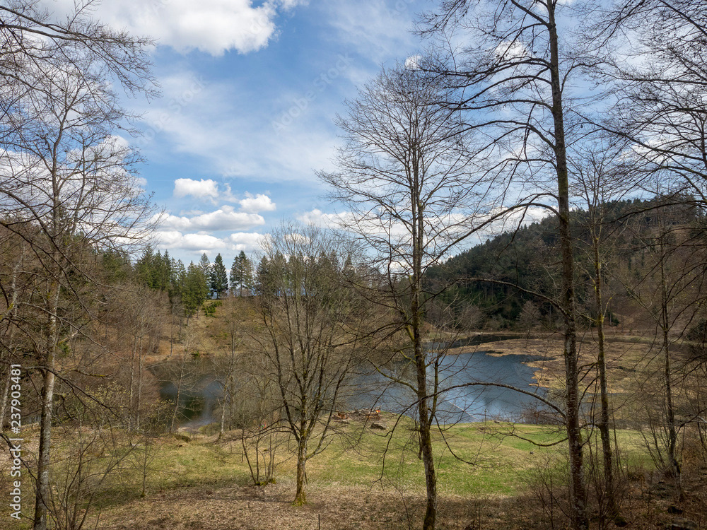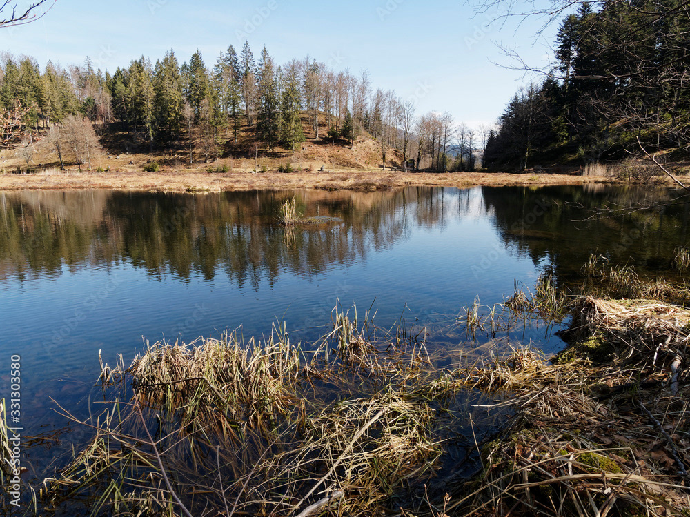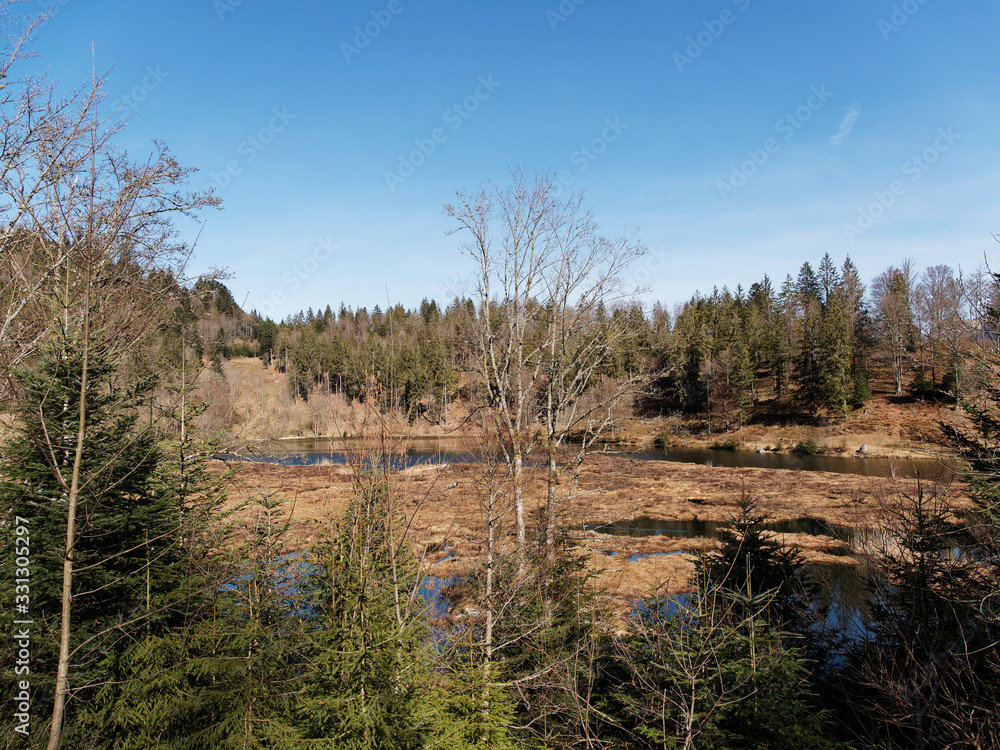 Mystische Orte. Kleiner Stausee und Badsee mit Torfinsel in Naturschutzgebiet des Schwarzwaldes in den Osthängen des Köhlgartenmassivs