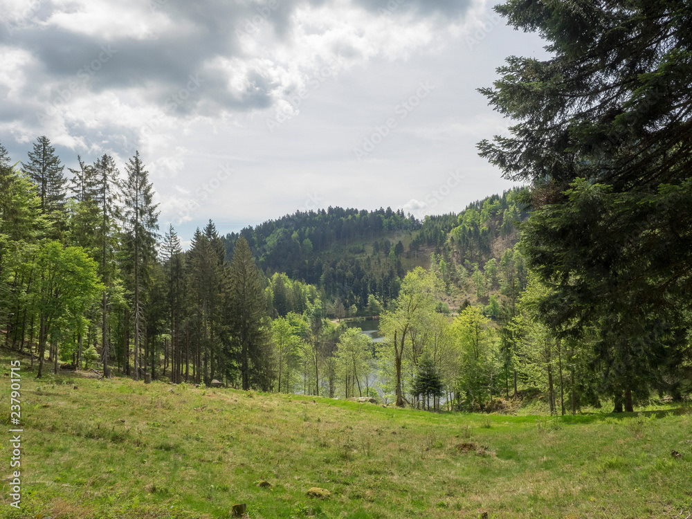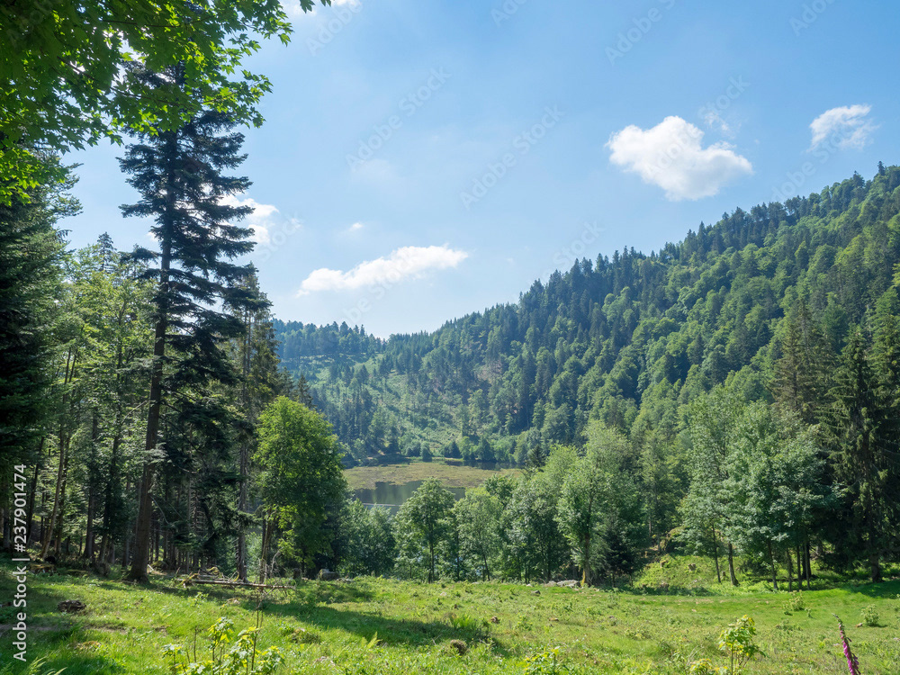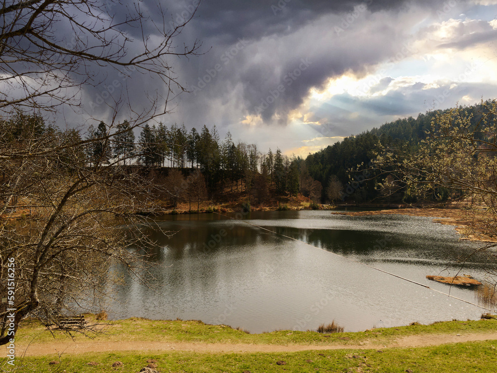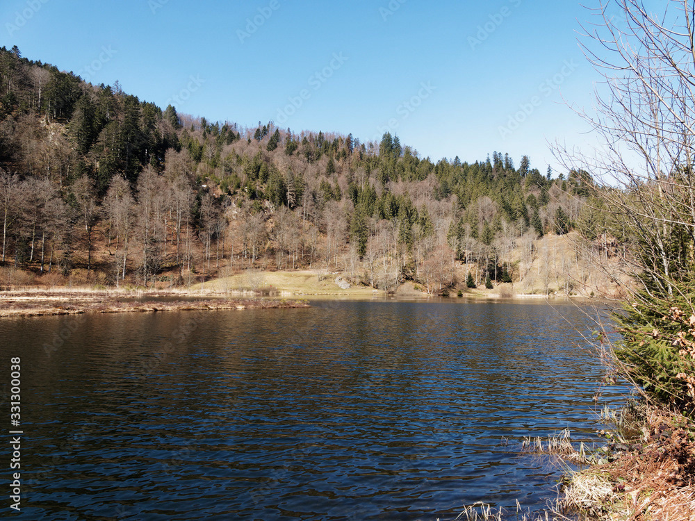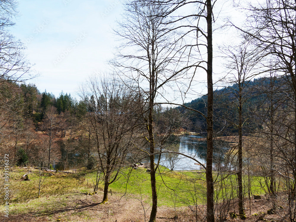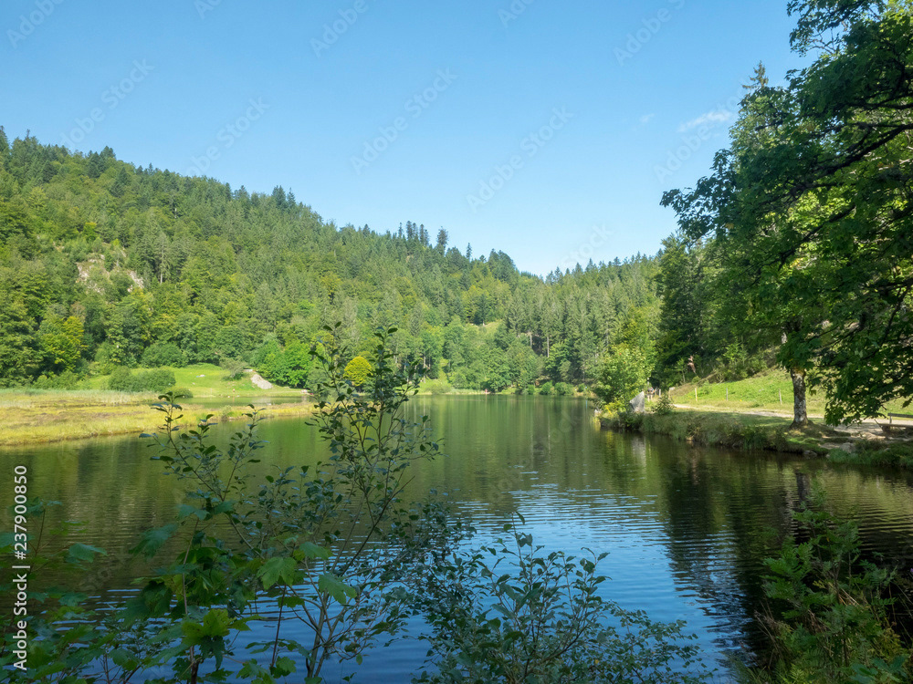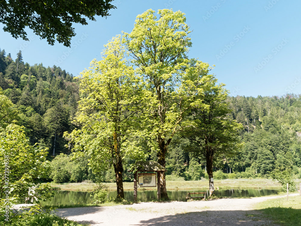 Mystische Orte. Kleiner Stausee und Badsee mit Torfinsel in Naturschutzgebiet des Schwarzwaldes in den Osthängen des Köhlgartenmassivs