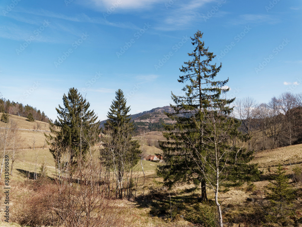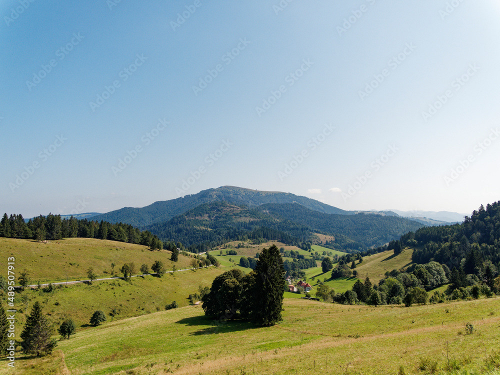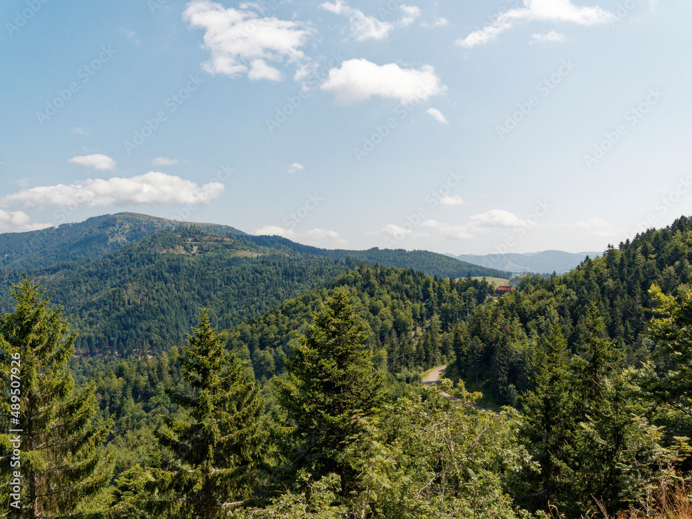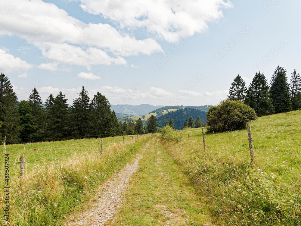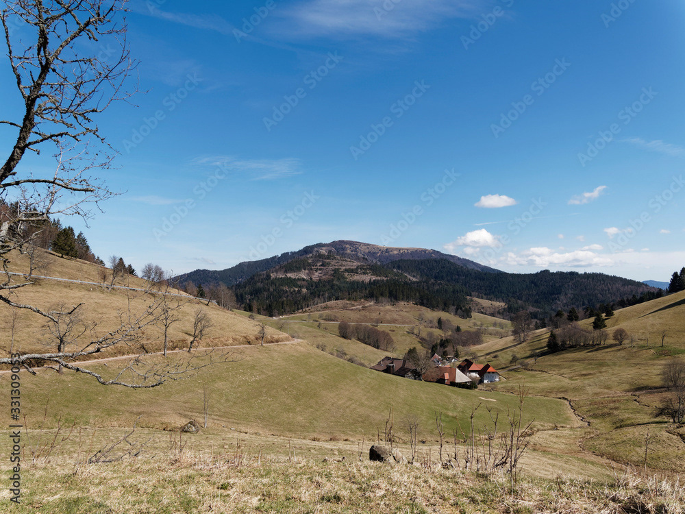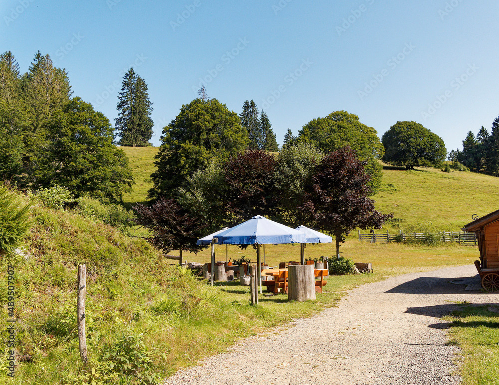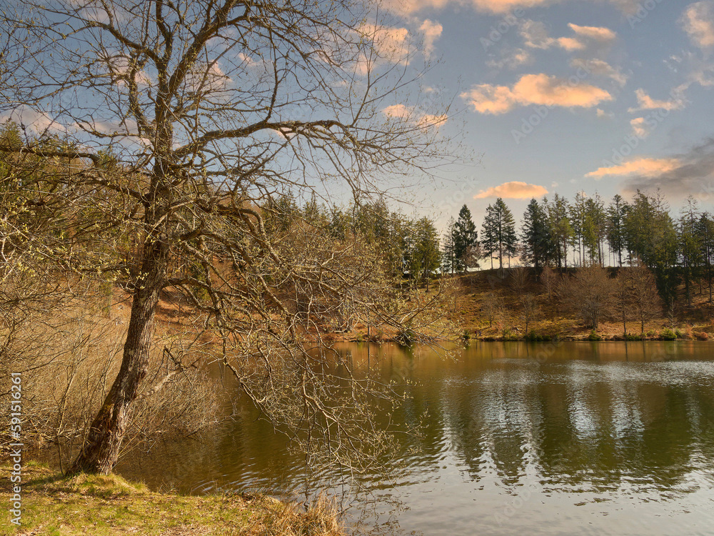 Mystische Orte. Kleiner Stausee und Badsee mit Torfinsel in Naturschutzgebiet des Schwarzwaldes in den Osthängen des Köhlgartenmassivs