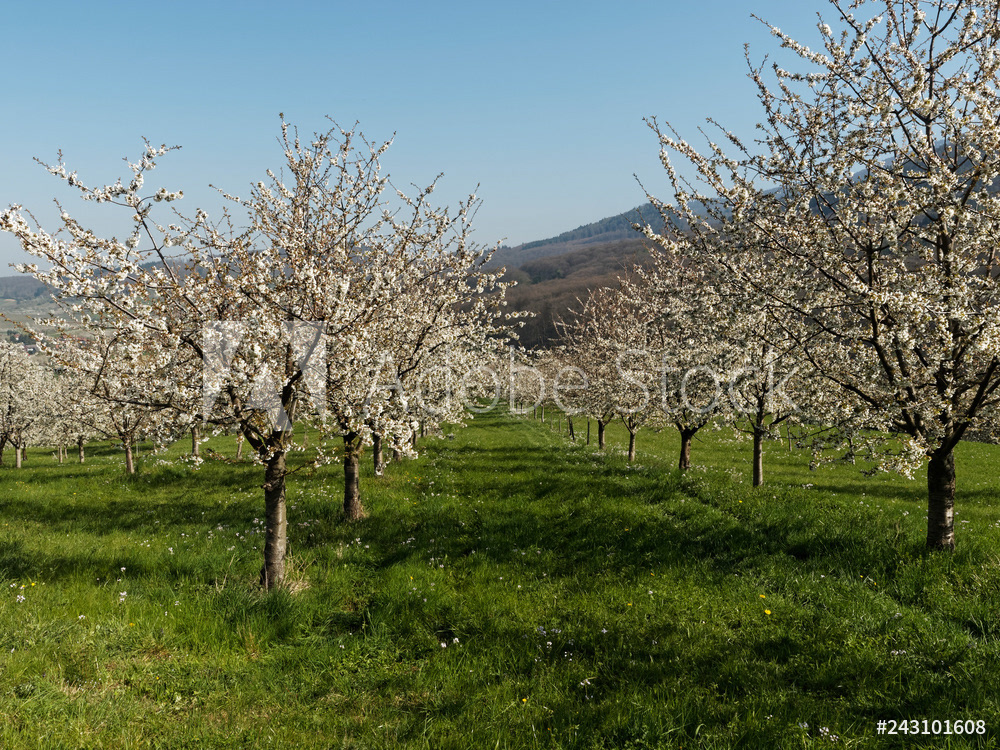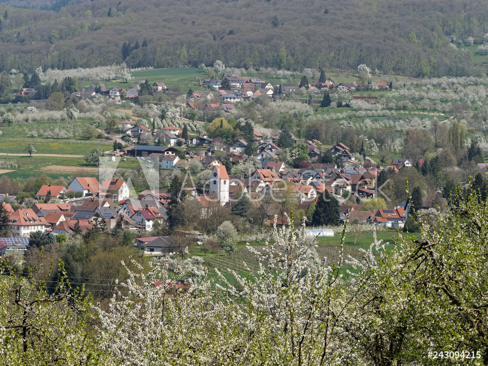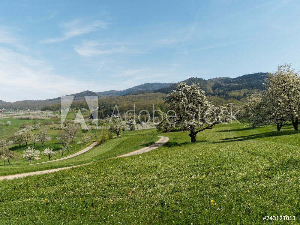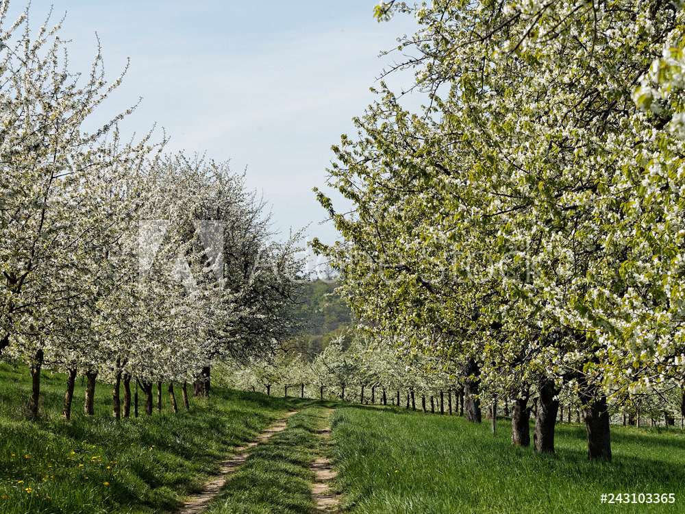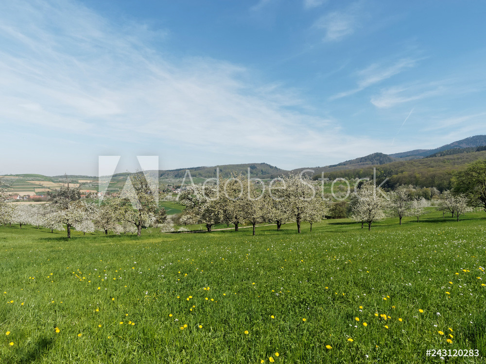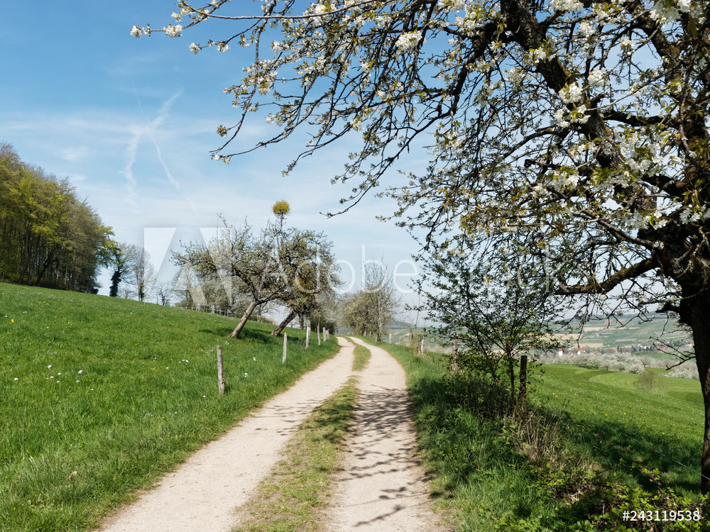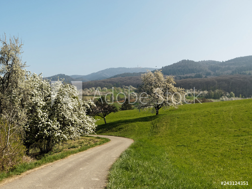 Obereggenen ein Teilort der Gemeinde Schliengen im oberen Eggenertal. Idyllischer Spazierweg zwischen Kirschblüten in einer Landschaft aus bewaldeten Hügeln und grünen Wiesen