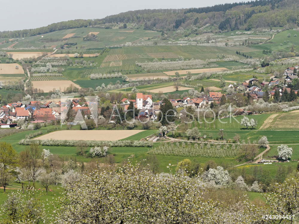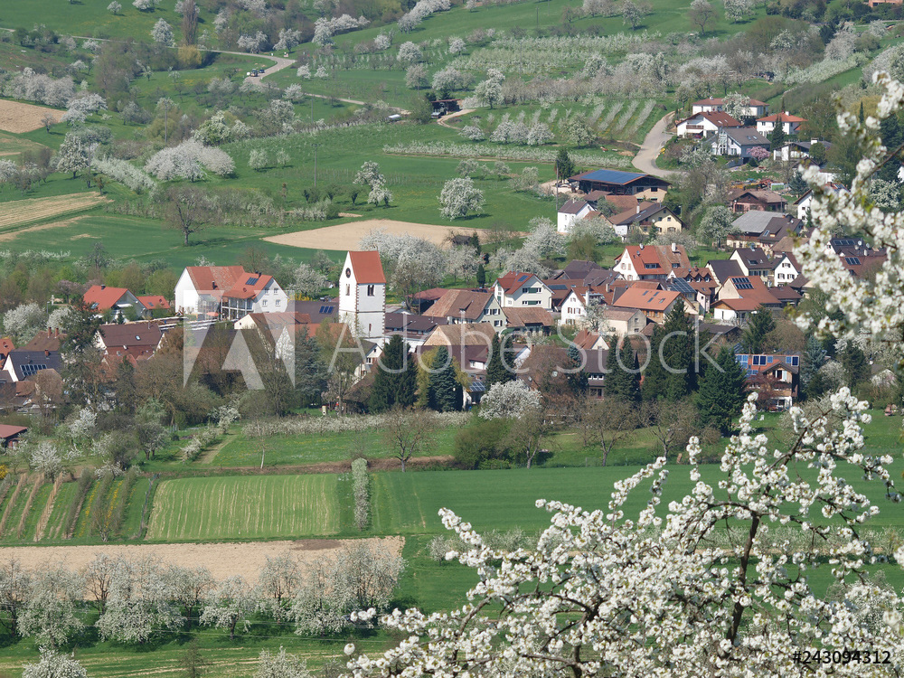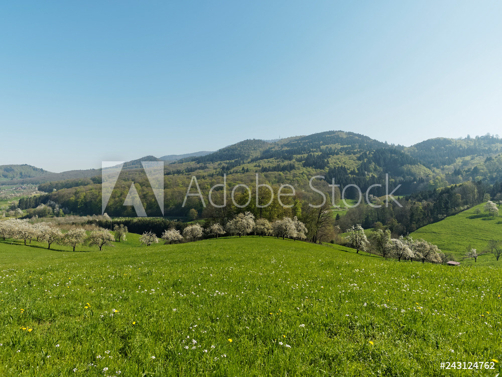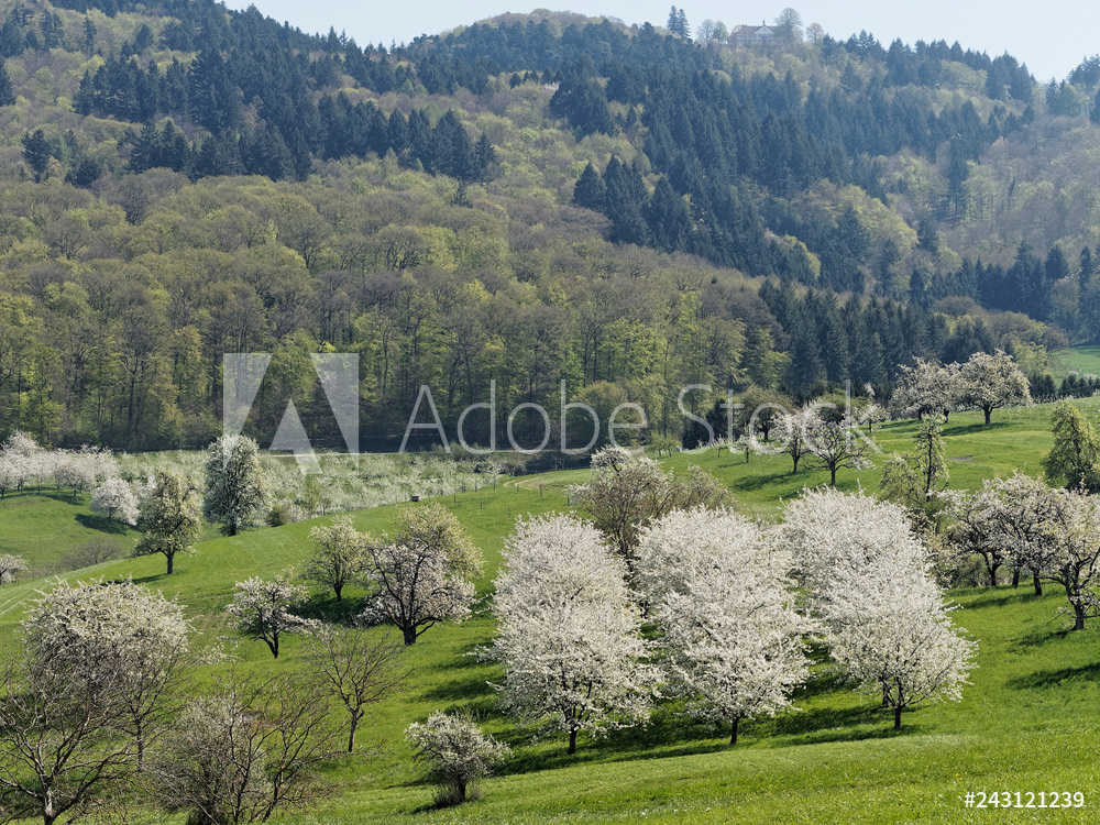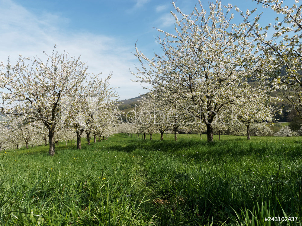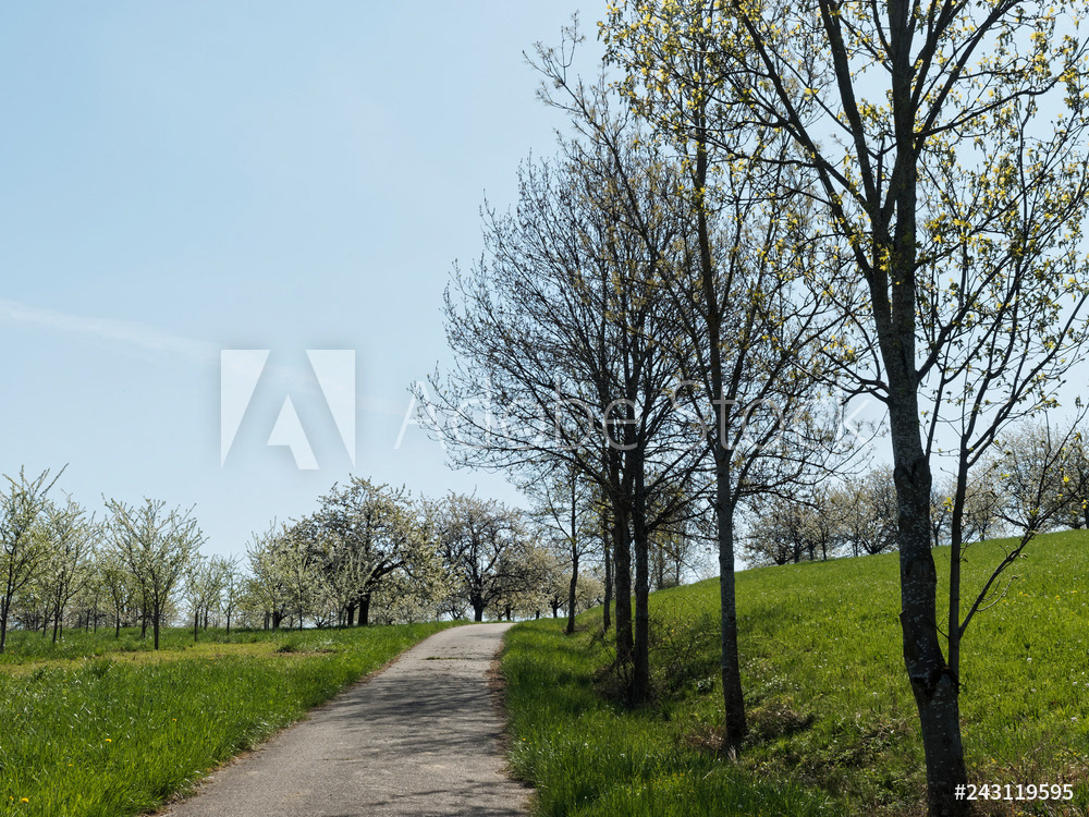 Obereggenen ein Teilort der Gemeinde Schliengen im oberen Eggenertal. Idyllischer Spazierweg zwischen Kirschblüten in einer Landschaft aus bewaldeten Hügeln und grünen Wiesen