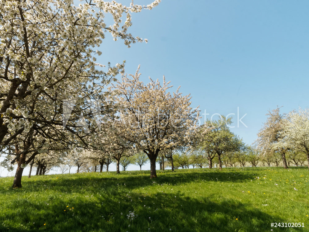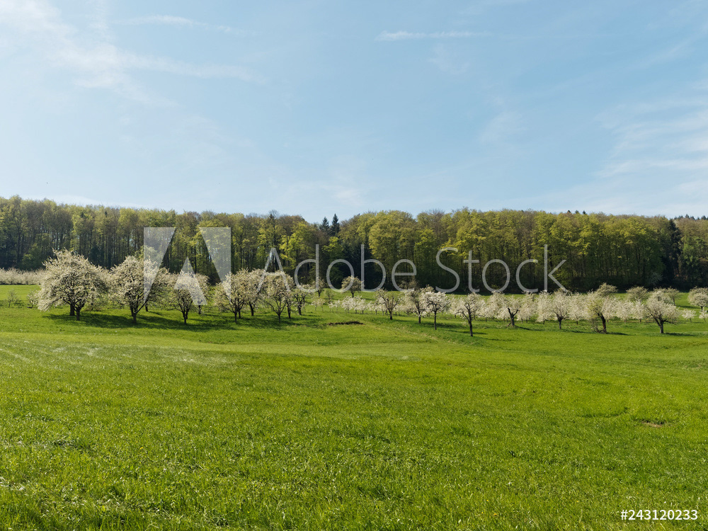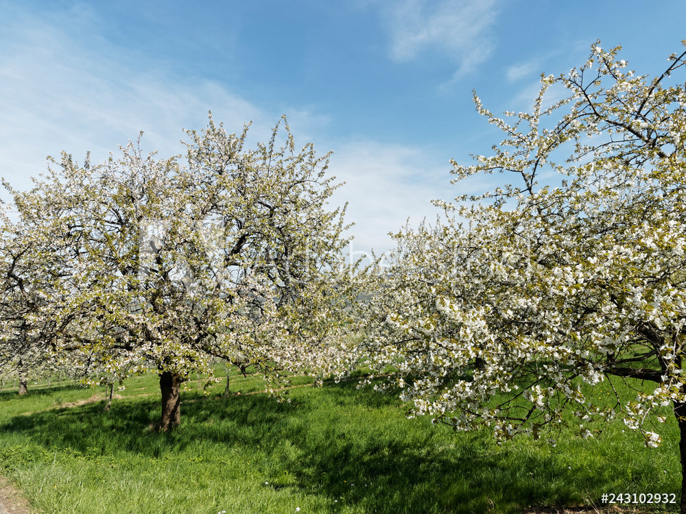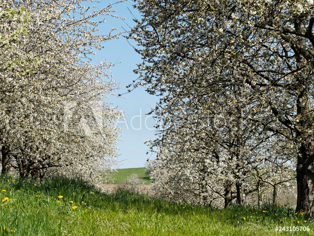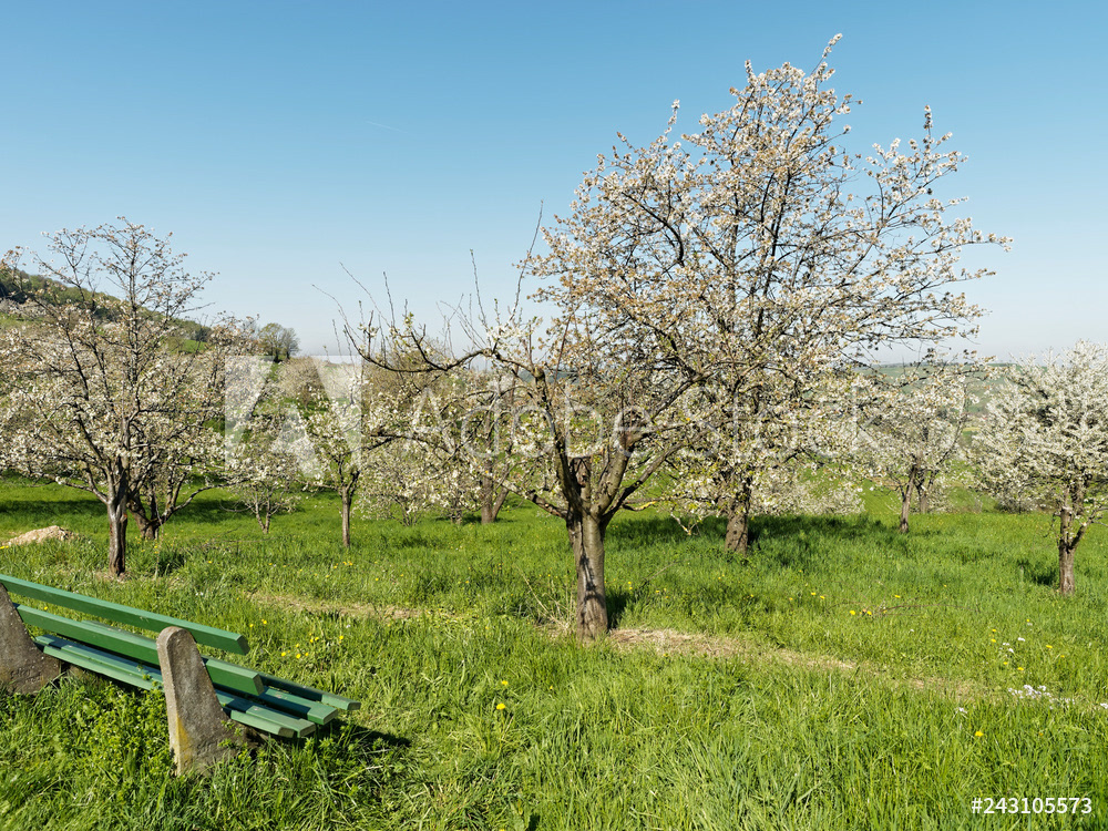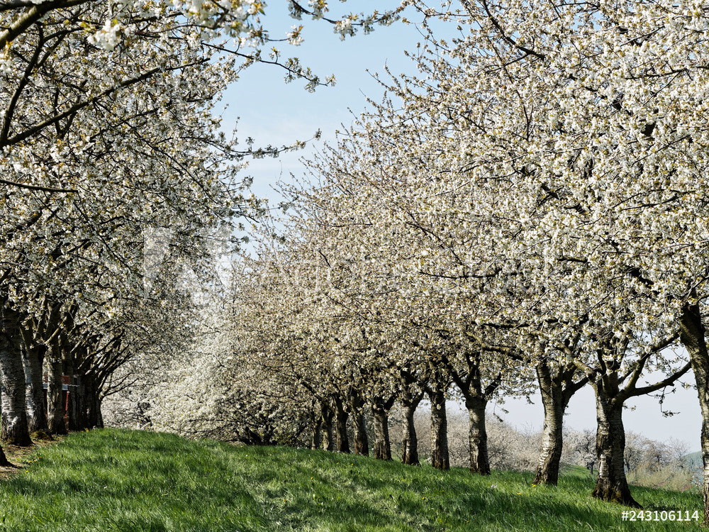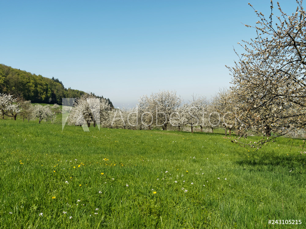 Obereggenen ein Teilort der Gemeinde Schliengen im oberen Eggenertal. Idyllischer Spazierweg zwischen Kirschblüten in einer Landschaft aus bewaldeten Hügeln und grünen Wiesen