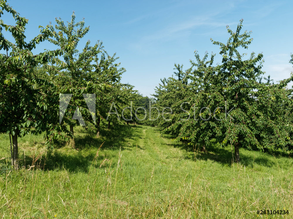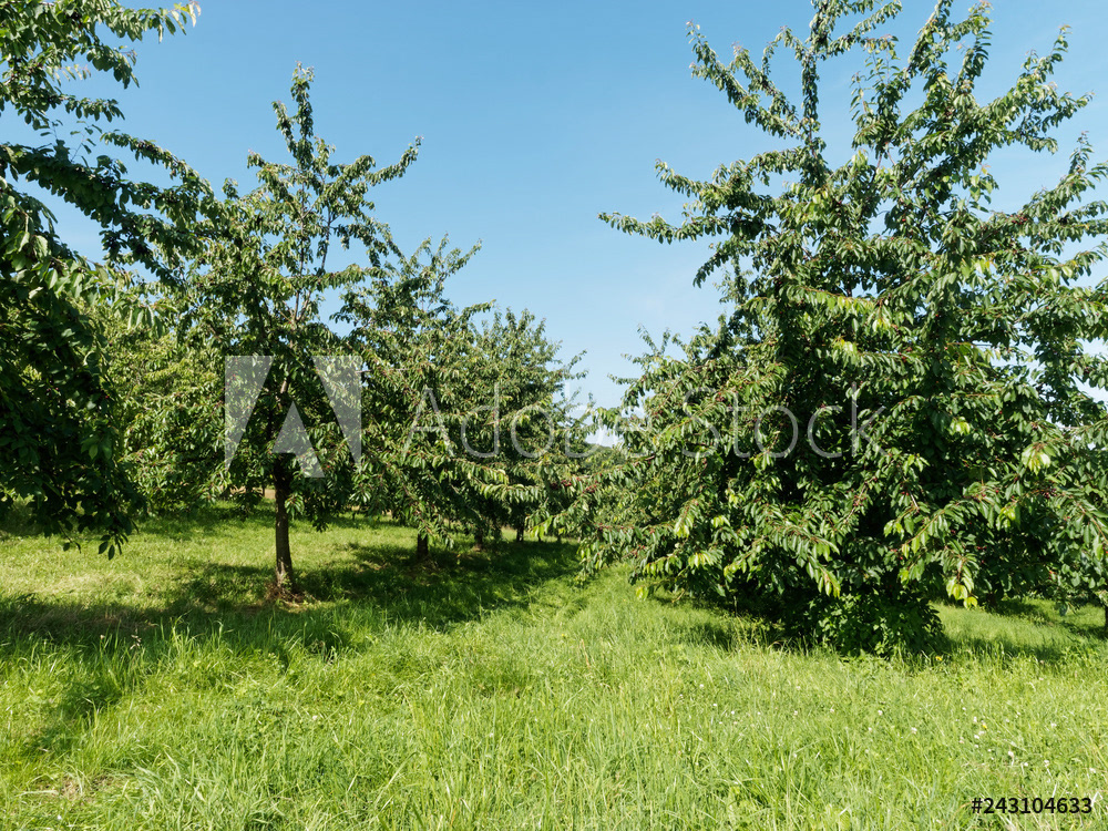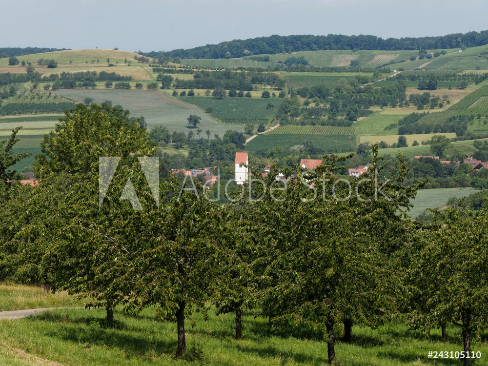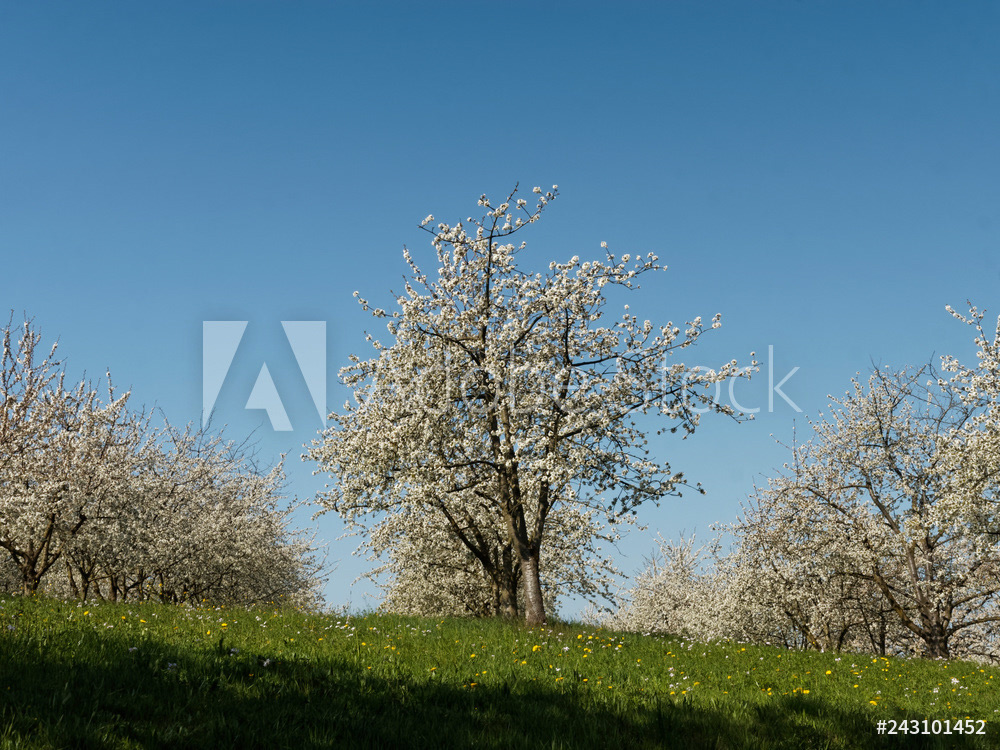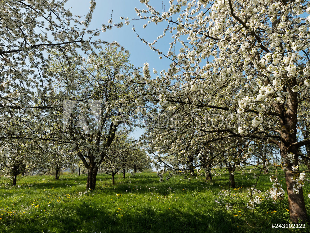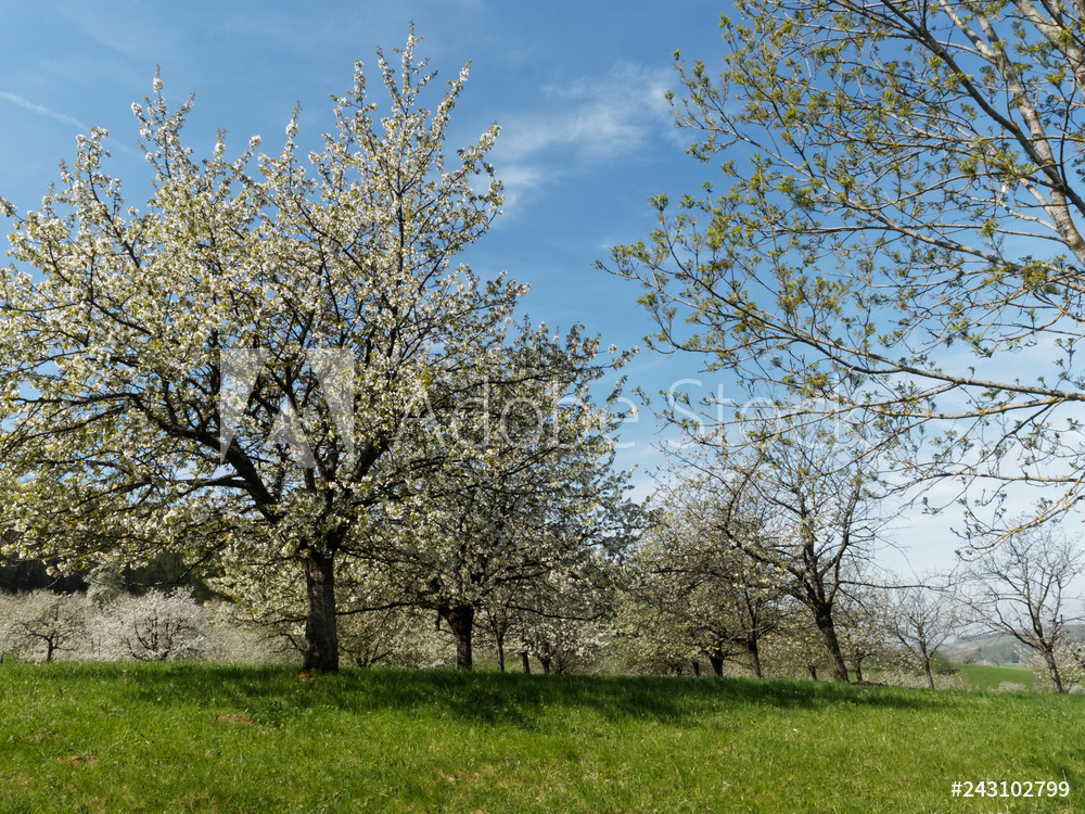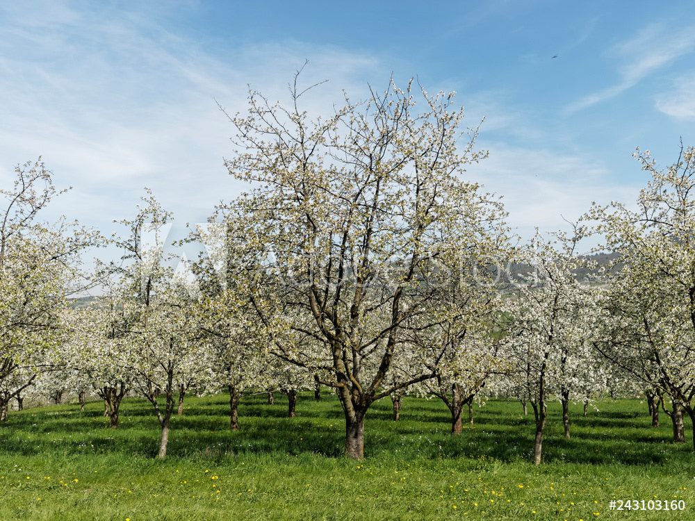 Obereggenen ein Teilort der Gemeinde Schliengen im oberen Eggenertal. Idyllischer Spazierweg zwischen Kirschblüten in einer Landschaft aus bewaldeten Hügeln und grünen Wiesen
