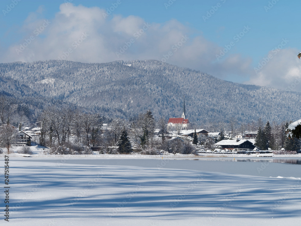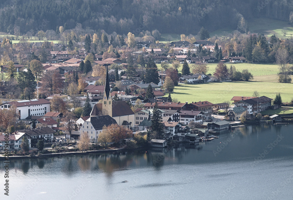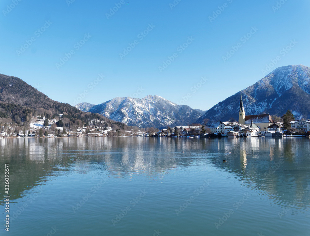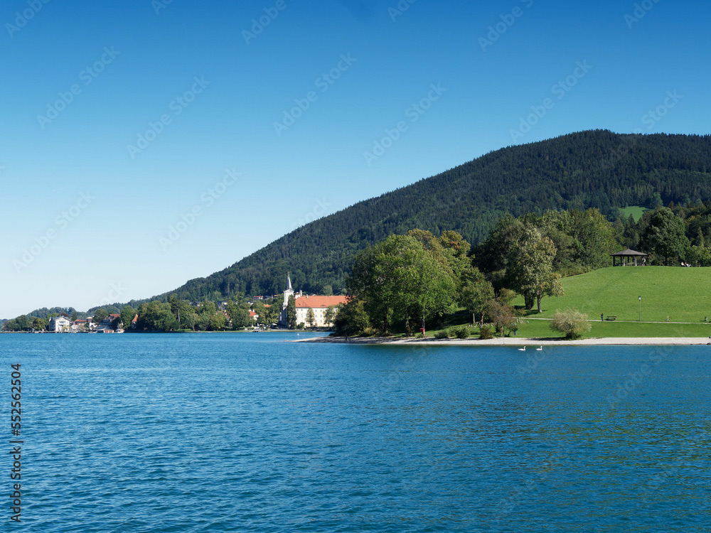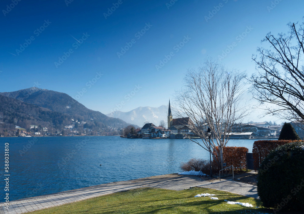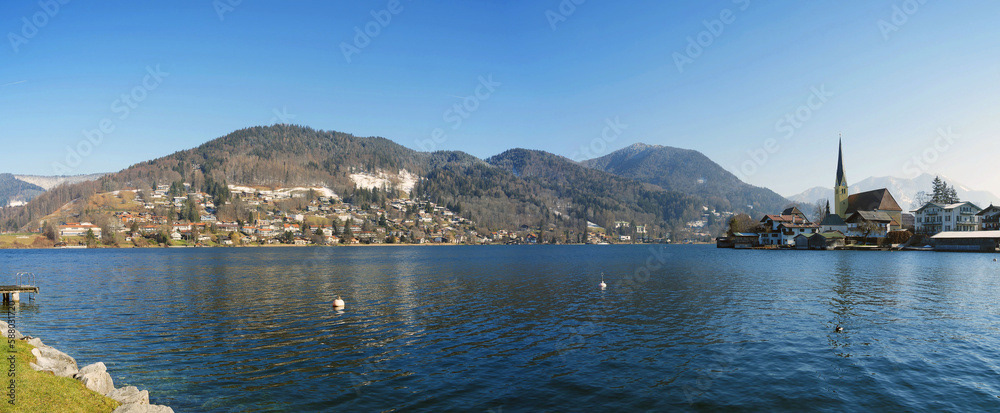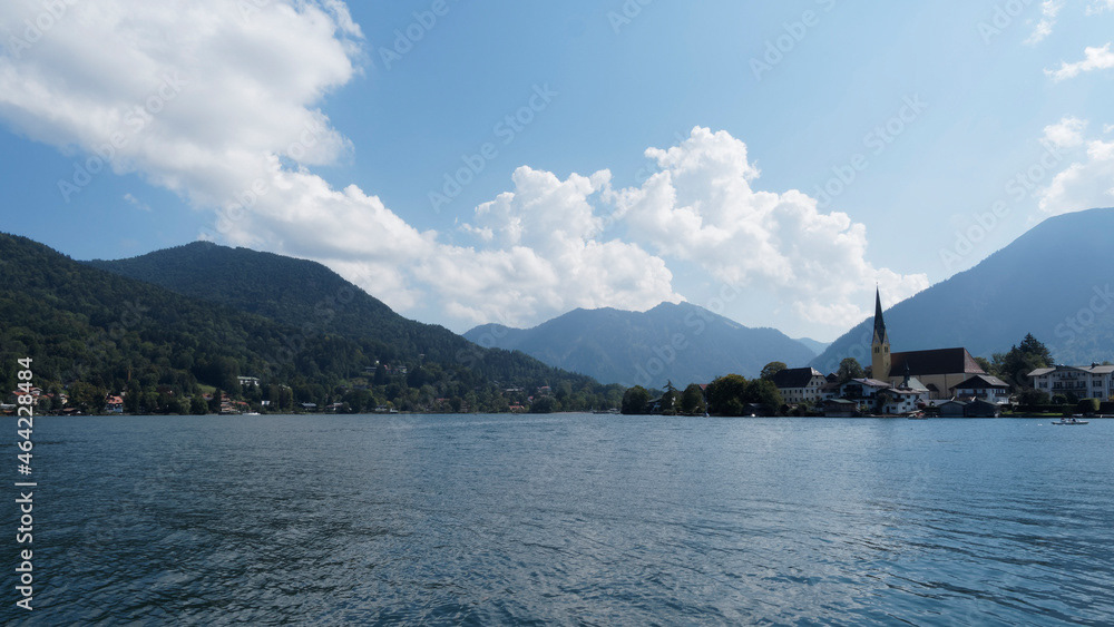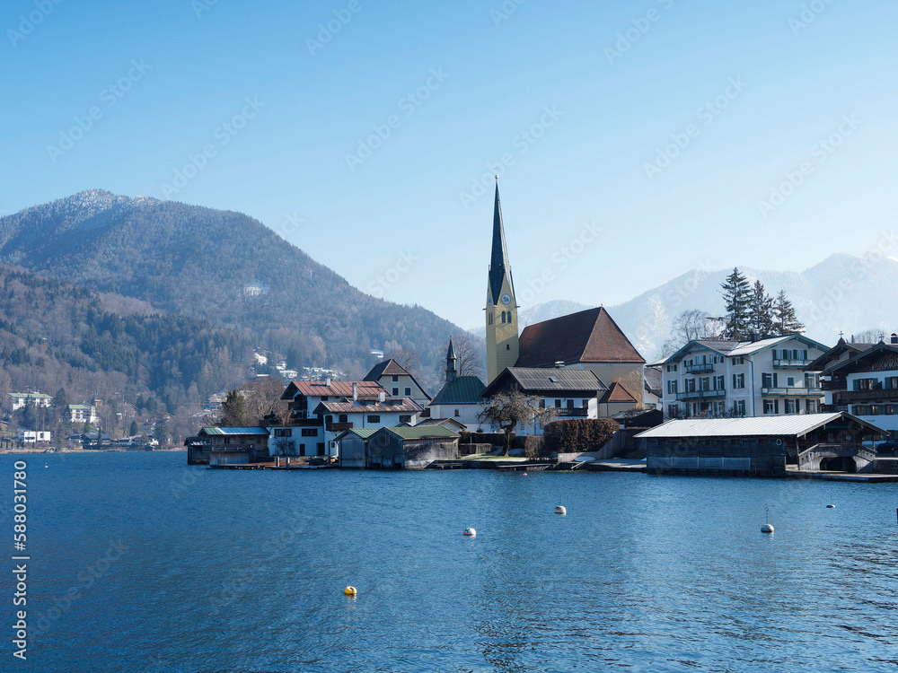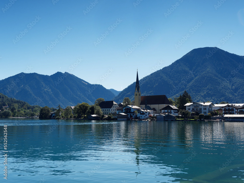Rottach-Egern am Südufer des Tegernsees umgeben von bezaubernden Landschaftenam Fuß des Wallbergs. Eine idyllische Kirche mit Blick auf die Bayerischen Gipfel