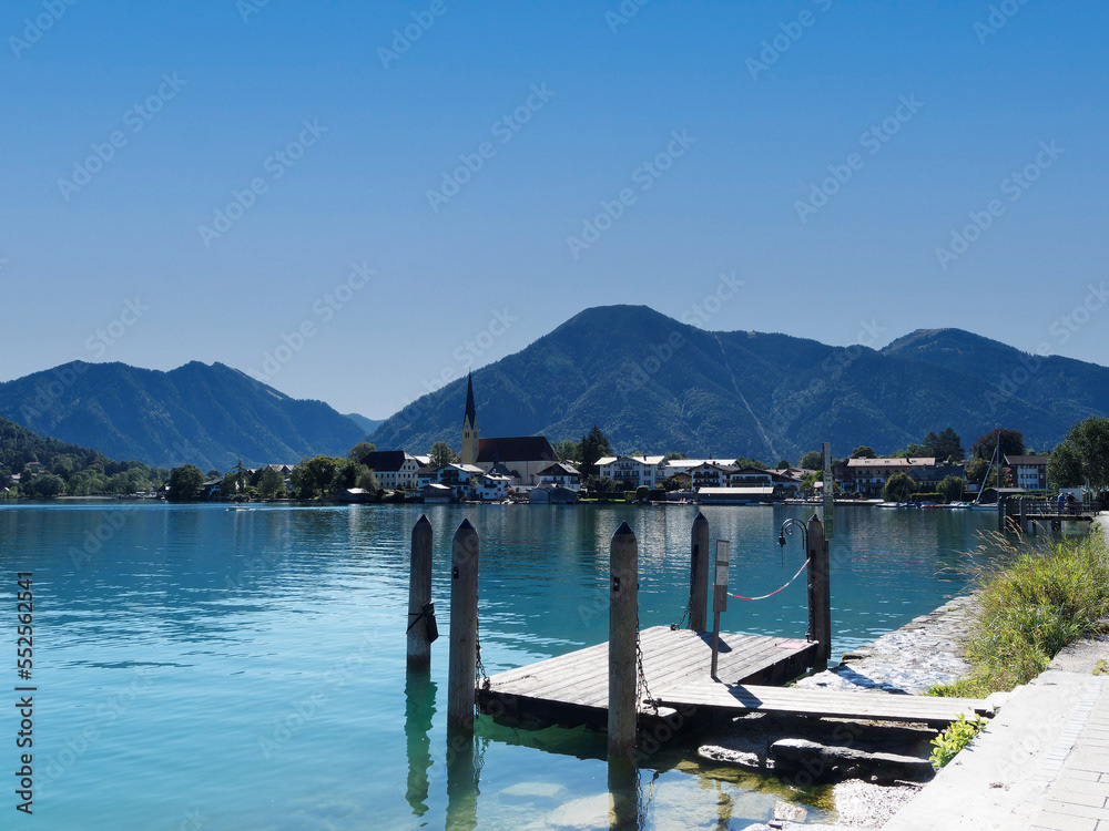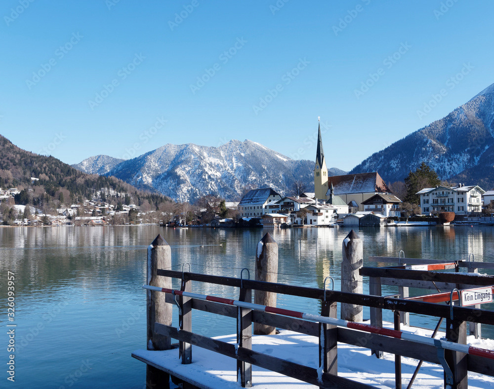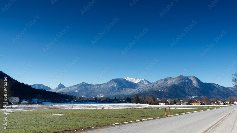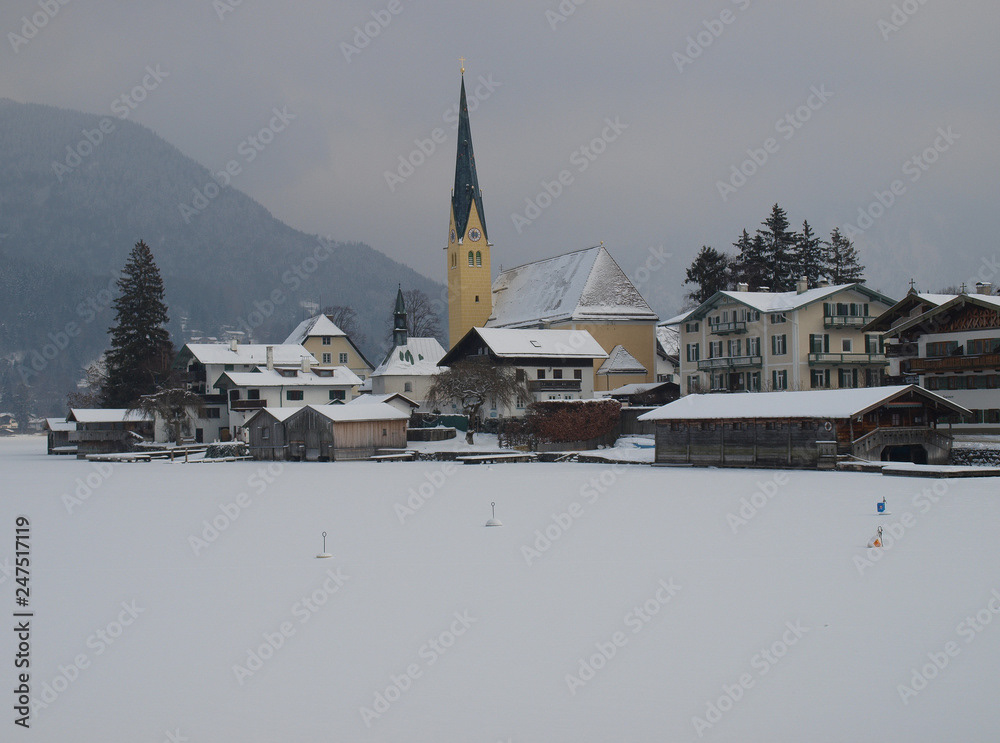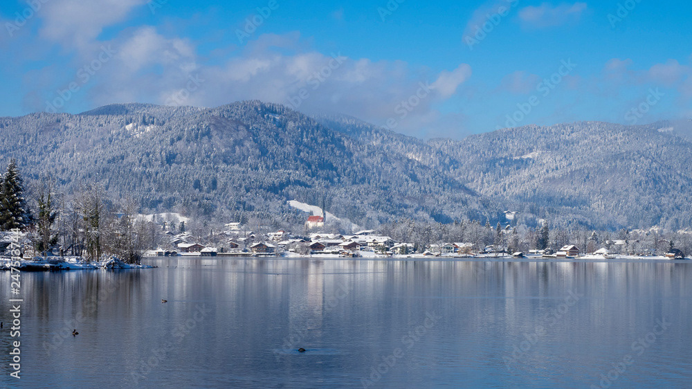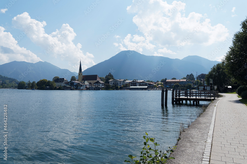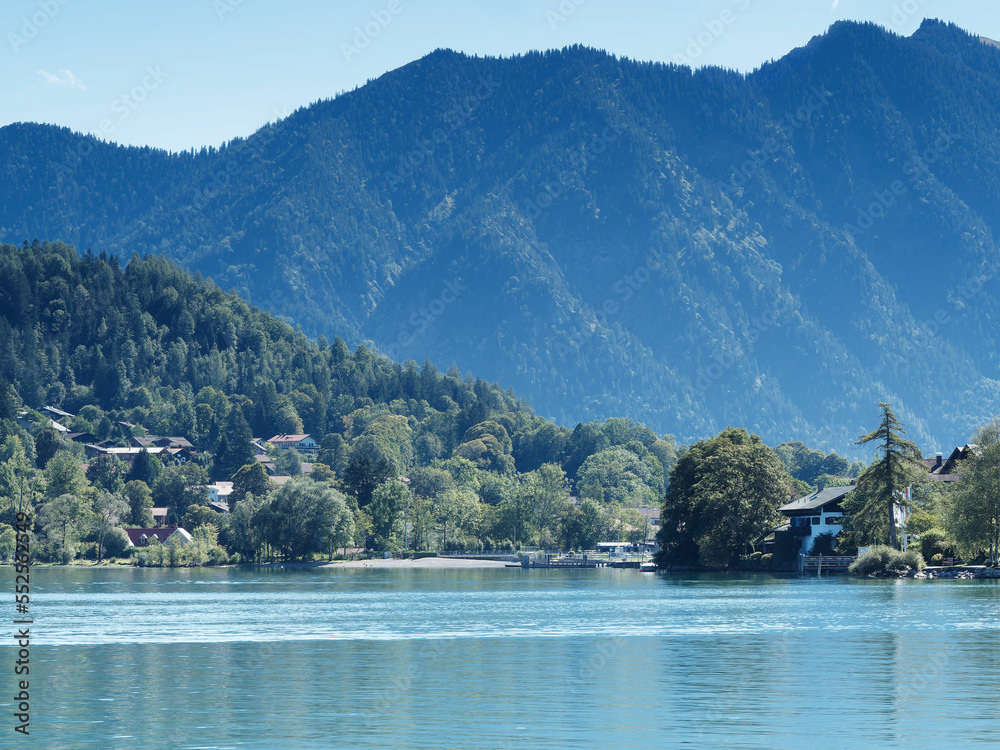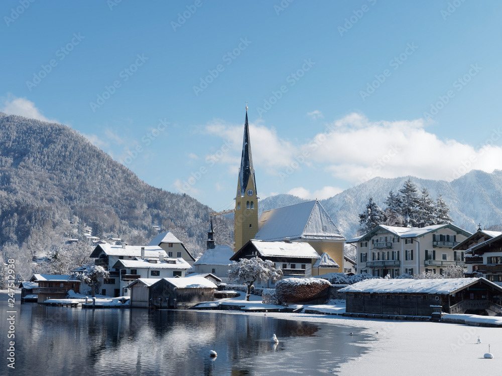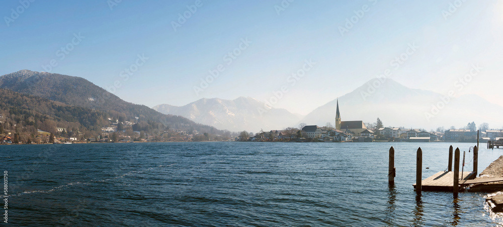 Rottach-Egern am Südufer des Tegernsees umgeben von bezaubernden Landschaftenam Fuß des Wallbergs. Eine idyllische Kirche mit Blick auf die Bayerischen Gipfel