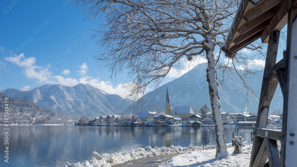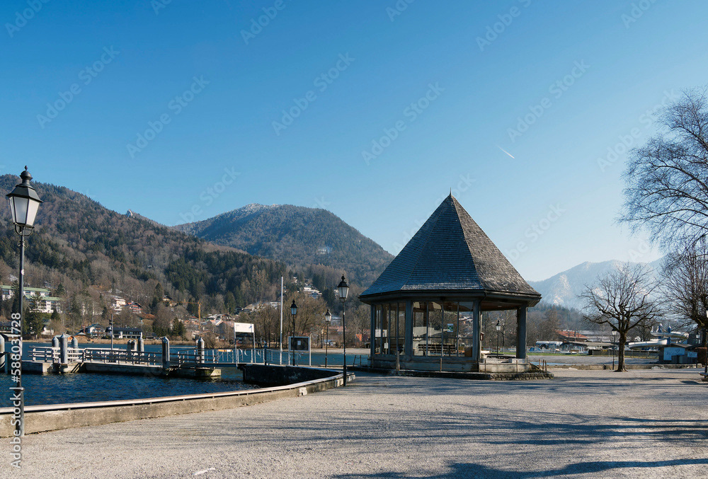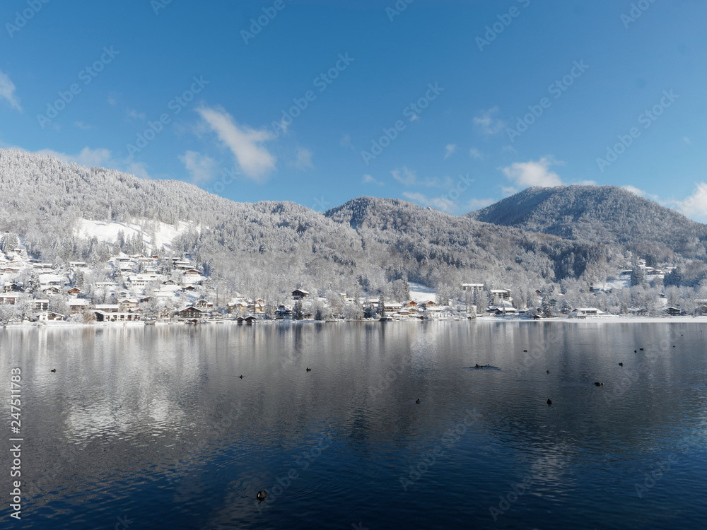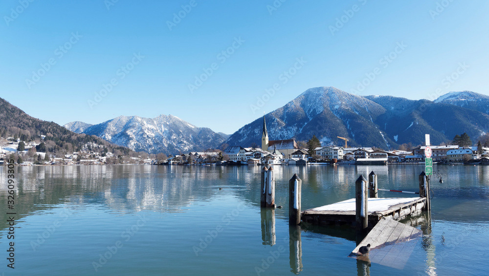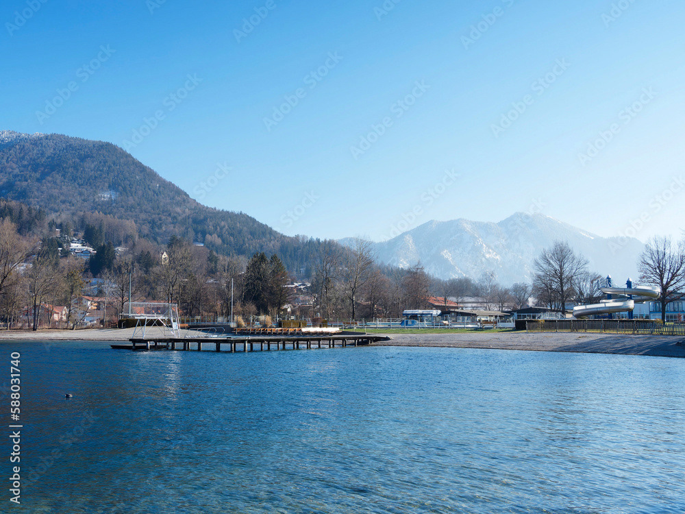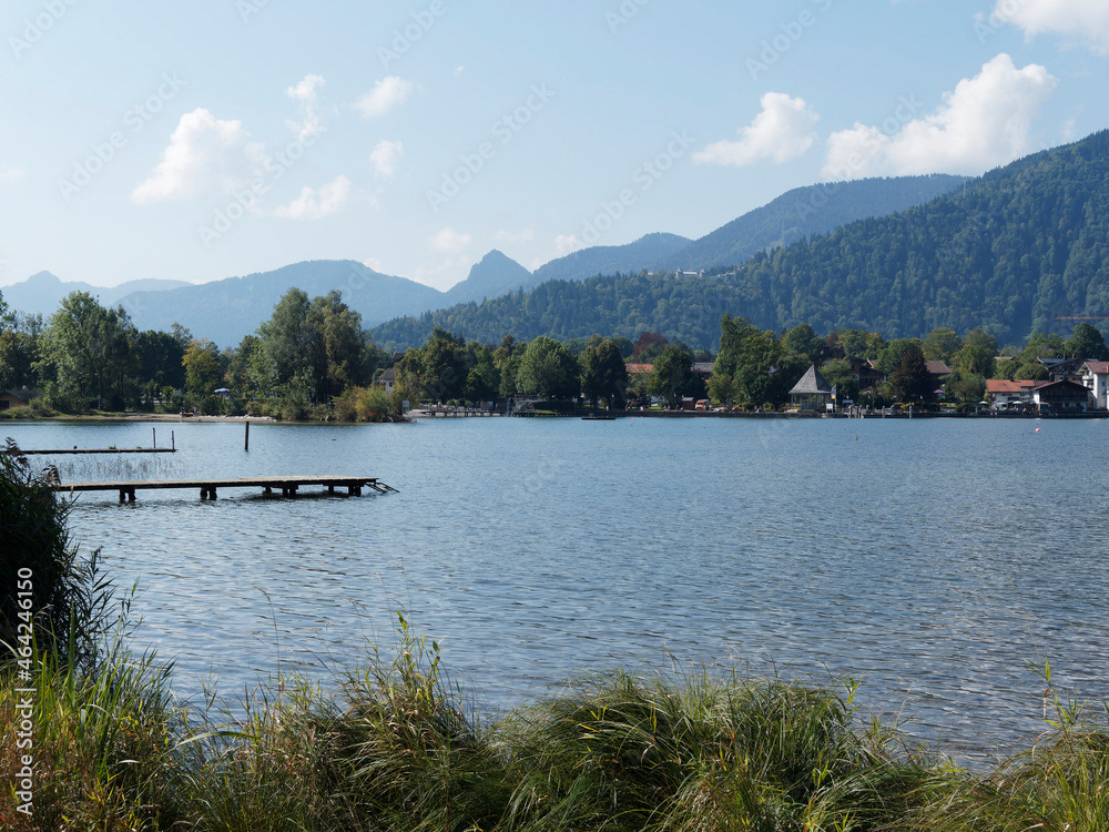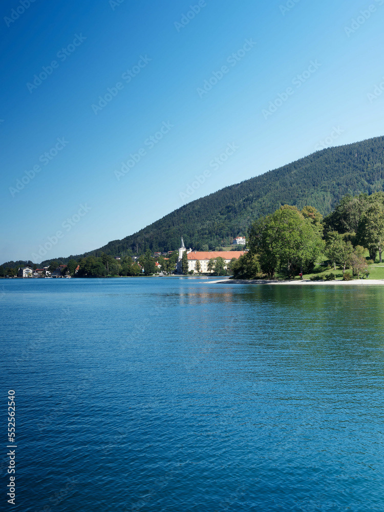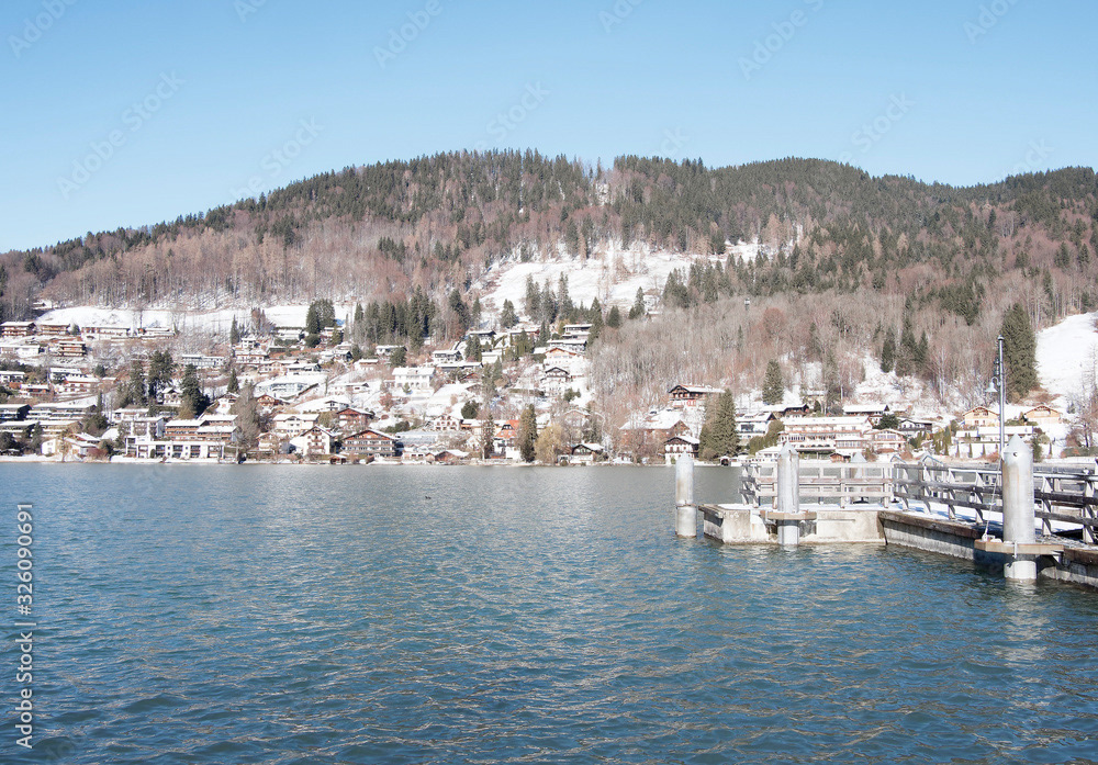 Rottach-Egern am Südufer des Tegernsees umgeben von bezaubernden Landschaftenam Fuß des Wallbergs. Eine idyllische Kirche mit Blick auf die Bayerischen Gipfel