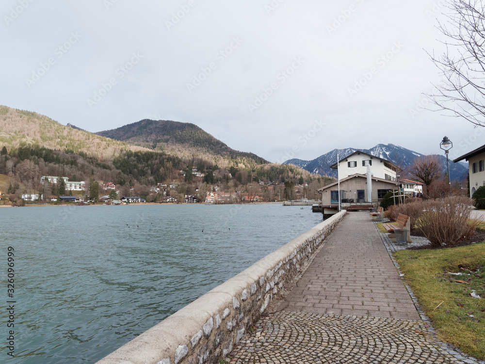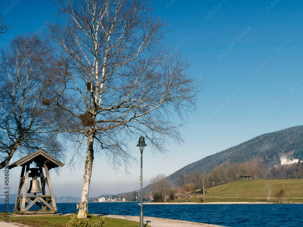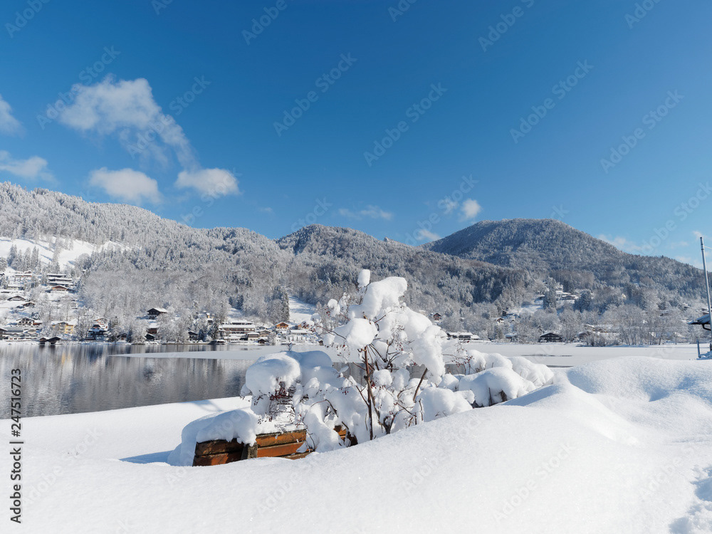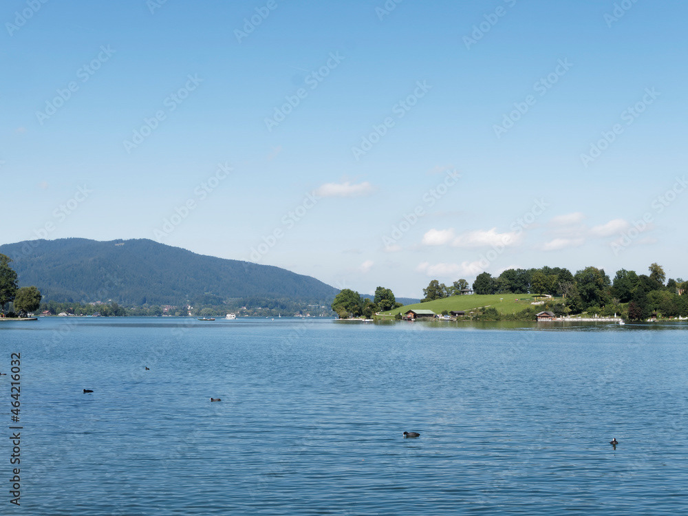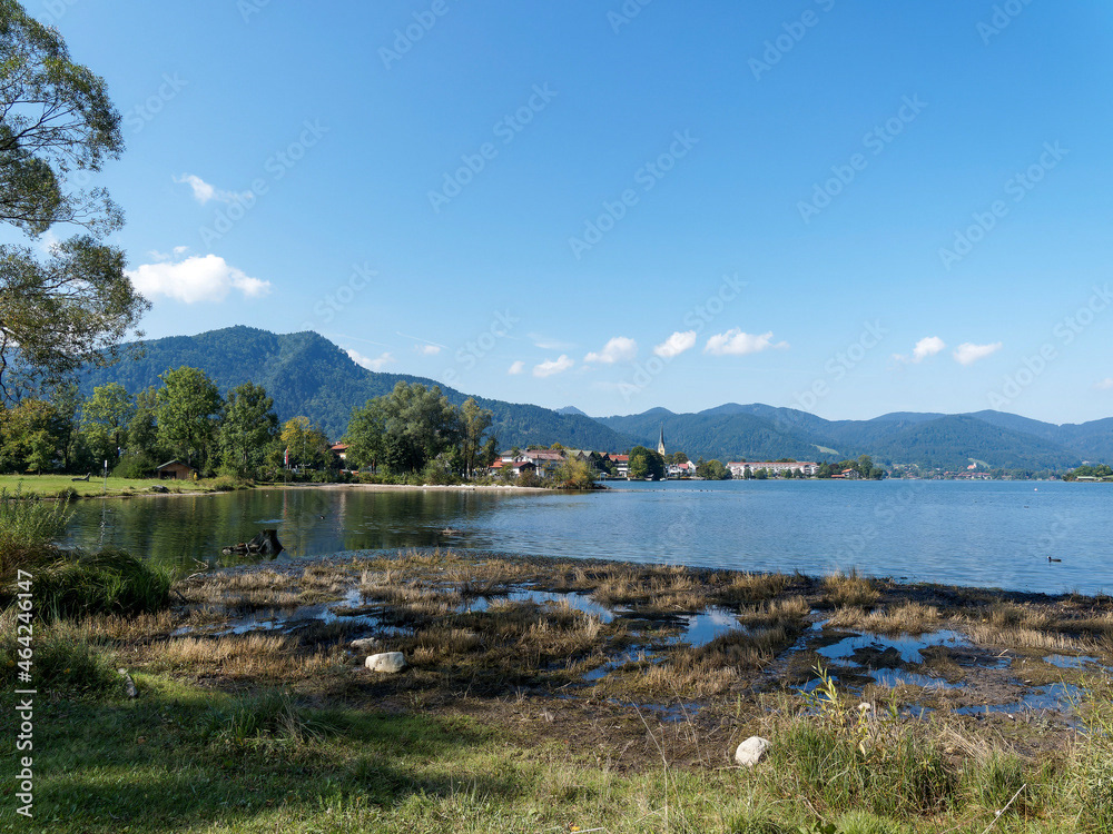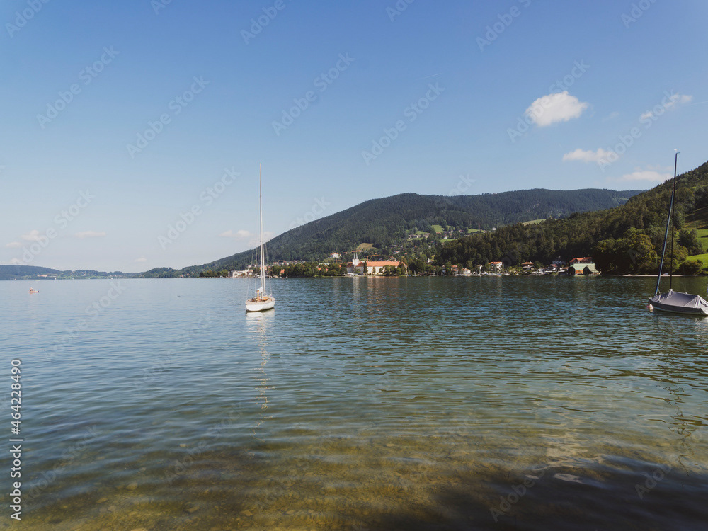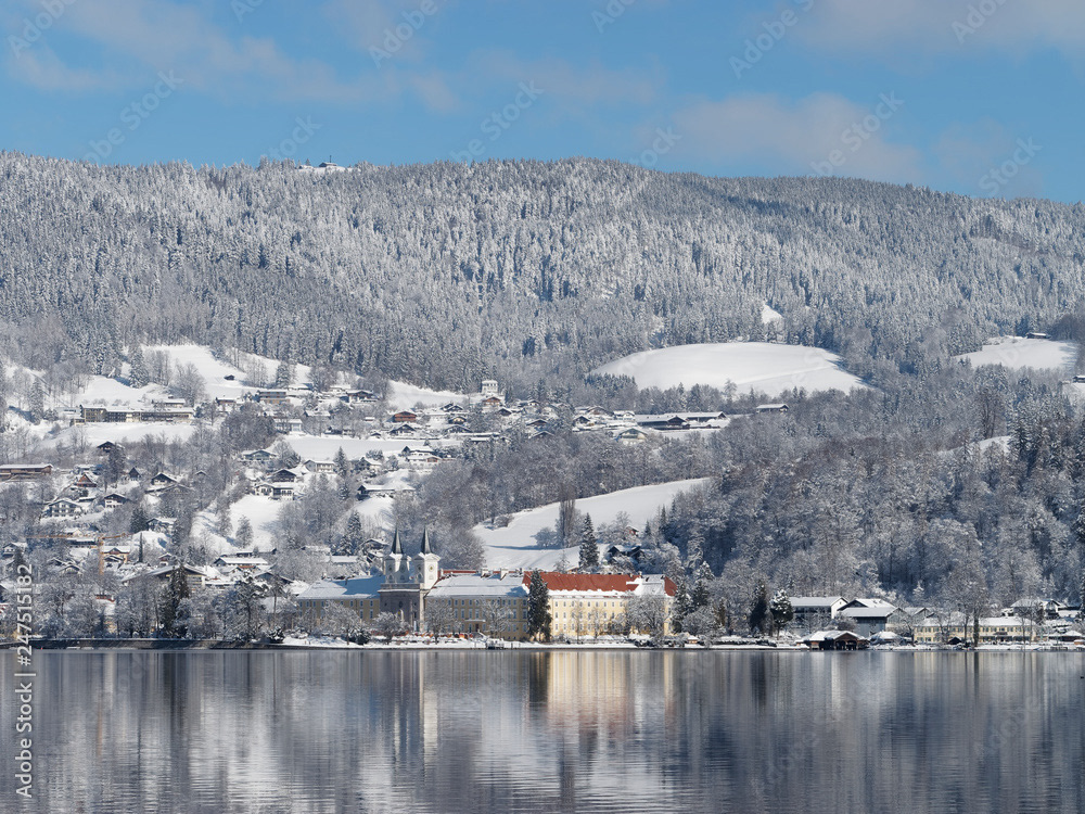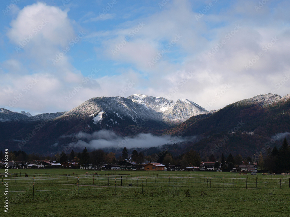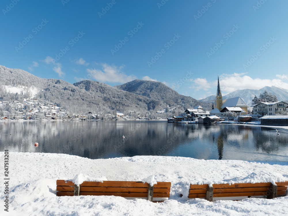 Rottach-Egern am Südufer des Tegernsees umgeben von bezaubernden Landschaftenam Fuß des Wallbergs. Eine idyllische Kirche mit Blick auf die Bayerischen Gipfel