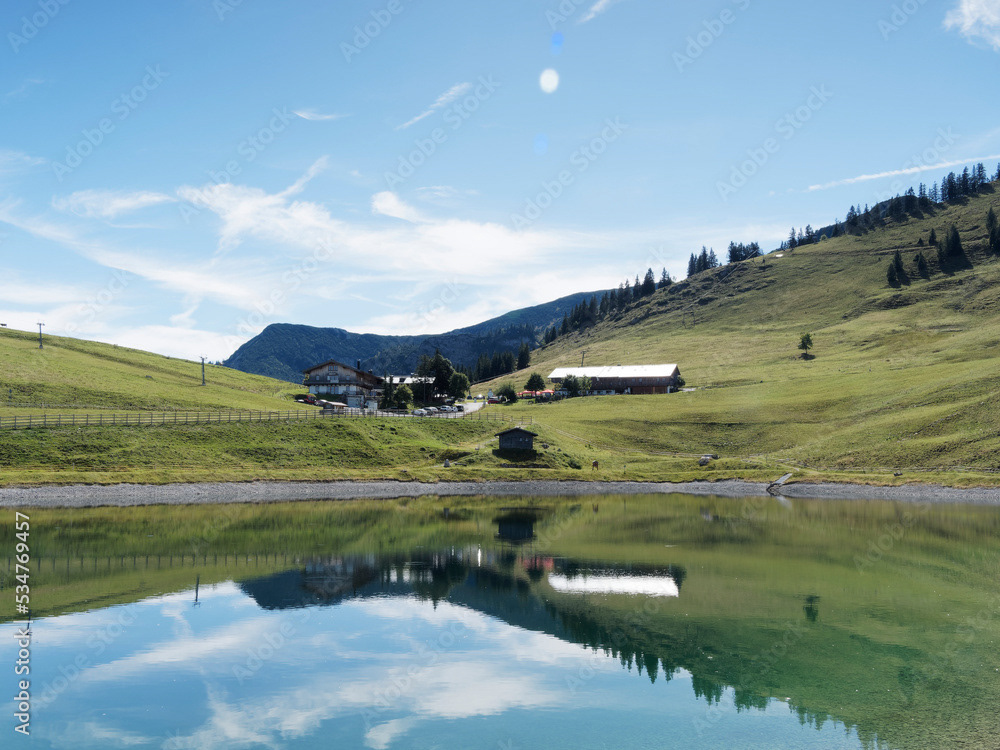 Ein wunderschöner Berg Speichersee "Walleralm" umgeben von grünen Wiesen im Sommer mit traumhaften Blick der Gipfel des Wendensteins am Horizont
